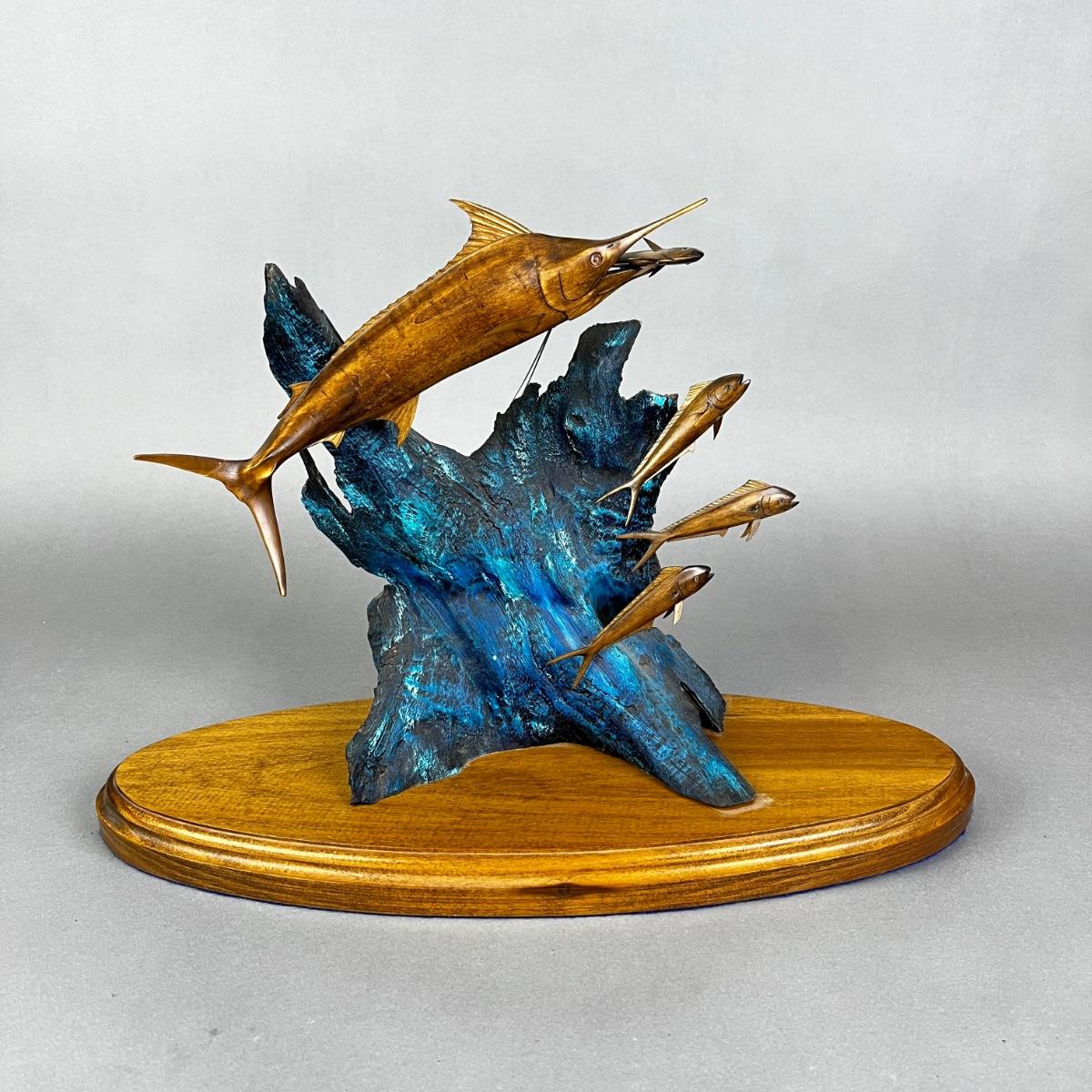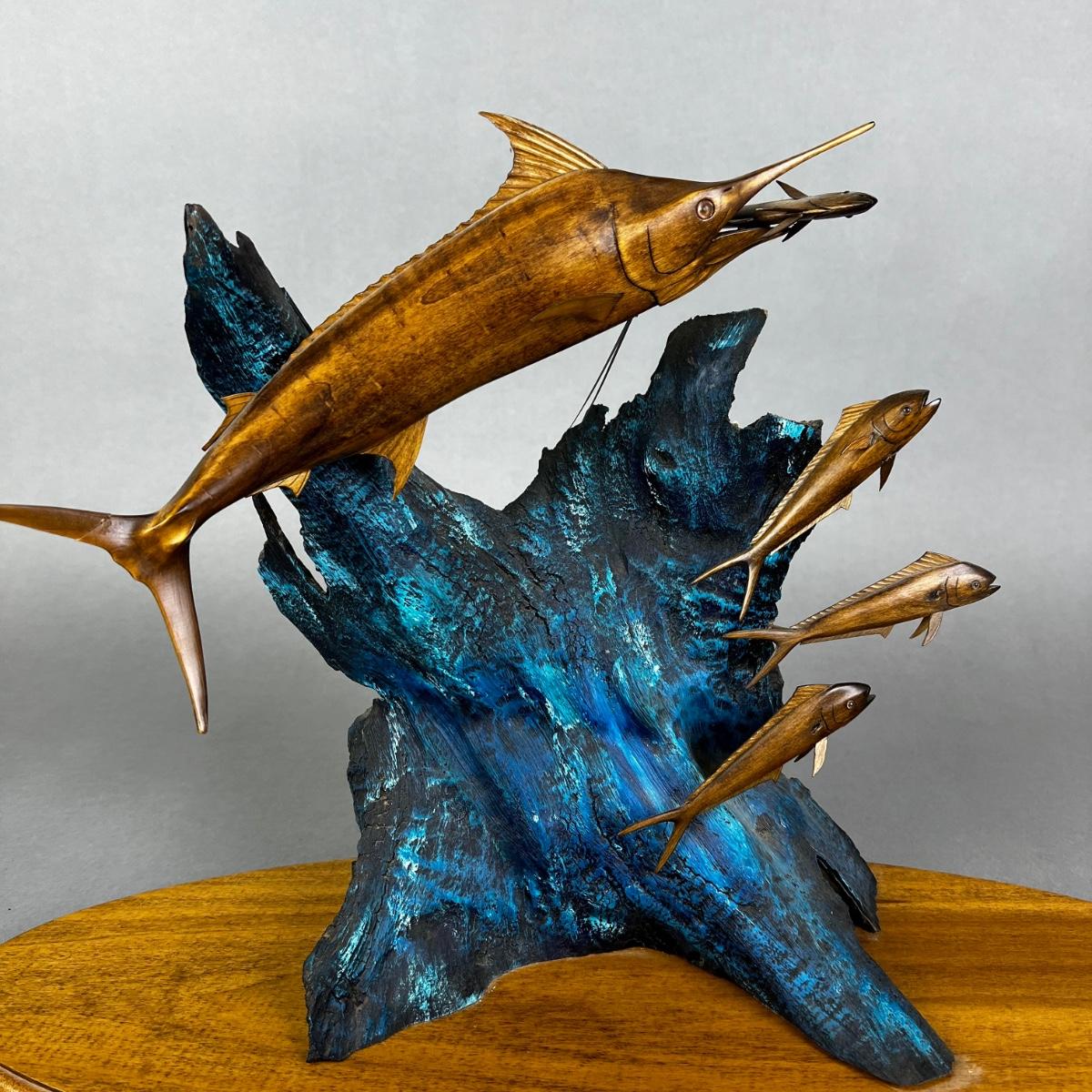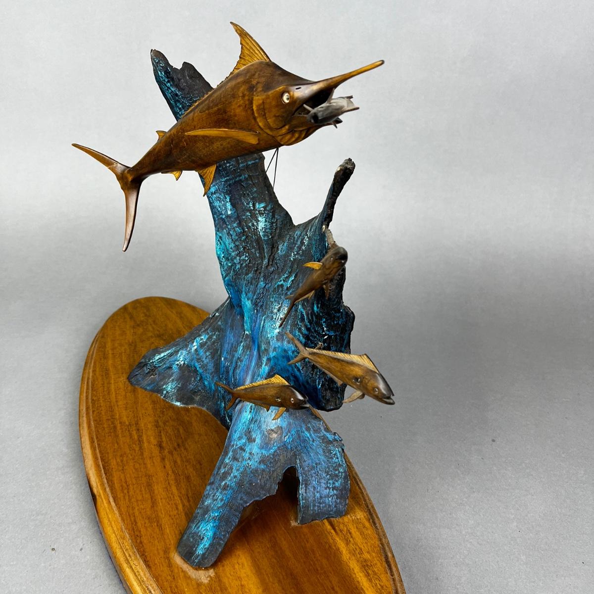 hand carved marlin and tuna fishing mount with painted driftwood background. Tail fin of marlin was repaired.