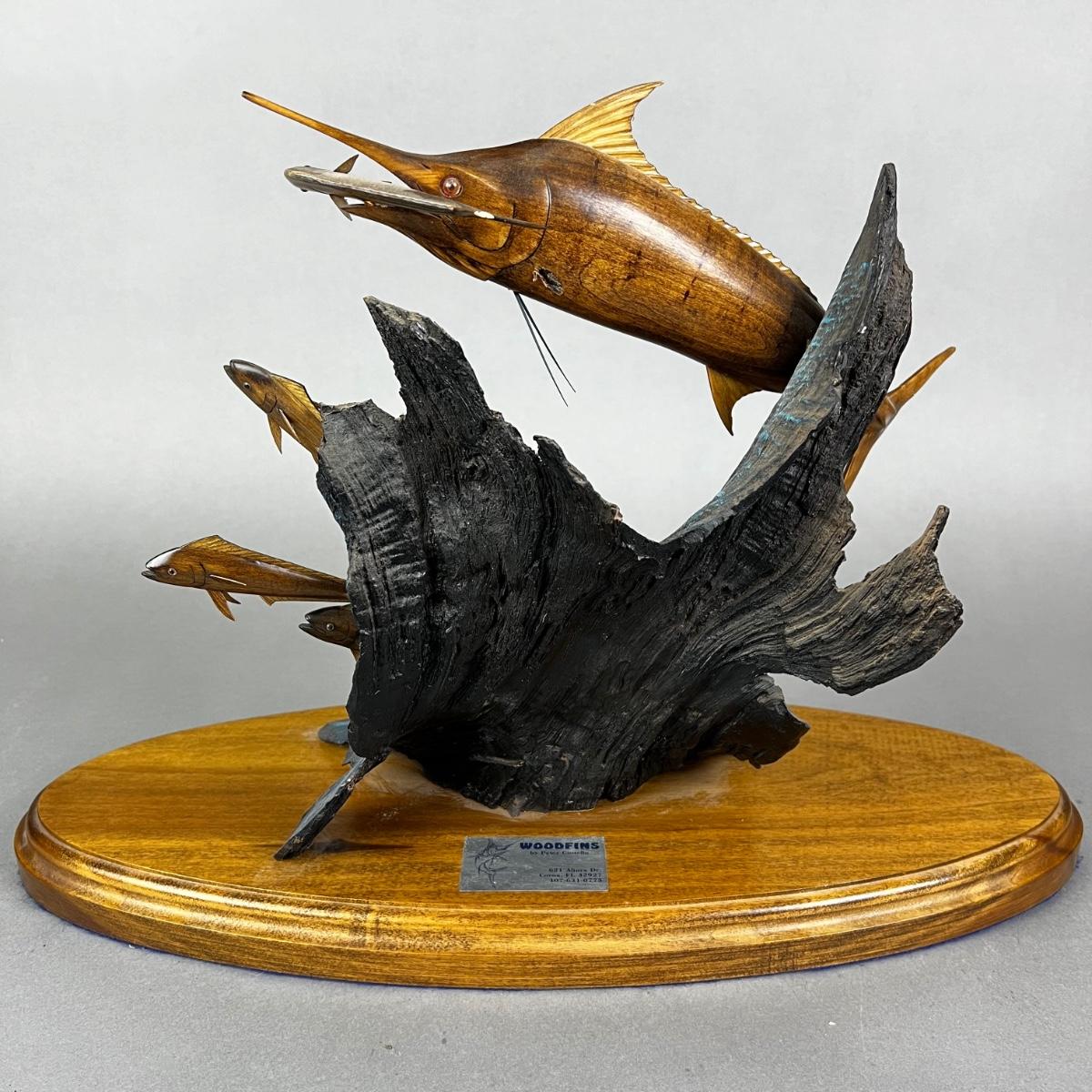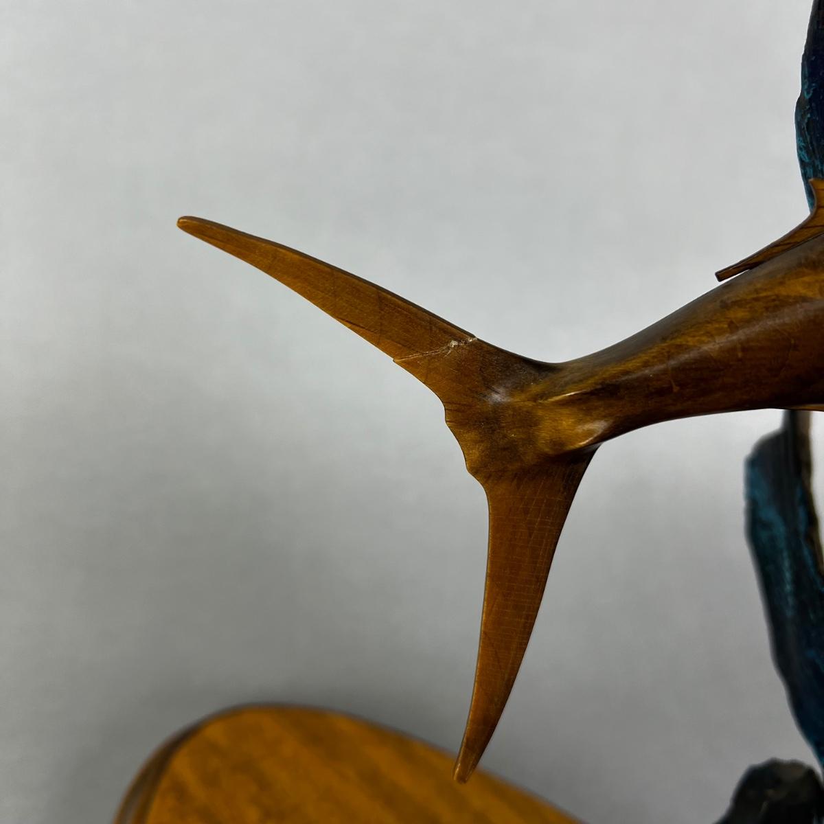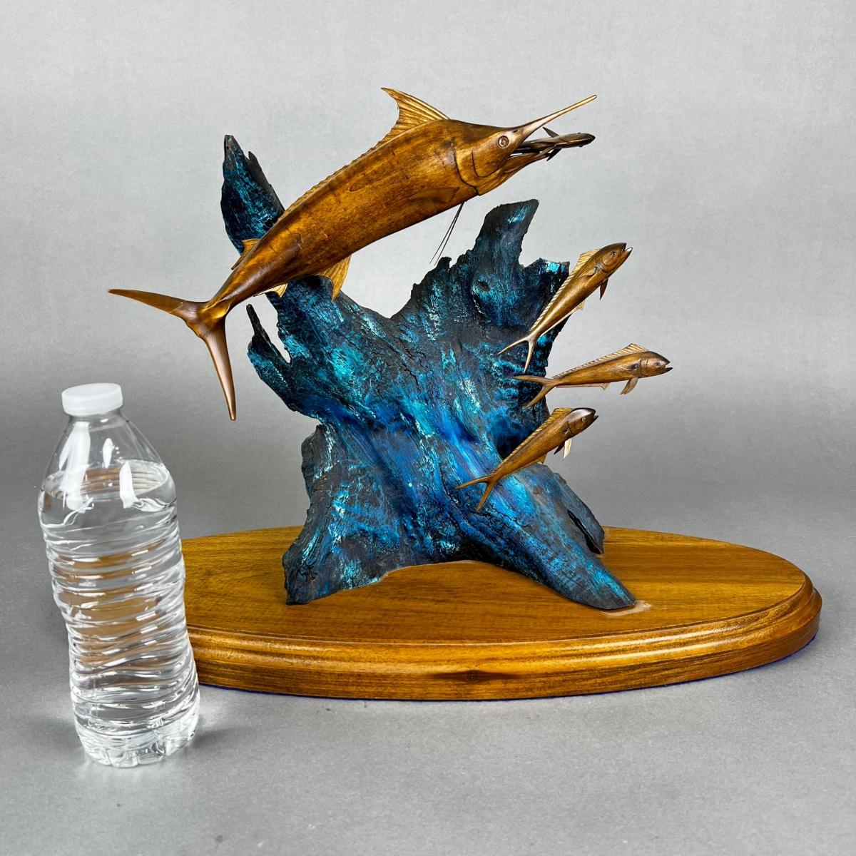 hand carved marlin and tuna fishing mount with painted driftwood background. Tail fin of marlin was repaired.