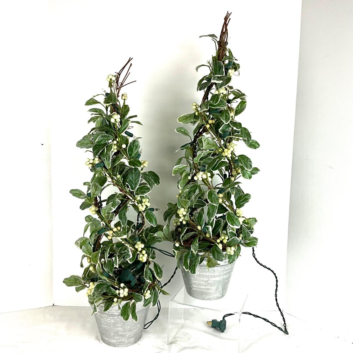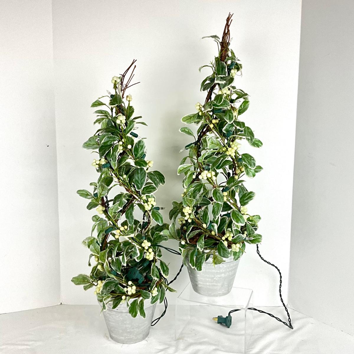 658 PAIR of Lighted Faux Variegated Green Berry Topiary Trees