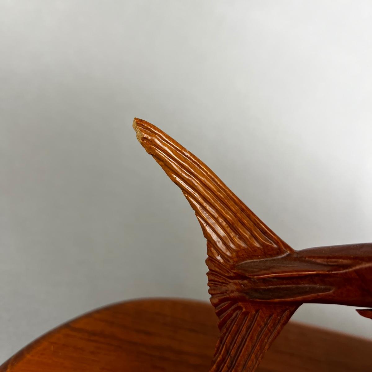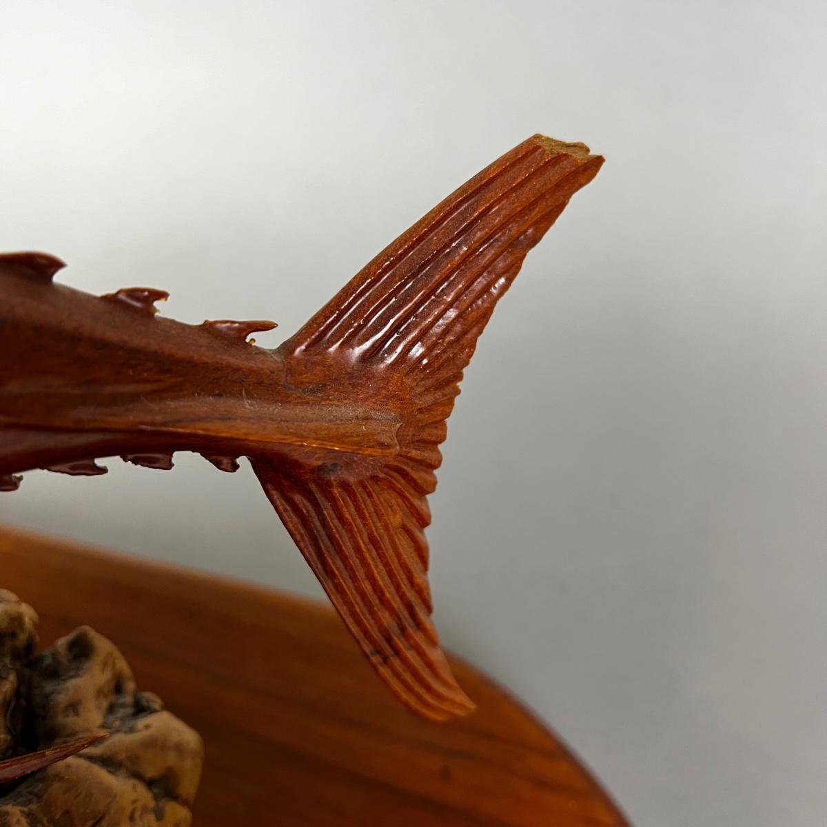 Hand carved fishing mount signed on the back of mount. There are some broken pieces to the fins (see photos). Could not find information on the artist.