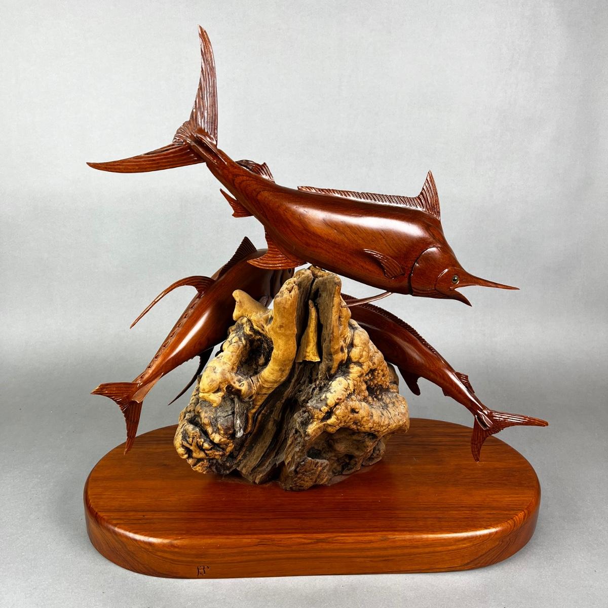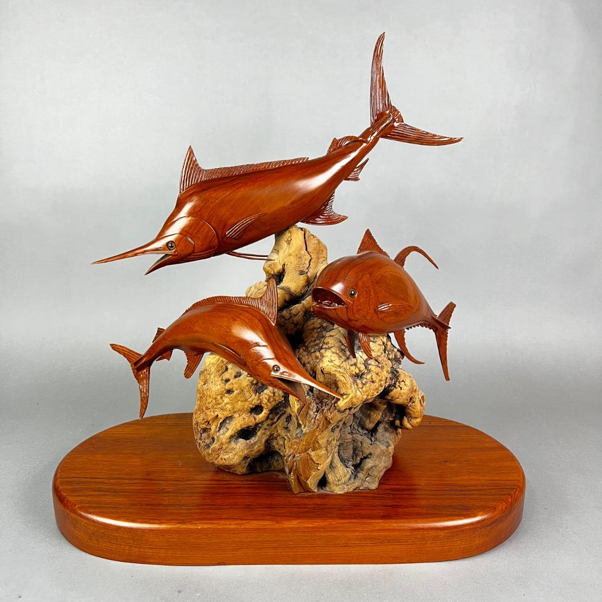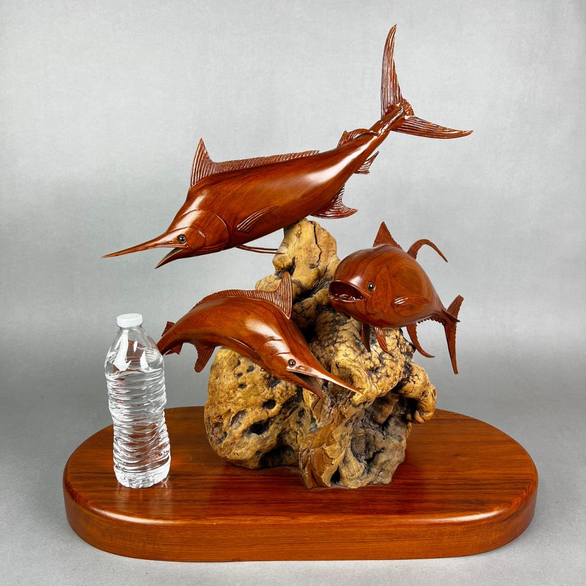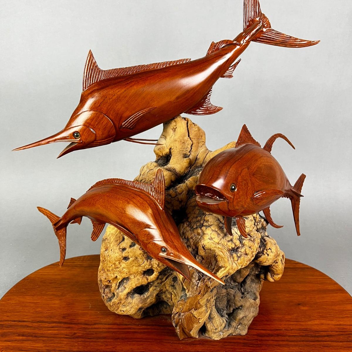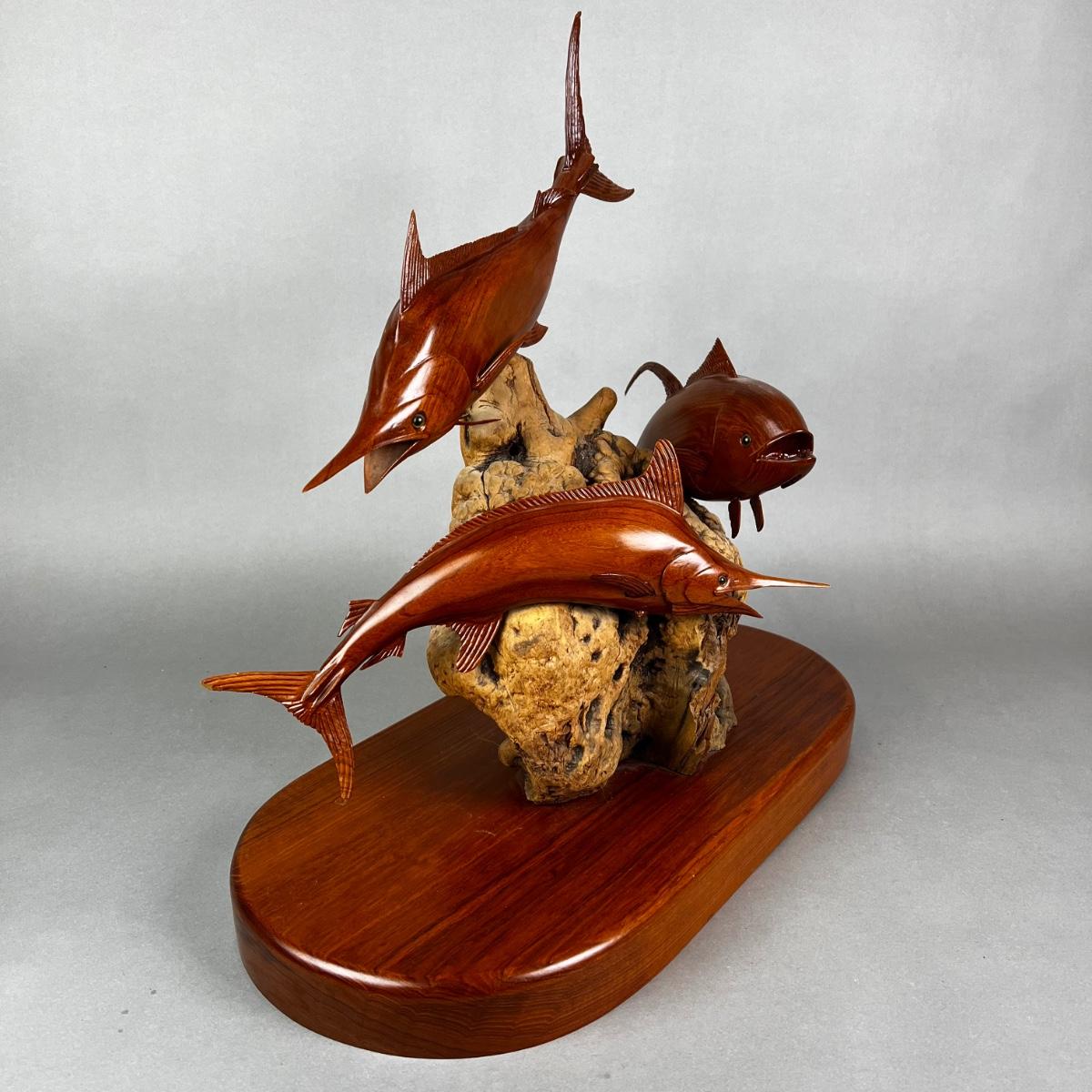658 Signed Hand Carved Marlin & Tuna Fishing Mount