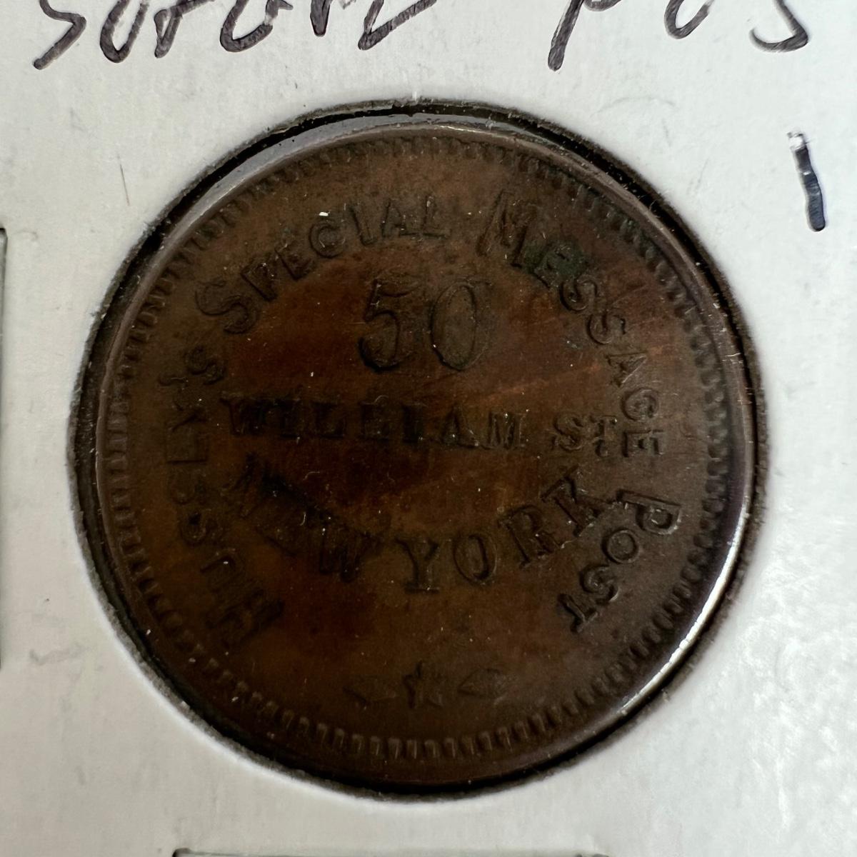 1863 Civil War Time Business Token Hussy's Special Message Post. 50 William St New York.