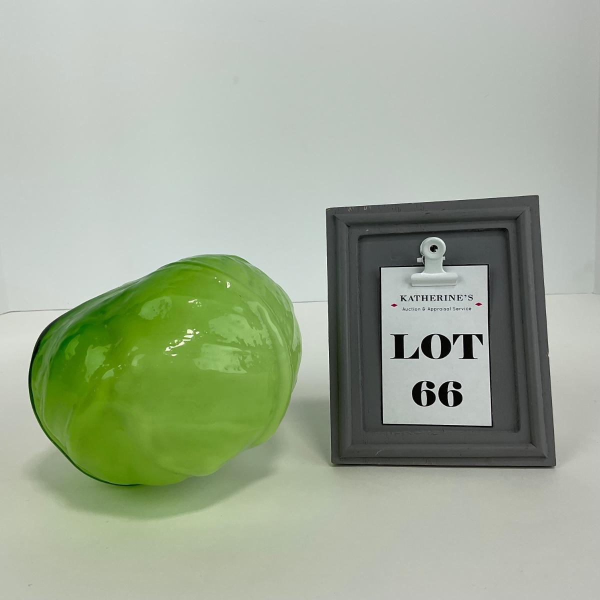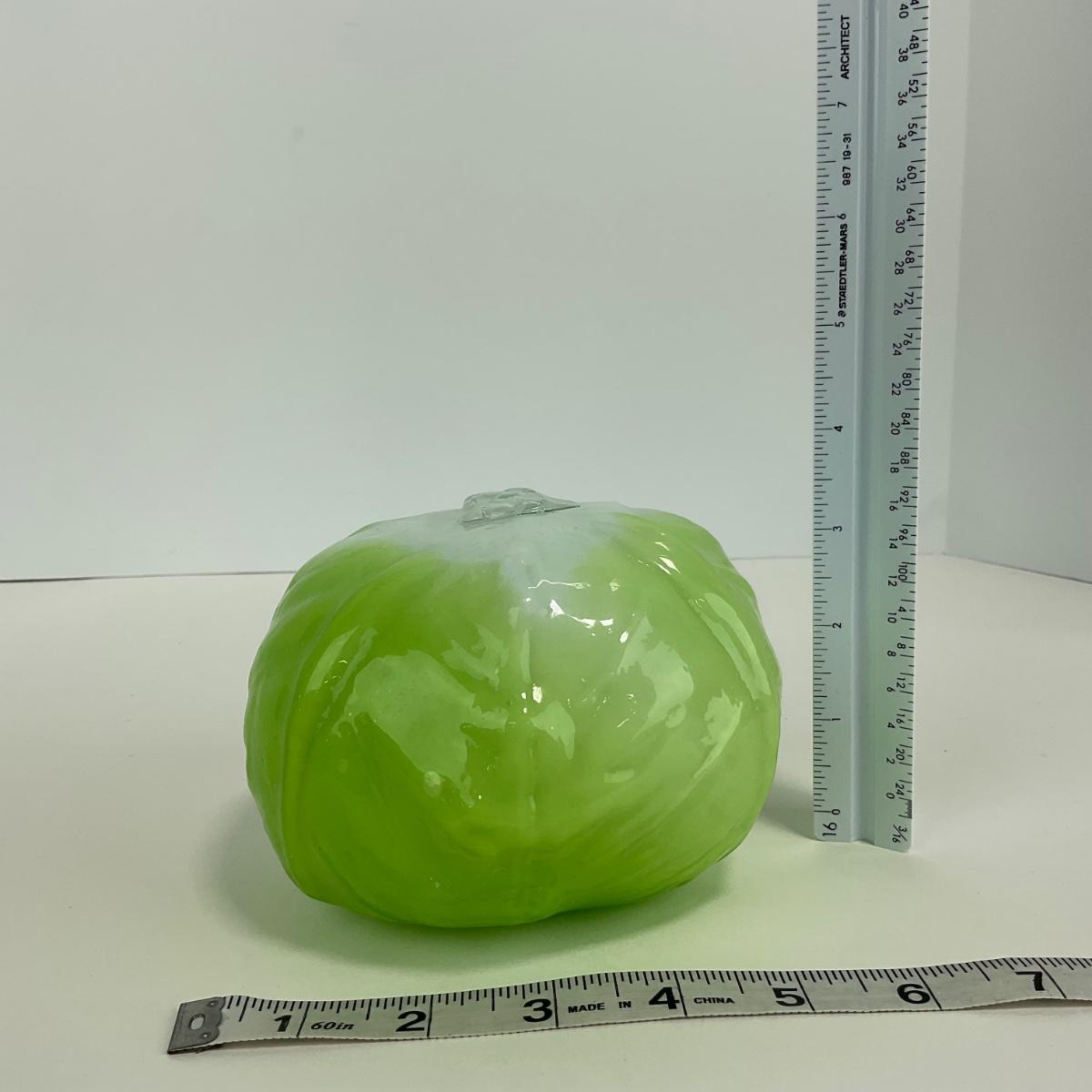 One vintage art glass green lettuce figure. This piece has no damage, and appears to be in great shape with no visable chips, cracks, or broken pieces. Please see photos for details and condition. Any condition statement is given as a courtesy to a client, is an opinion, and should not be treated as a statement of fact. Reference to condition written, oral or within a condition report shall not be regarded as a full account of condition and may not include all defects, alterations, or restorations. Absence of a condition report does not imply a lot is flawless or lacking imperfections or damage. Katherine’s Auction & Appraisal Service shall have no responsibility for any error or omission. Returns shall not be accepted on the basis of condition. ::: Shipping is available on this lot. If you require shipping you must let us know at the close of the auction. We will coordinate with you after the item has been won. Shipping fees will include insurance up to or exceeding the value of all items being mailed. If you have any questions regarding this lot please contact the auctioneer either via this website, by direct email or by phone. PICK UP TIMES and other important information can be found in the TERMS and DESCRIPTION of the auction. Please take a look for pertinent information. Thanks!