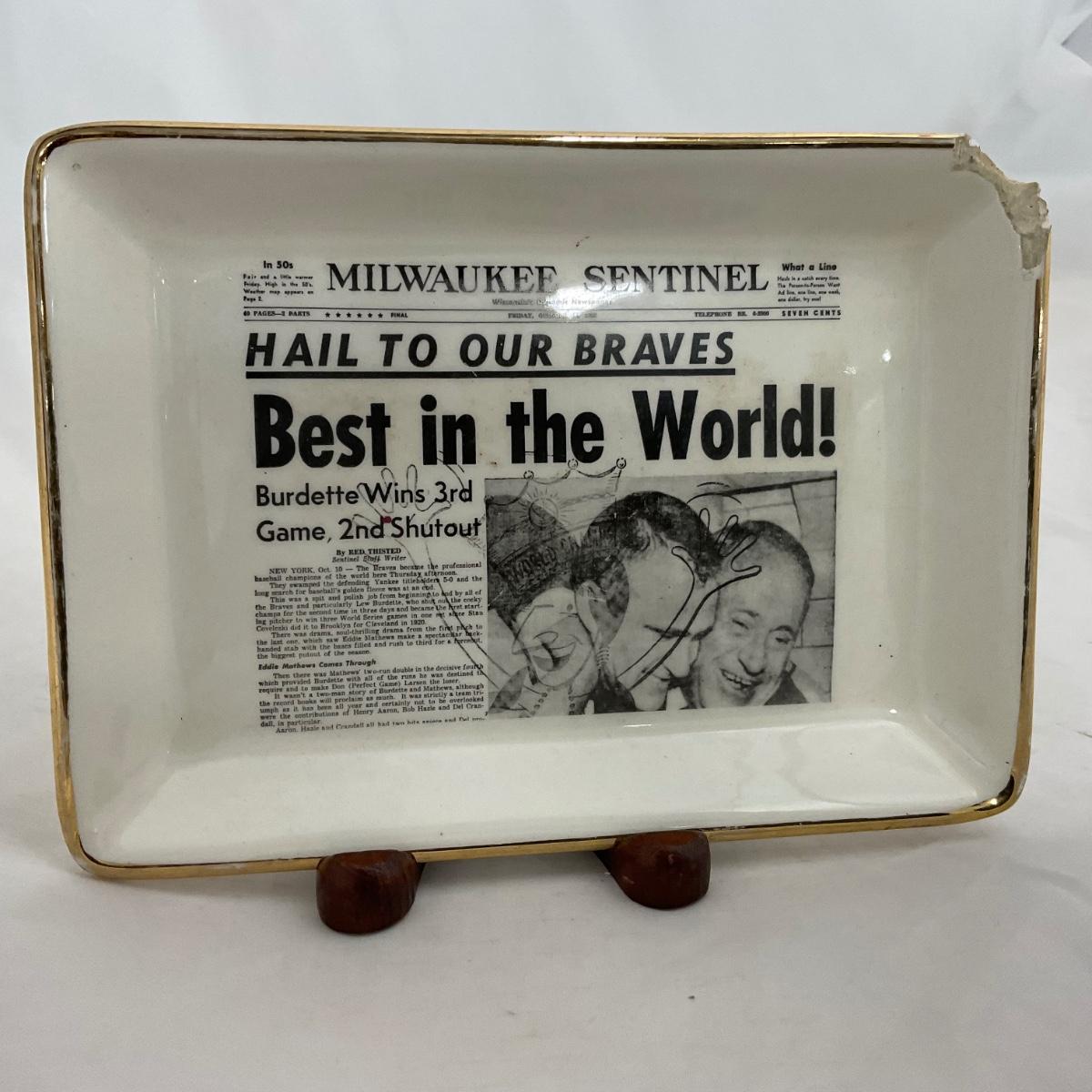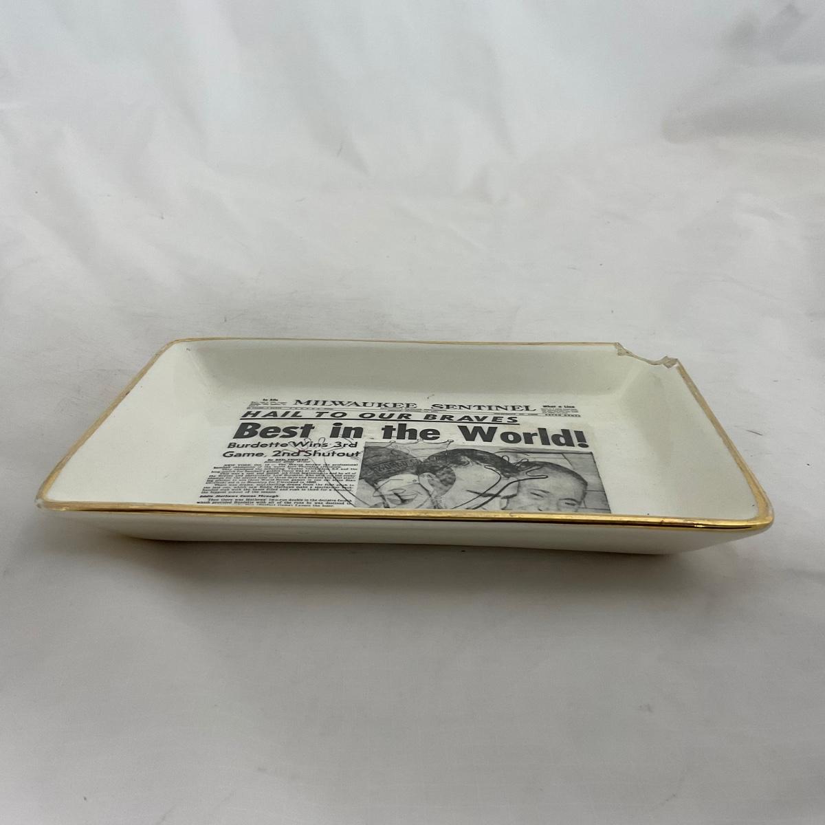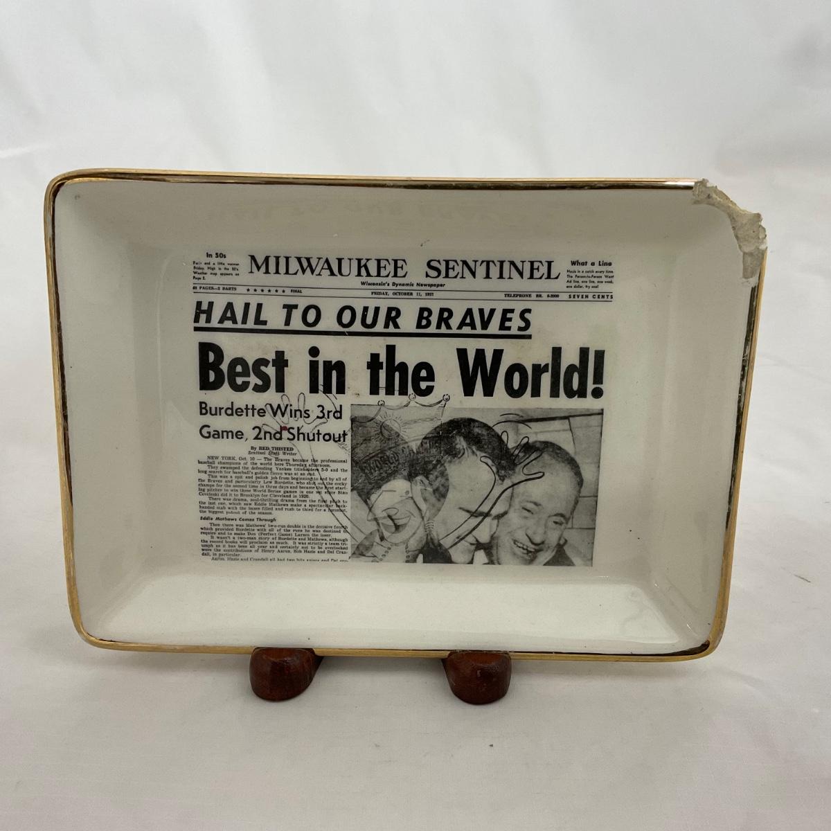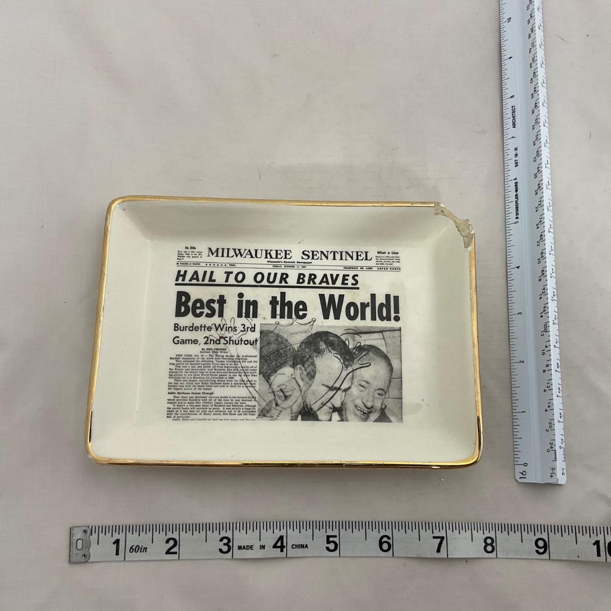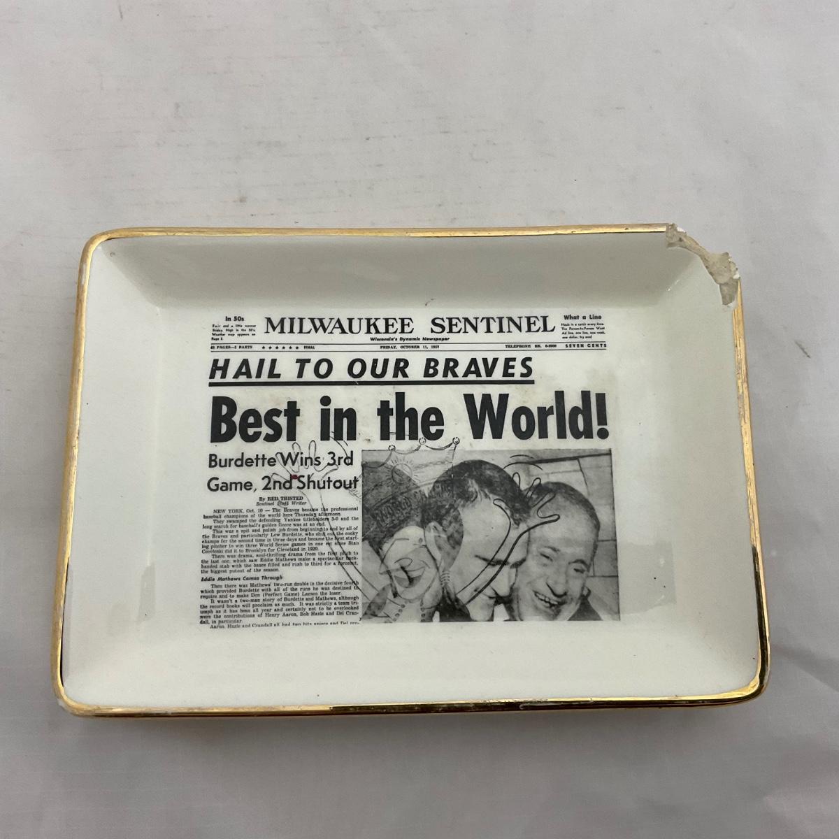 One 1957 Milwaukee Braves World Series champion ashtray. Ashtray has noticeable damage on the top right corner of the ashtray, but is still well sought after. Please see photos for details and condition. ::: Shipping is available on this lot. If you require shipping you must let us know at the close of the auction. We will coordinate with you after the item has been won. Shipping fees will include insurance up to or exceeding the value of all items being mailed. If you have any questions regarding this lot please contact the auctioneer either via this website, by direct email or by phone. PICK UP TIMES and other important information can be found in the TERMS and DESCRIPTION of the auction. Please take a look for pertinent information. Thanks!