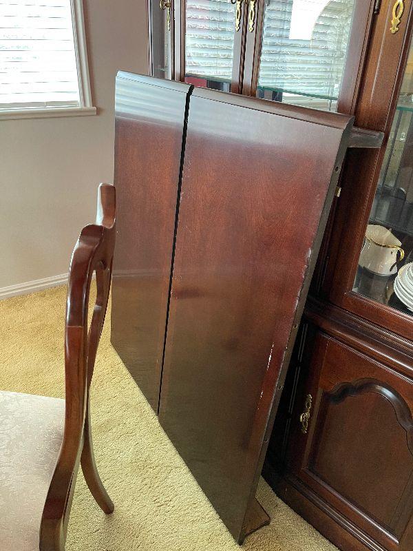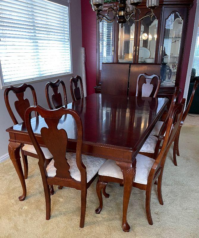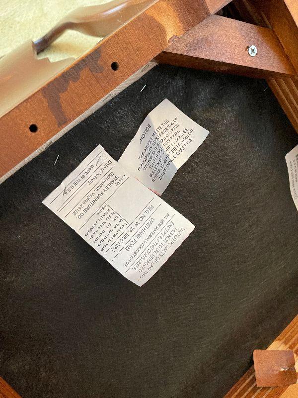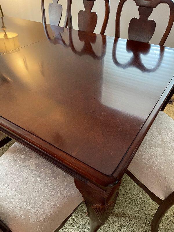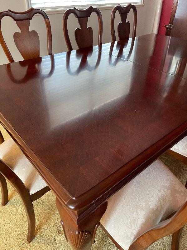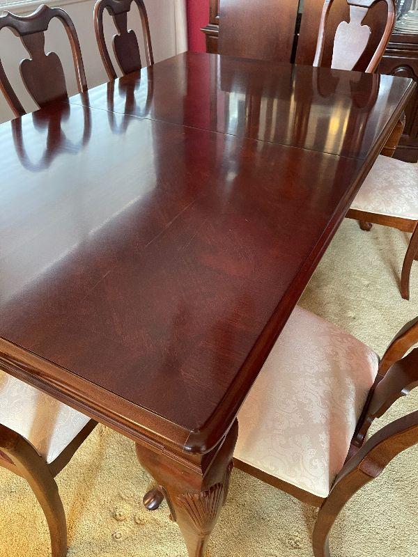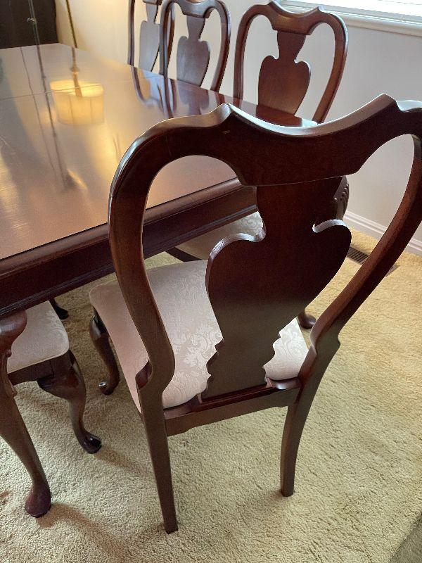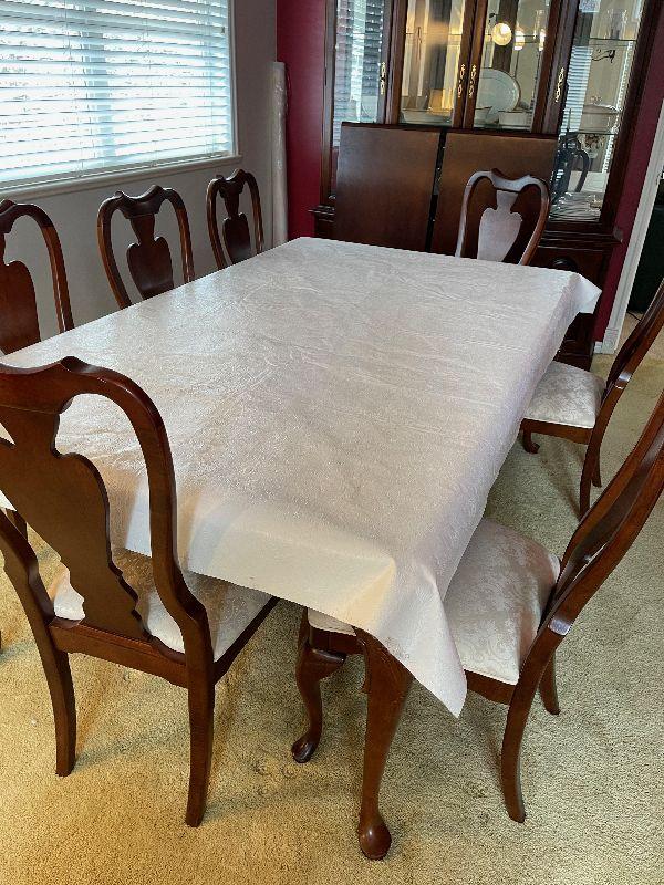 77 x 46 Excellent Condition. Beautiful! Always Covered. By Stanley Furniture, Chairs and table Legs are queen Anne Style. BRING HELP to move.