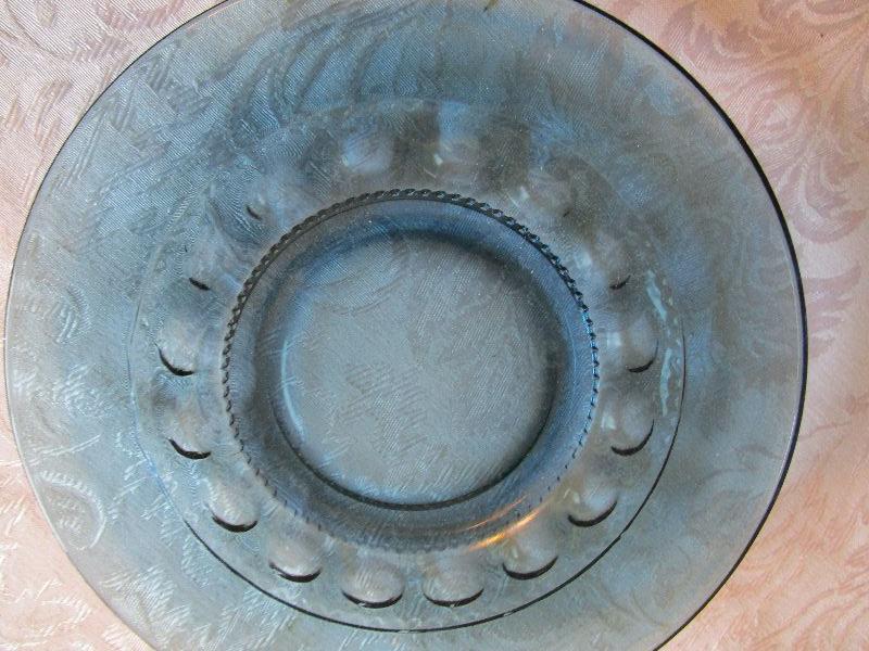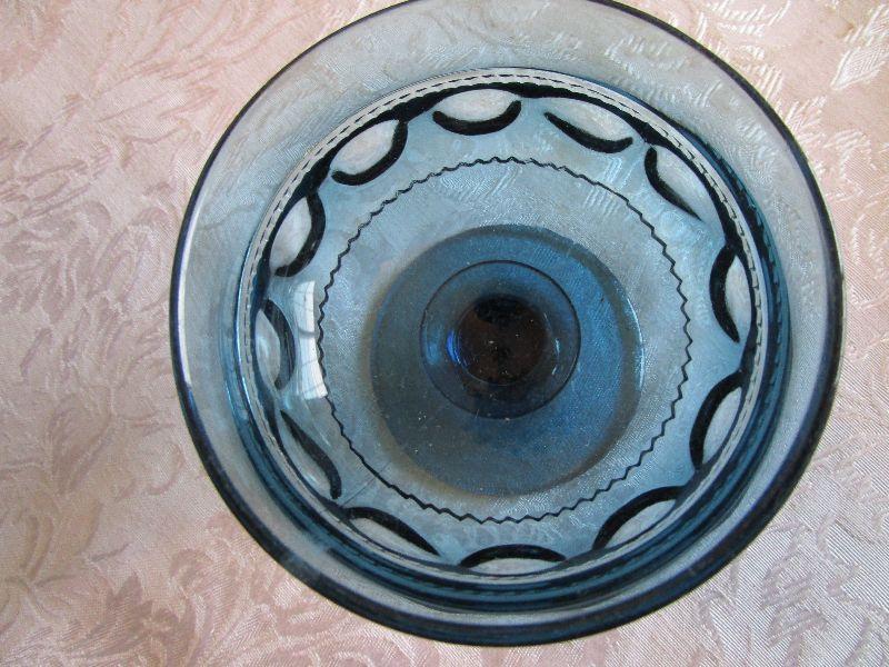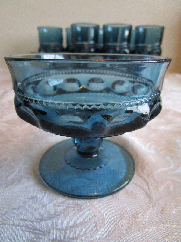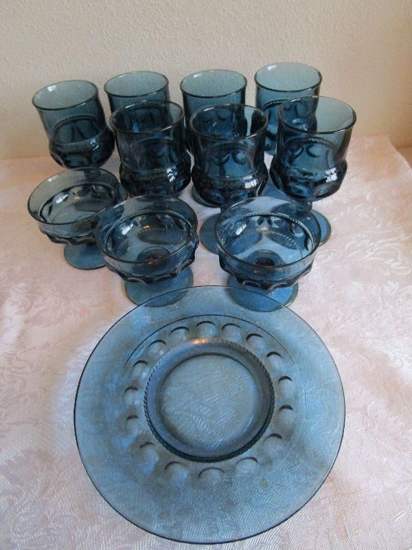 Indiana Glass Kings Crown Thumbprint Teal blue, 7 water goblets 5 3/4", 3 sherbet/dessert glasses 3 1/8"; 1 snack plate 8 1/2"