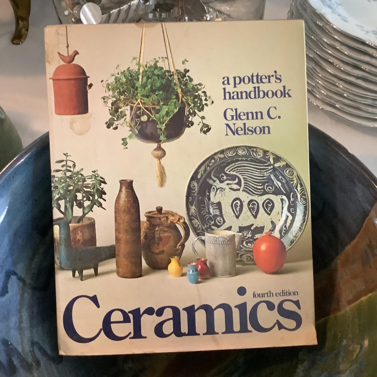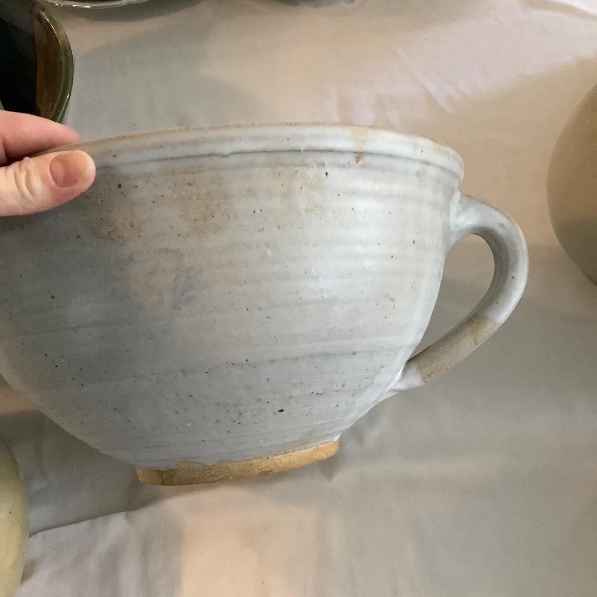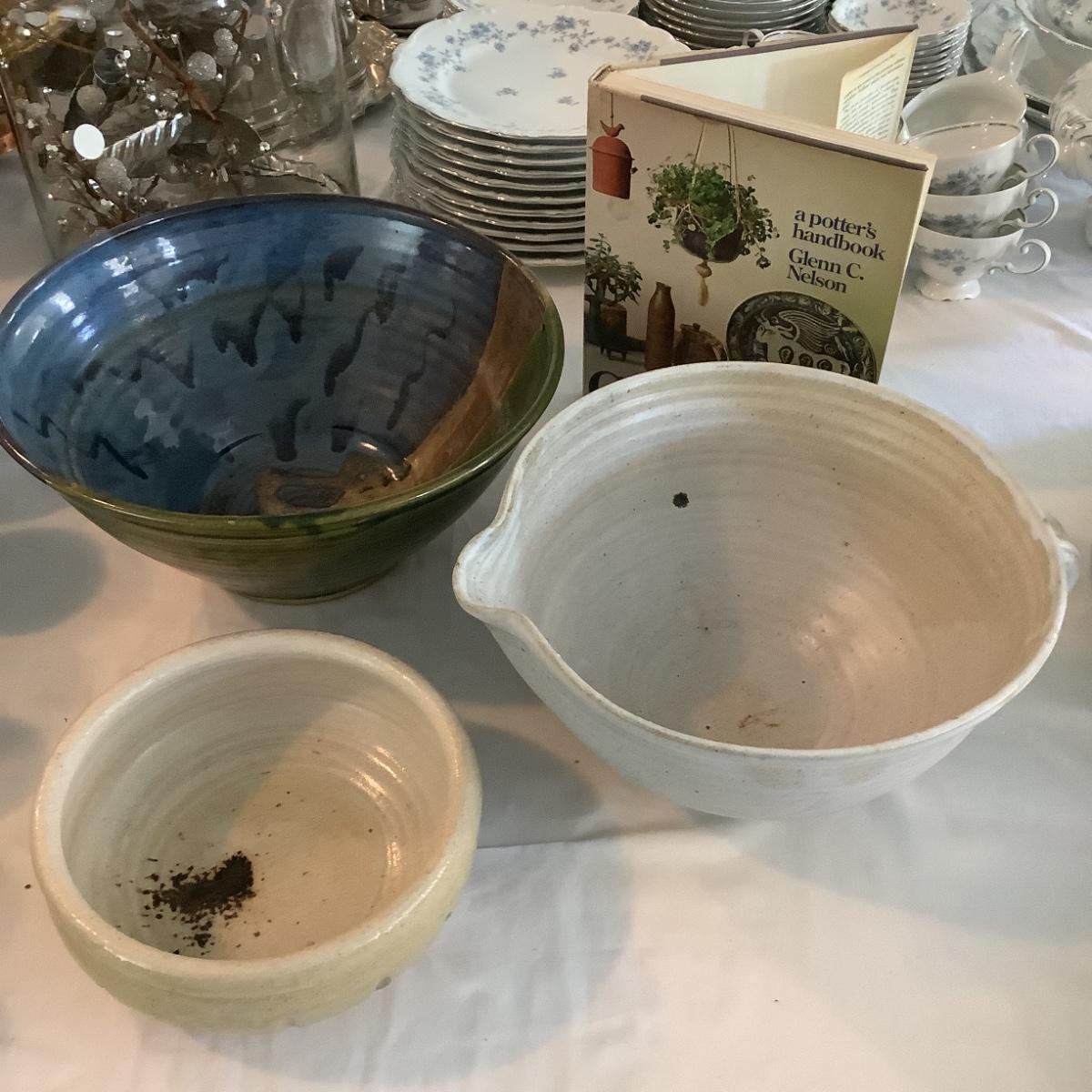 The lot contains Ceramic book. Large mixing bowl with handle and spout (12'd x 6") large decorative hand thrown bowl (13"d x 6") one chip on the rim, smaller hand thrown dish (8"d x 3").