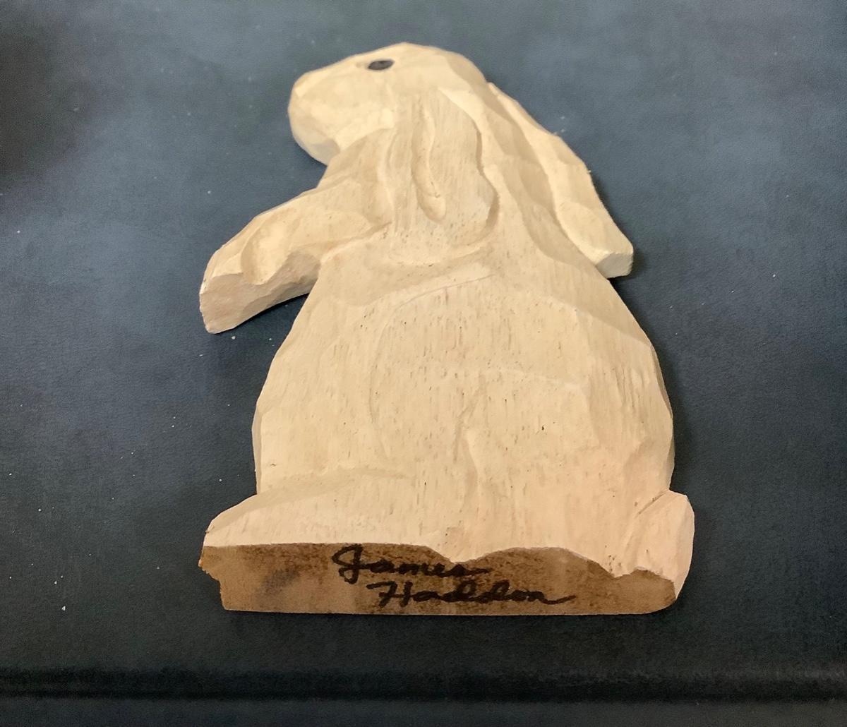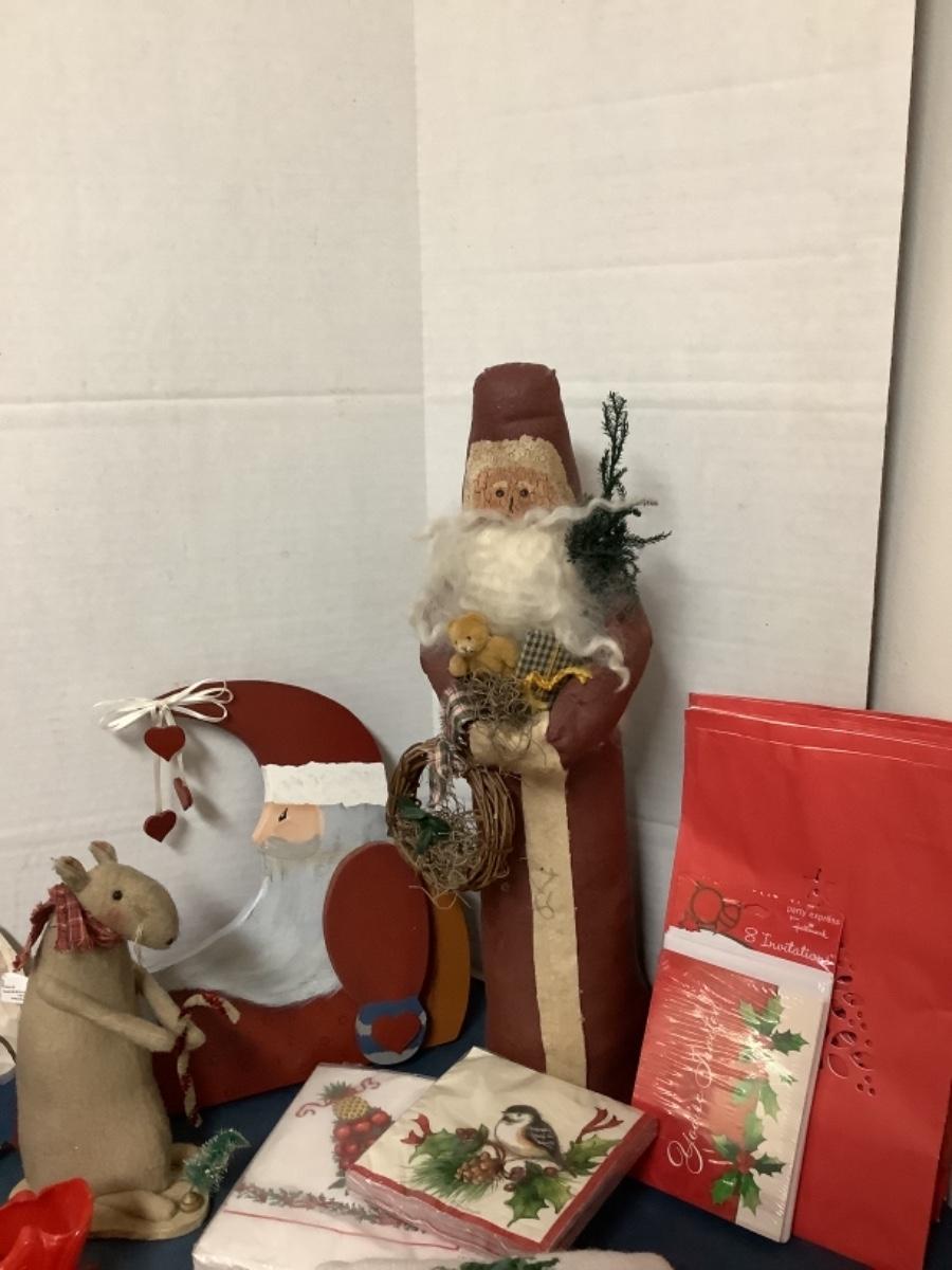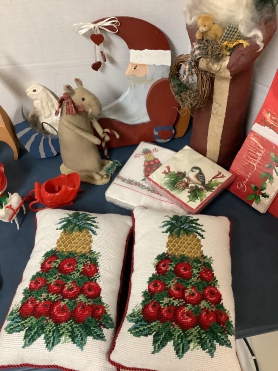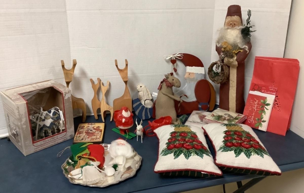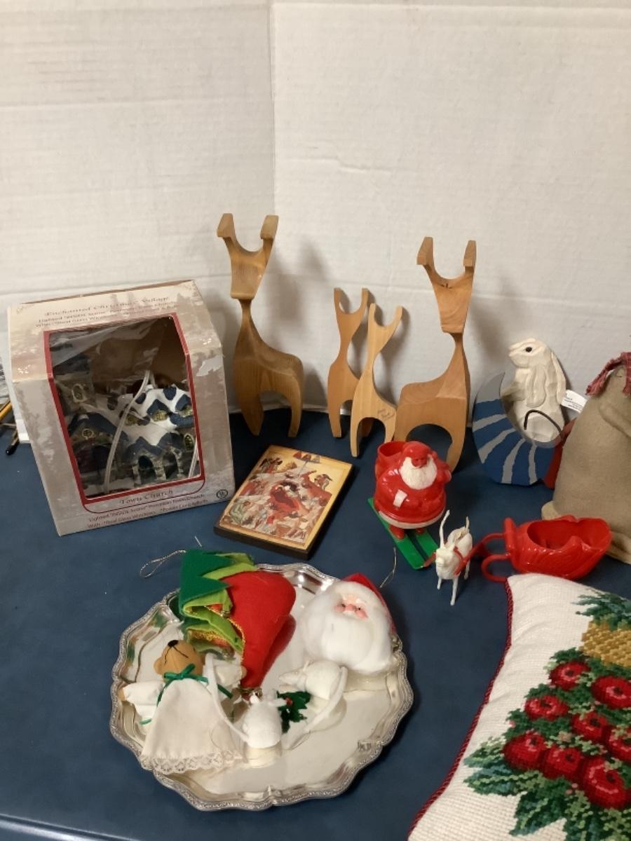 Lot of assorted Christmas decor, wooden sleeping Santa, Papier-mâché Santa, Enchanted Christmas Village Town Chruch light up decor, ornaments, pair of needlepoint throw pillows, 4 Mid-Century wooden reindeer, measuring 10” tall and 7-1/2” tall, signed 2009 and 2010 please see photos for makers signature, carved wood bunny signed James Haddon and more