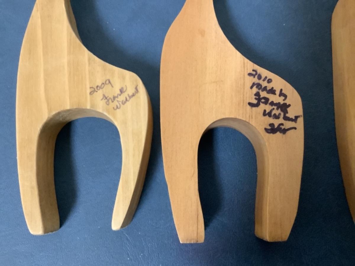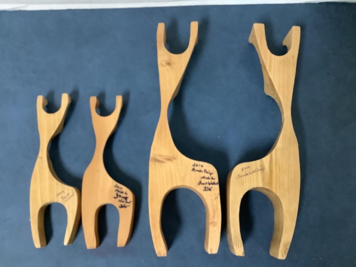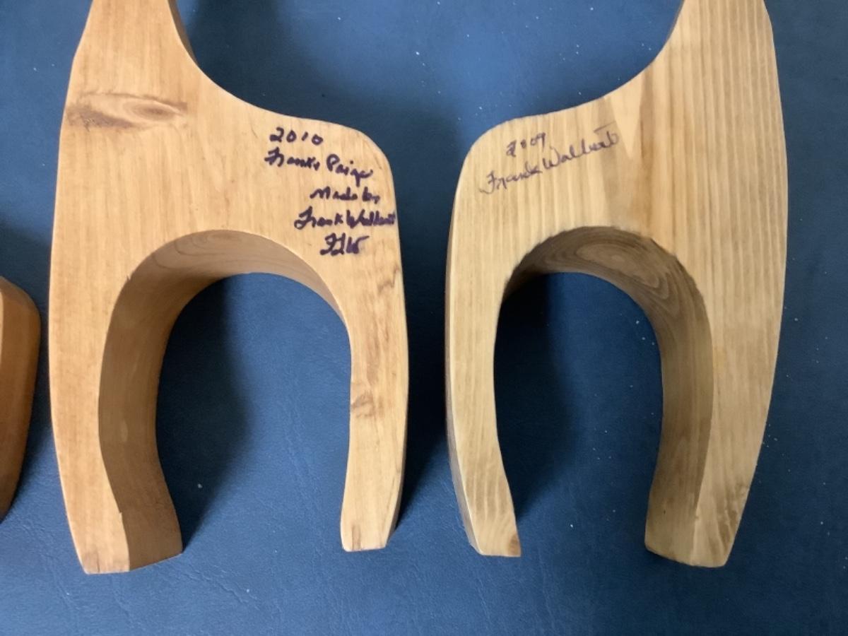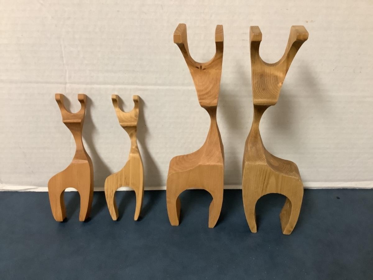 Lot of assorted Christmas decor, wooden sleeping Santa, Papier-mâché Santa, Enchanted Christmas Village Town Chruch light up decor, ornaments, pair of needlepoint throw pillows, 4 Mid-Century wooden reindeer, measuring 10” tall and 7-1/2” tall, signed 2009 and 2010 please see photos for makers signature, carved wood bunny signed James Haddon and more