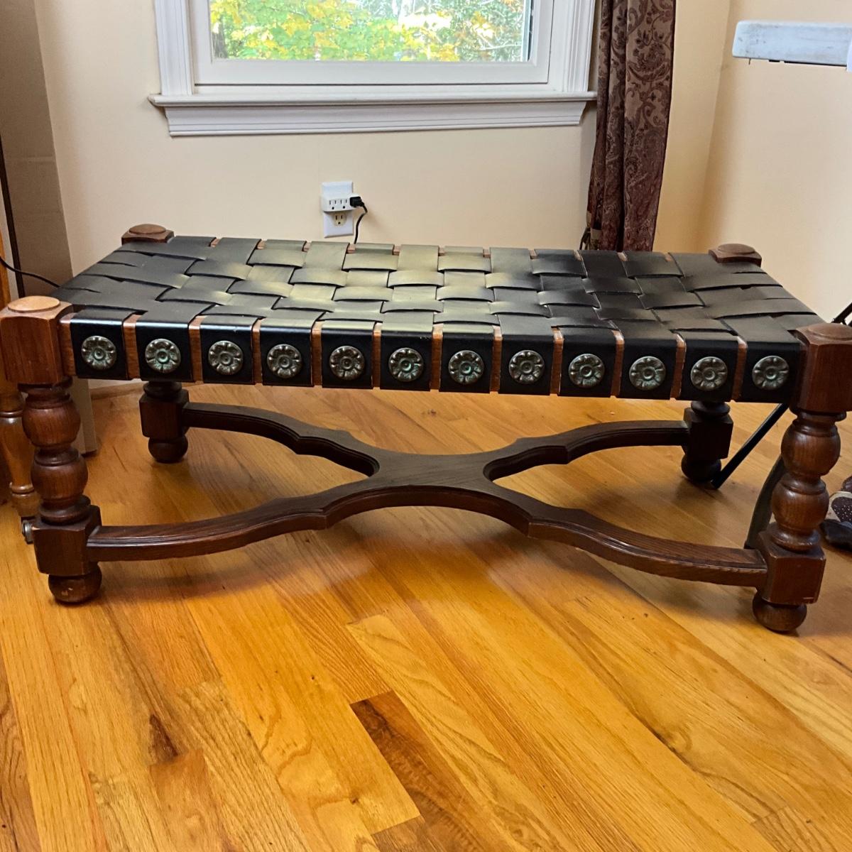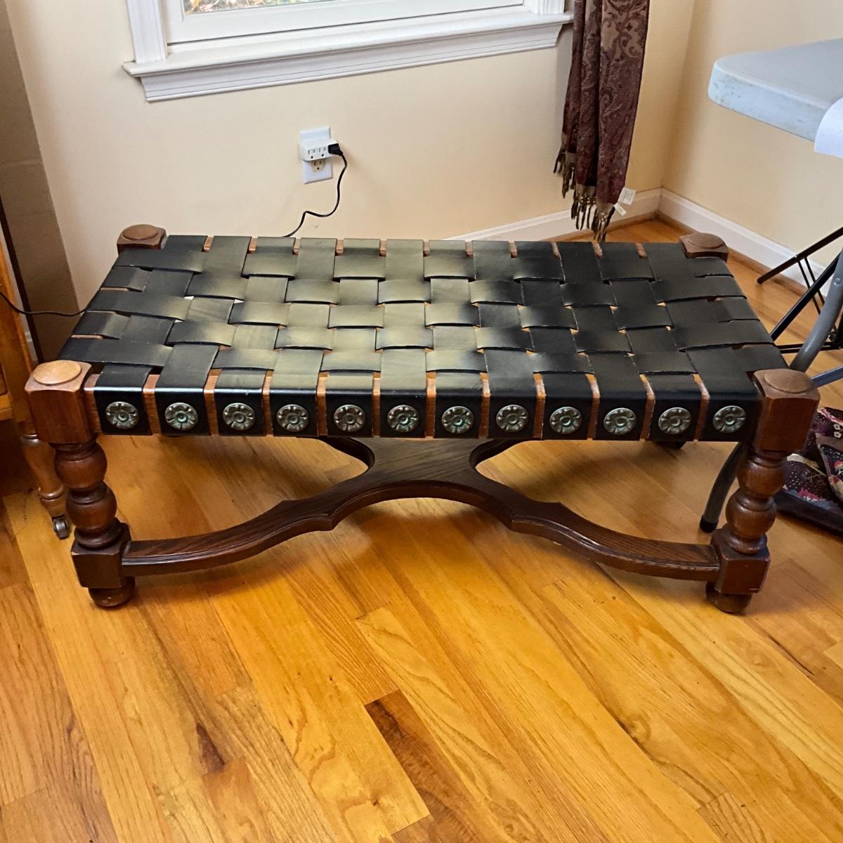 660 Mid Century Modern Spanish Revival Oak & Woven Leather Bench