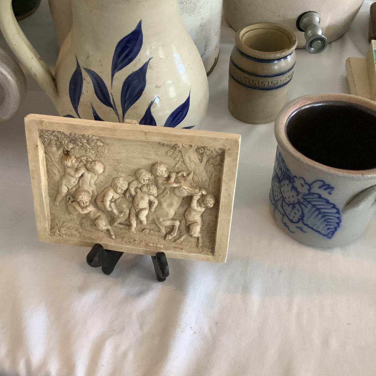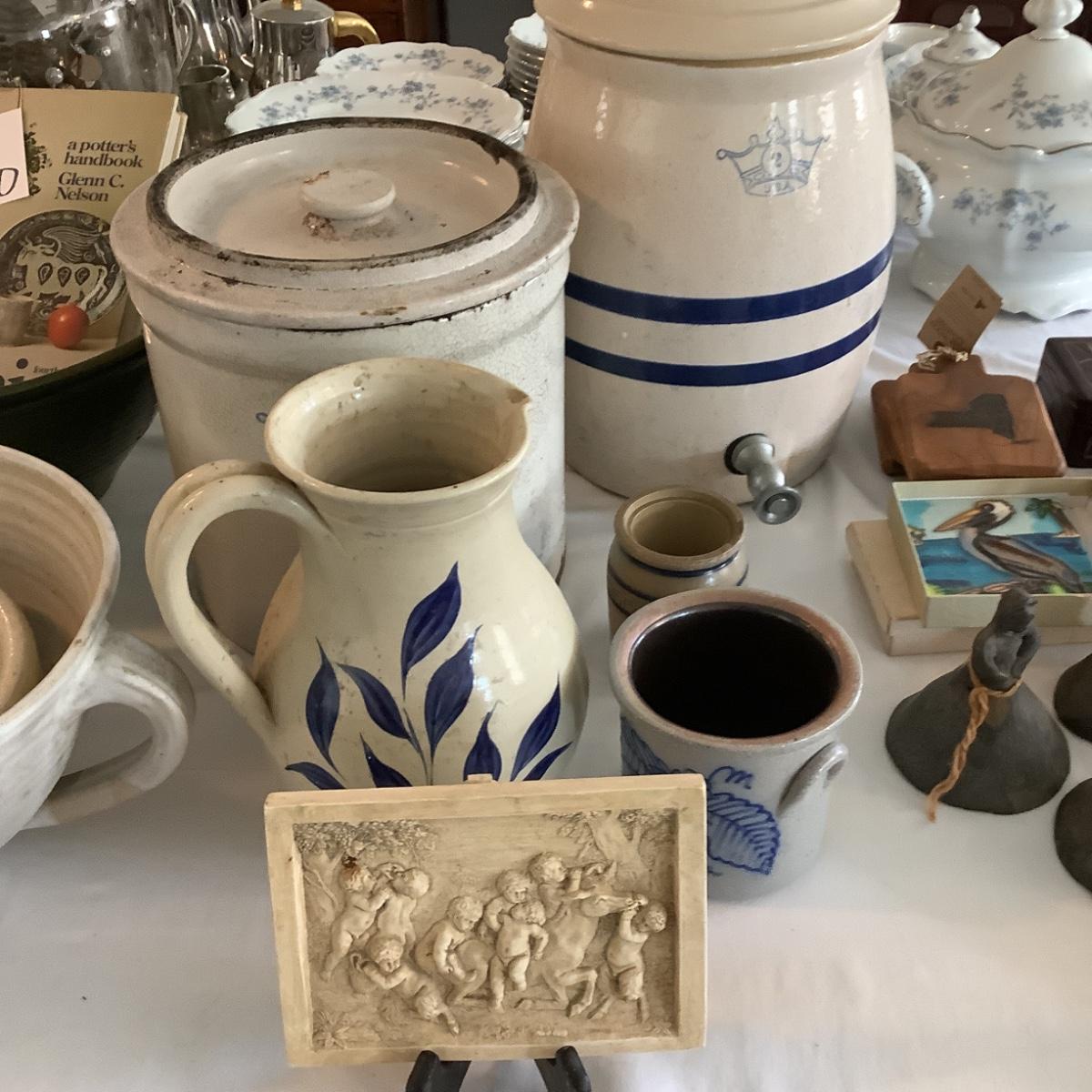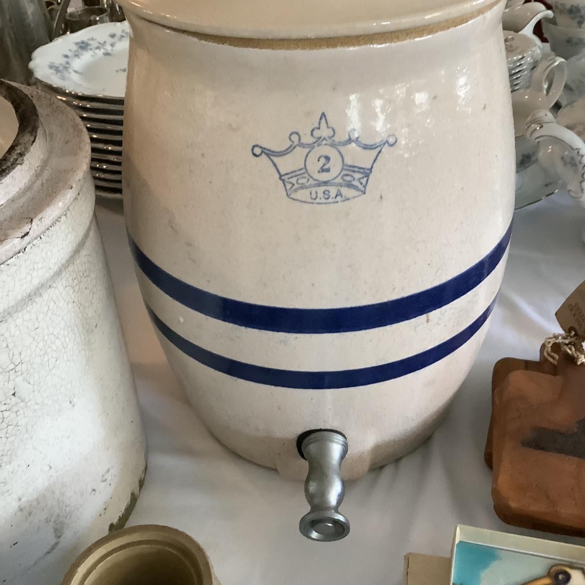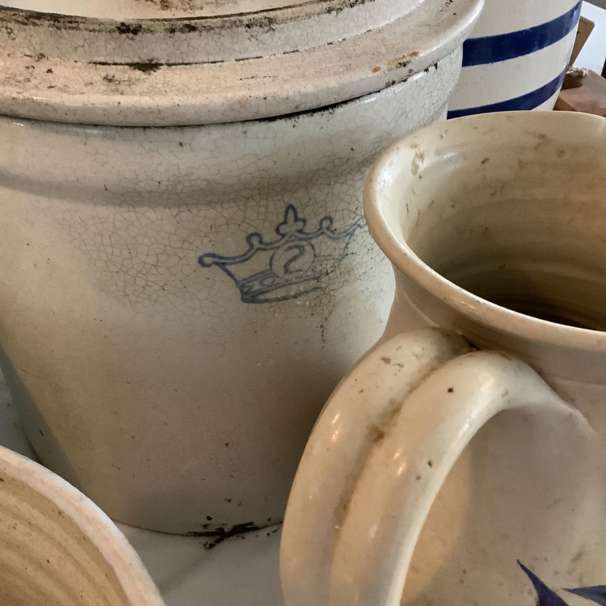 The lot contains several crock pieces, the larges is marked #2 Drink dispenser measuring 14" x 9"d, a #2 lidded crock with crazing throughout that is 10" x 10". There is a pitcher and some smaller crocks.