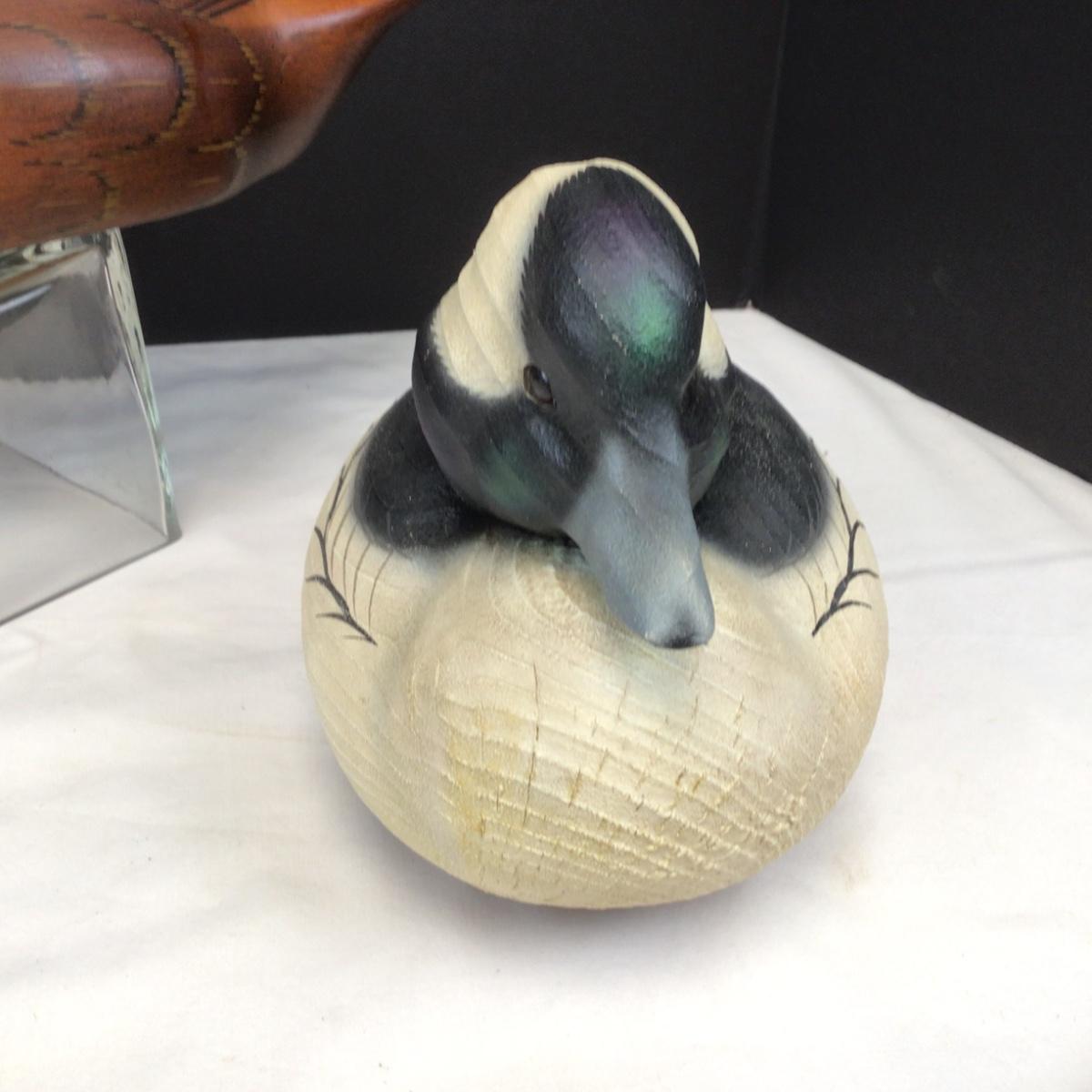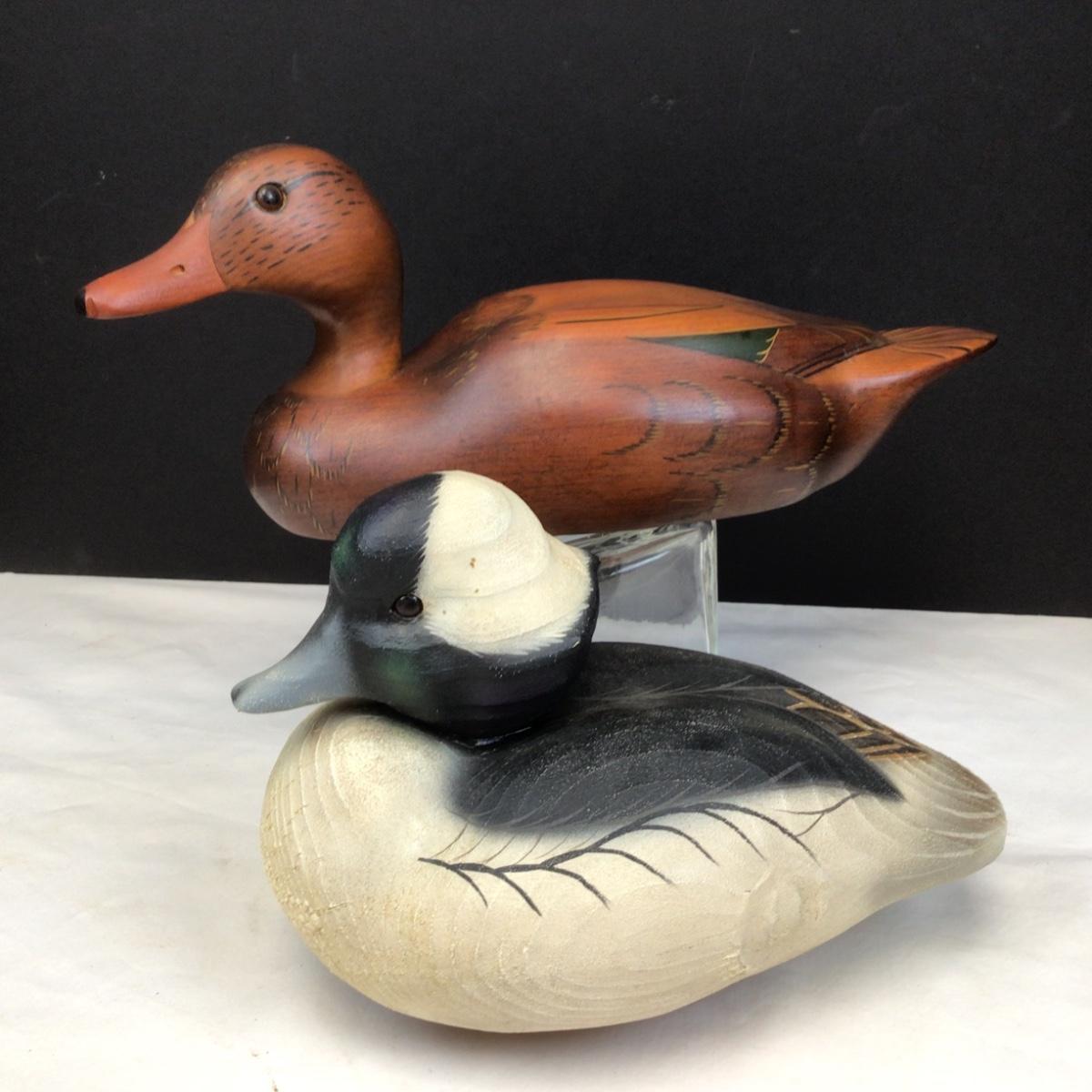 The Hen Mallard is from the decoy shop in Freeport Maine by Heap and hand painted by Judith Elsmore. The Bufflehead decoy is sign Jeff Moore 2007.