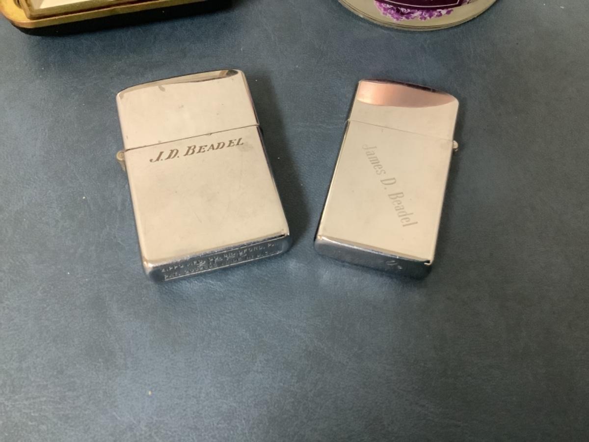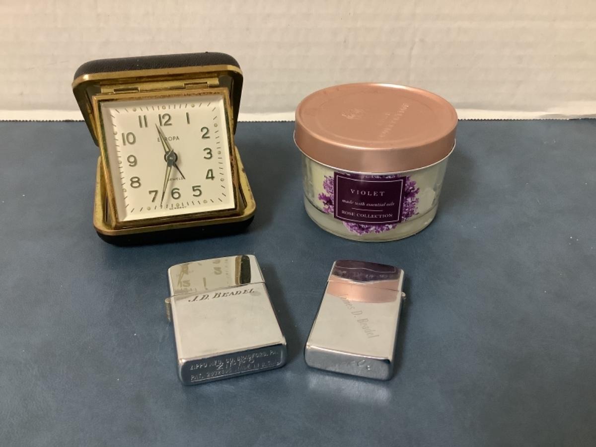 Europa travel clock, two Zippo lighters engraved “J.D. Beadel” and “James D. Beadel” and a Rose Collection Violet scented candle