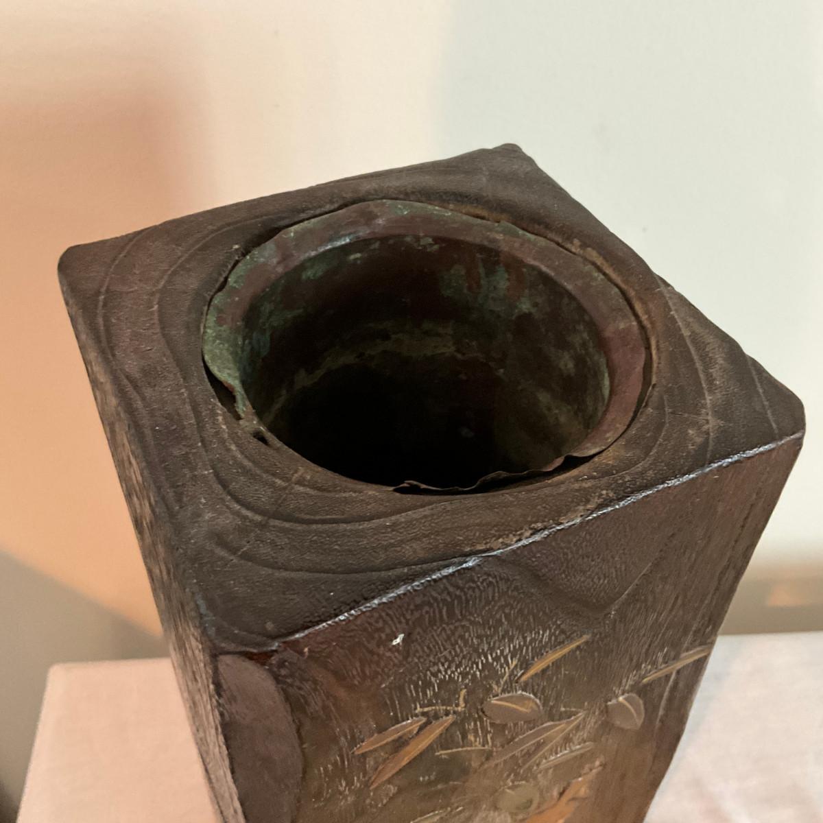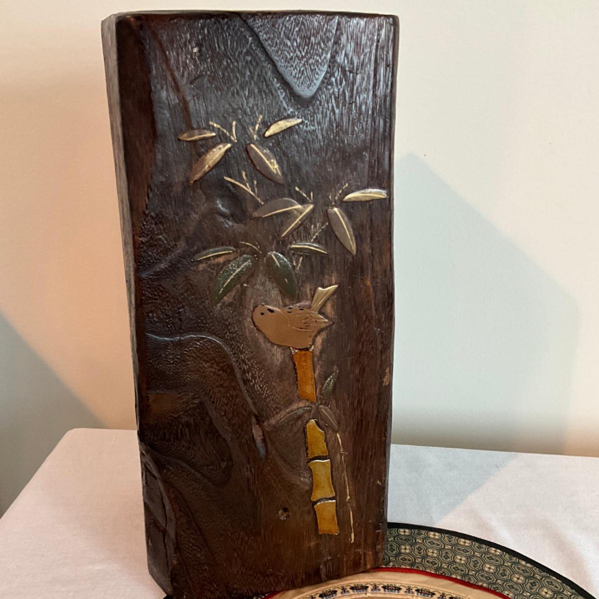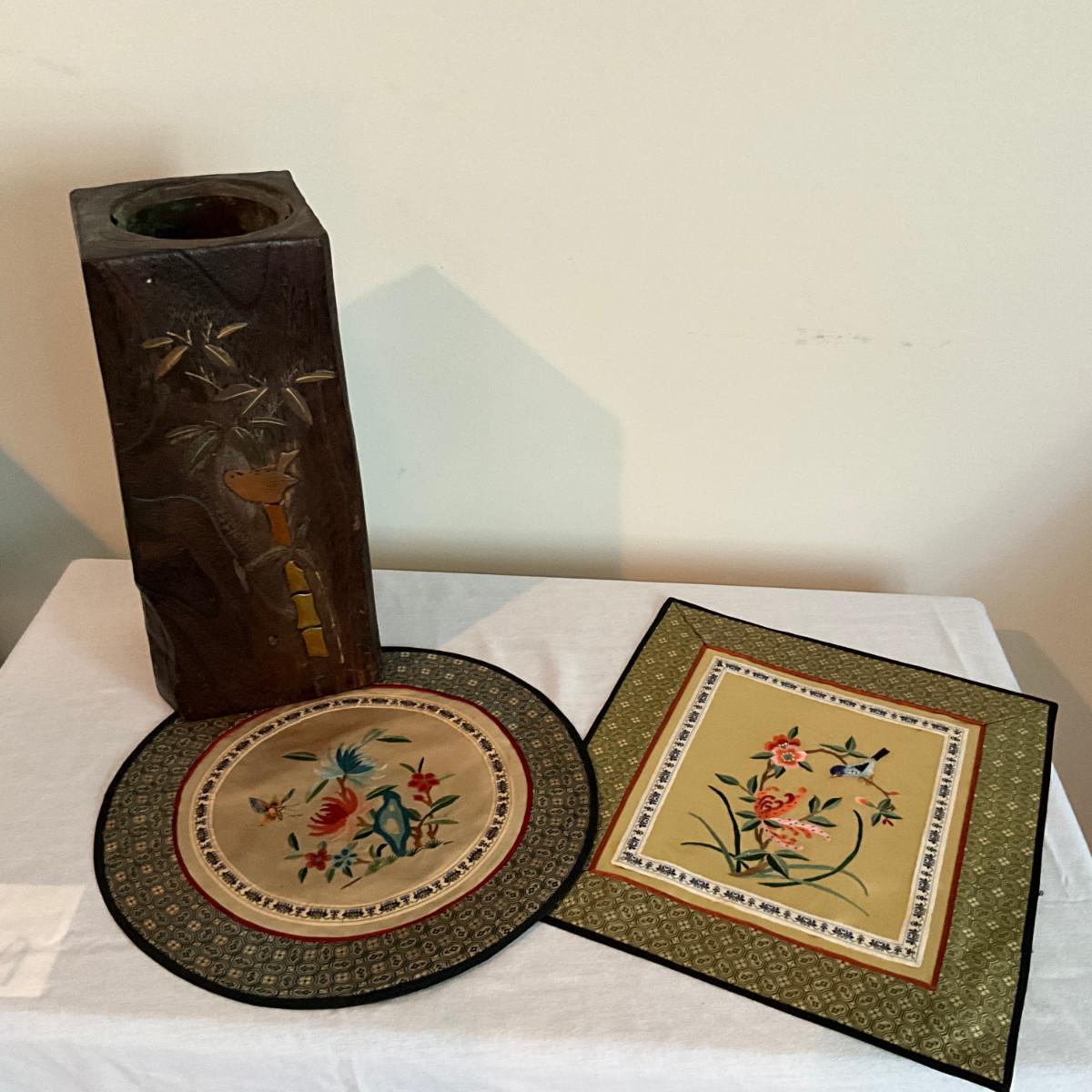 663 Vintage Asian Wooden Vase With Asian Silk Embroidery