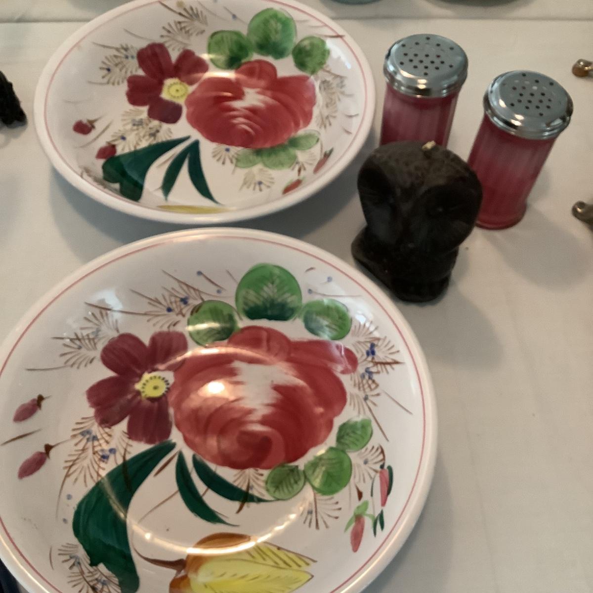 There are 2 floral serving bowls (13"d x 3"). There are 2 Sugar Shaker Lights in Mulberry (5" x 4") and a wax carved owl candle that is 5" tall.