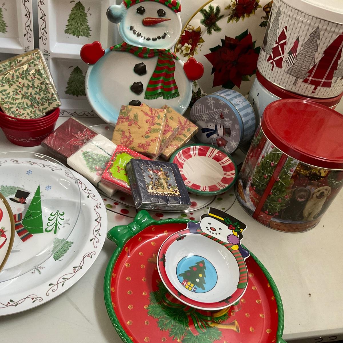 various platters, bowls, paper products , and tins