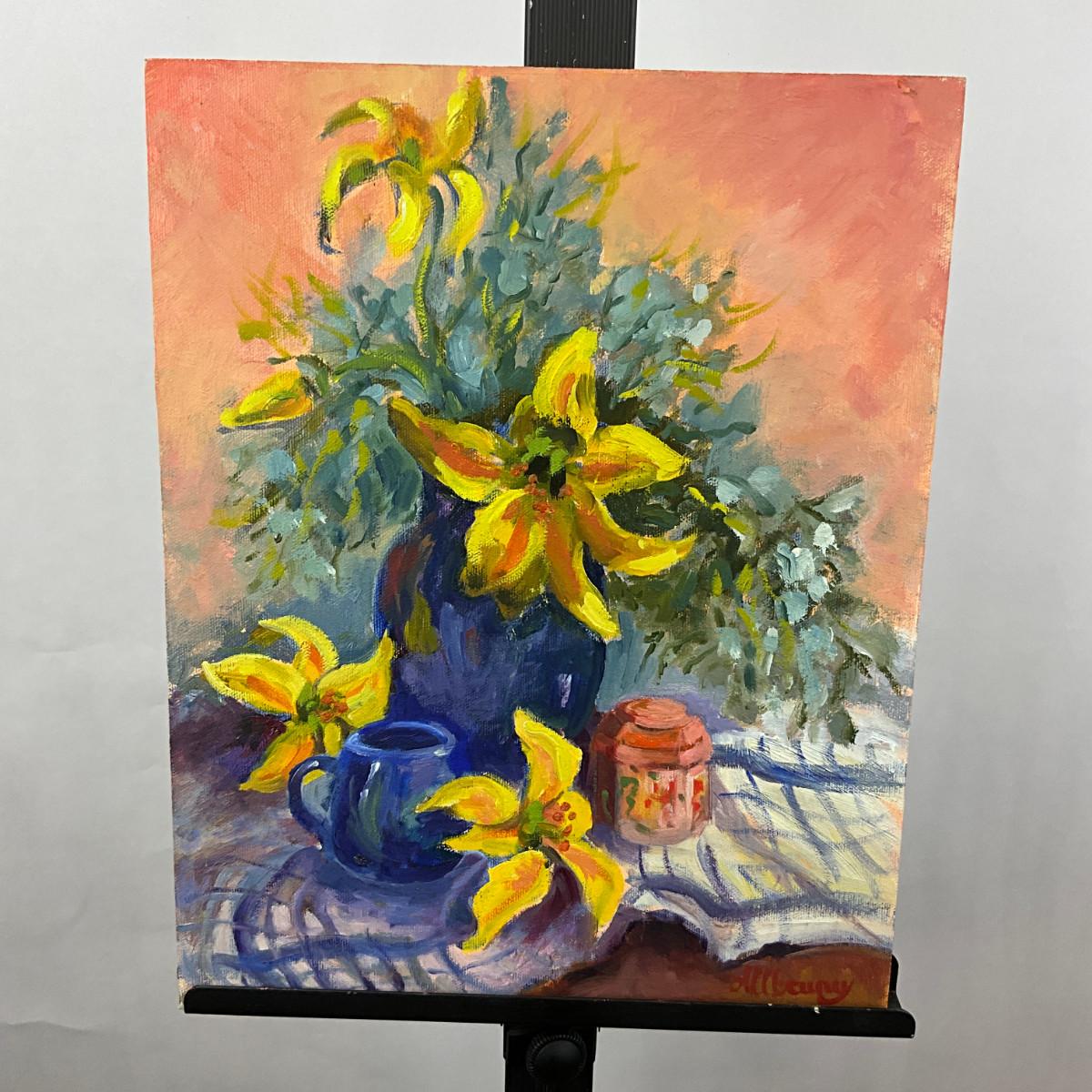 668 Signed Acrylic On Board Still-Life Of Flowers & Mug
