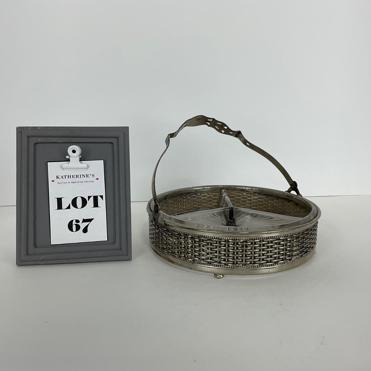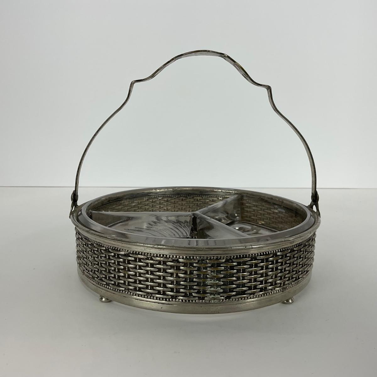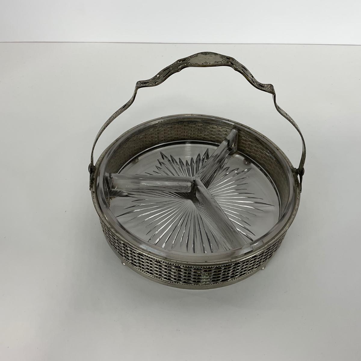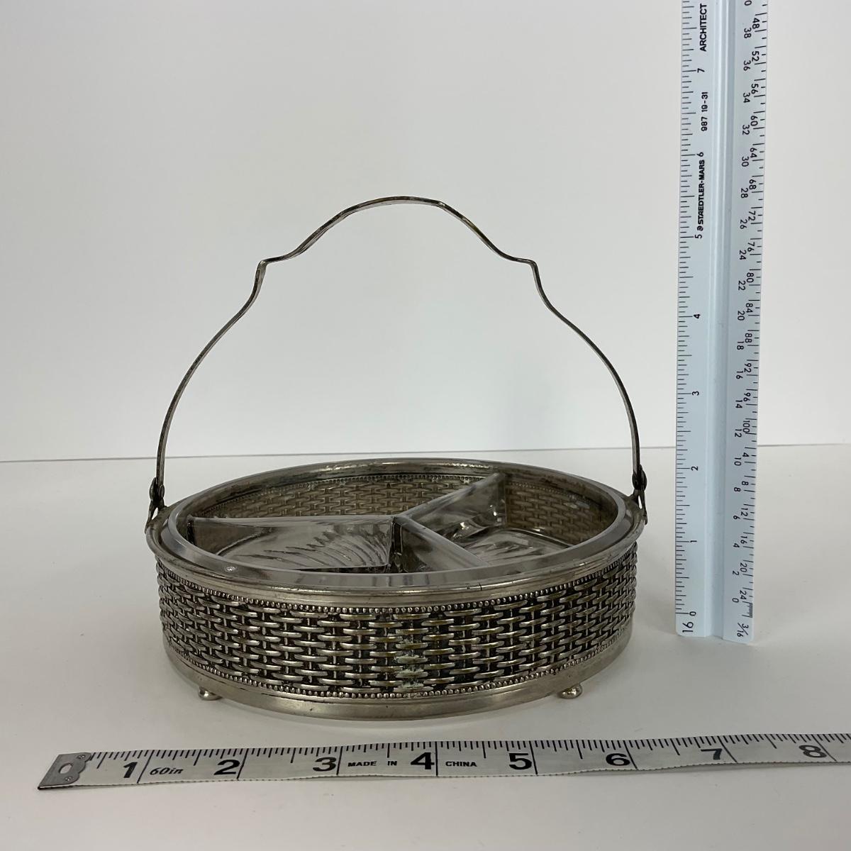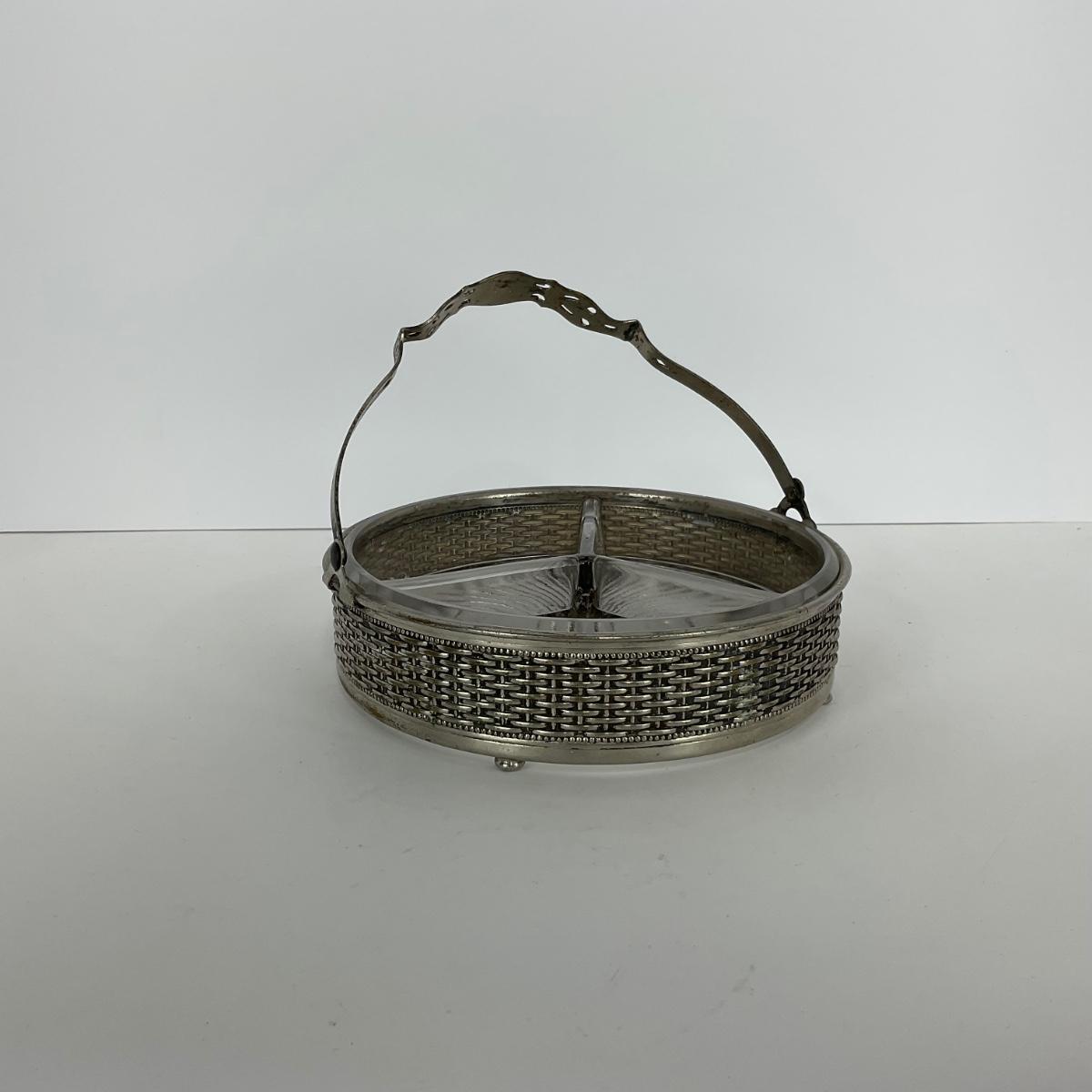 -67- GLASSWARE | Divided Clear Glass Dish With Metal Holder & Handle