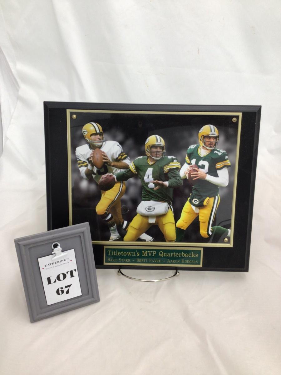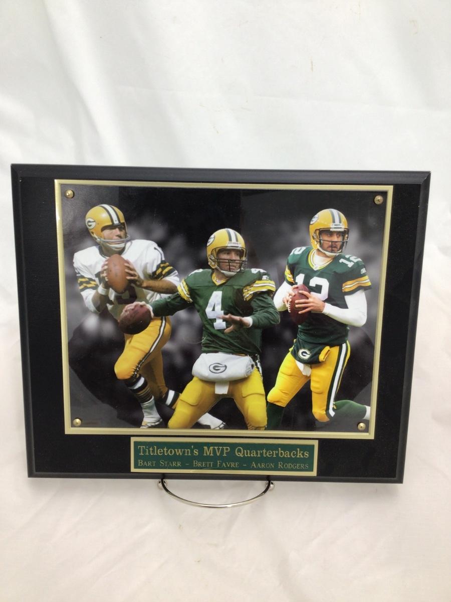 Packers, Titletown’s MVP Quarterbacks Bart Starr, Brett Farve, and Aaron Rodgers plaque with engraved name plate. Please see photos for details and condition. ::: Shipping is available on this lot. If you require shipping you must let us know at the close of the auction. We will coordinate with you after the item has been won. Shipping fees will include insurance up to or exceeding the value of all items being mailed. If you have any questions regarding this lot please contact the auctioneer either via this website, by direct email or by phone. PICK UP TIMES and other important information can be found in the TERMS and DESCRIPTION of the auction. Please take a look for pertinent information. Thanks!