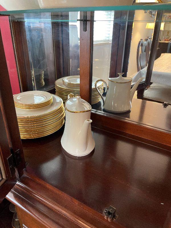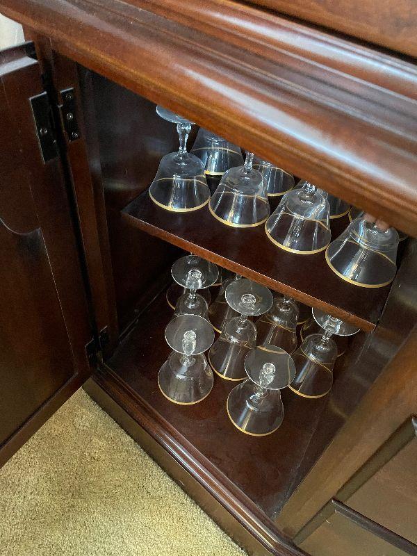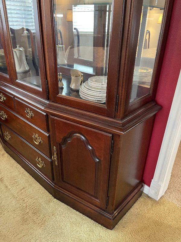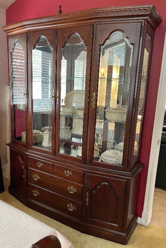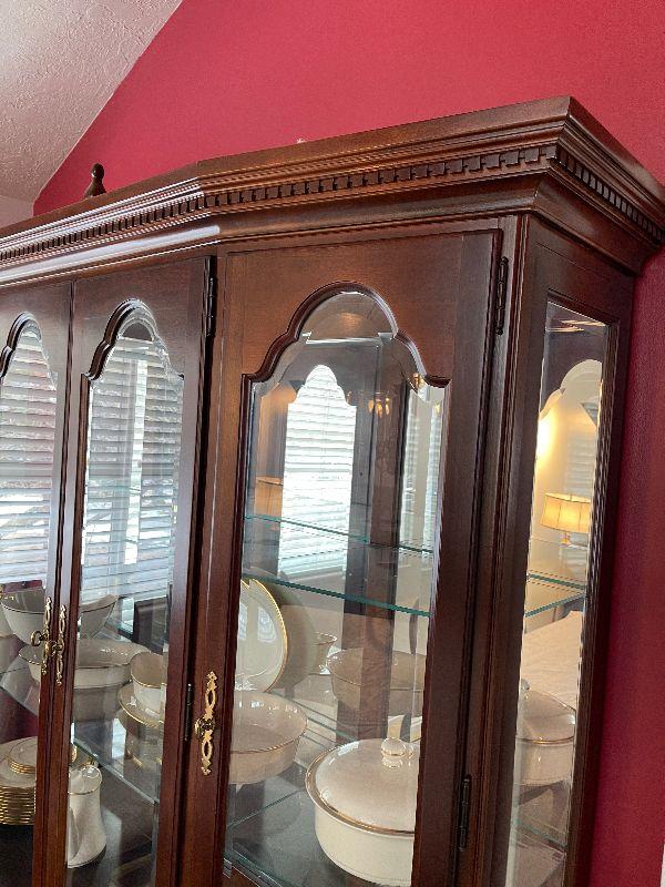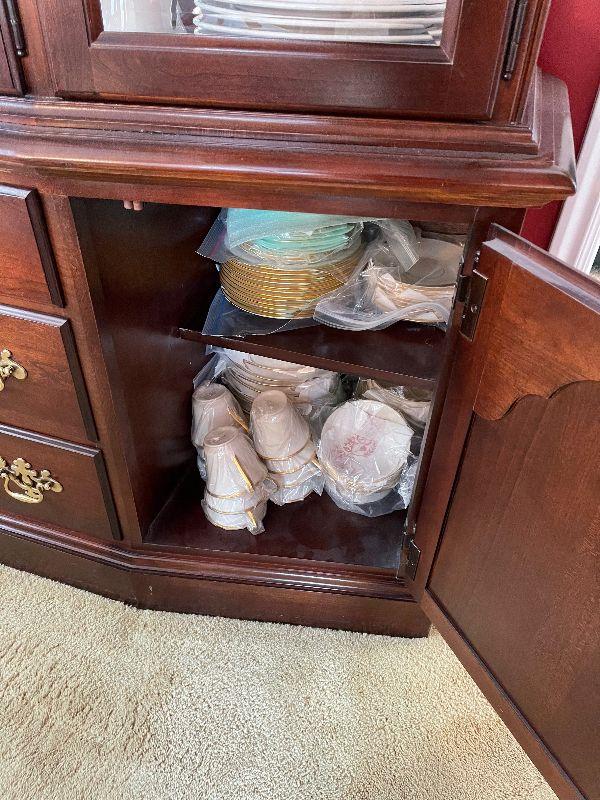 Dishes NOT Included!!! BRING HELP 2 pieces but still very big and heavy. Mirrored back with storage in bottom