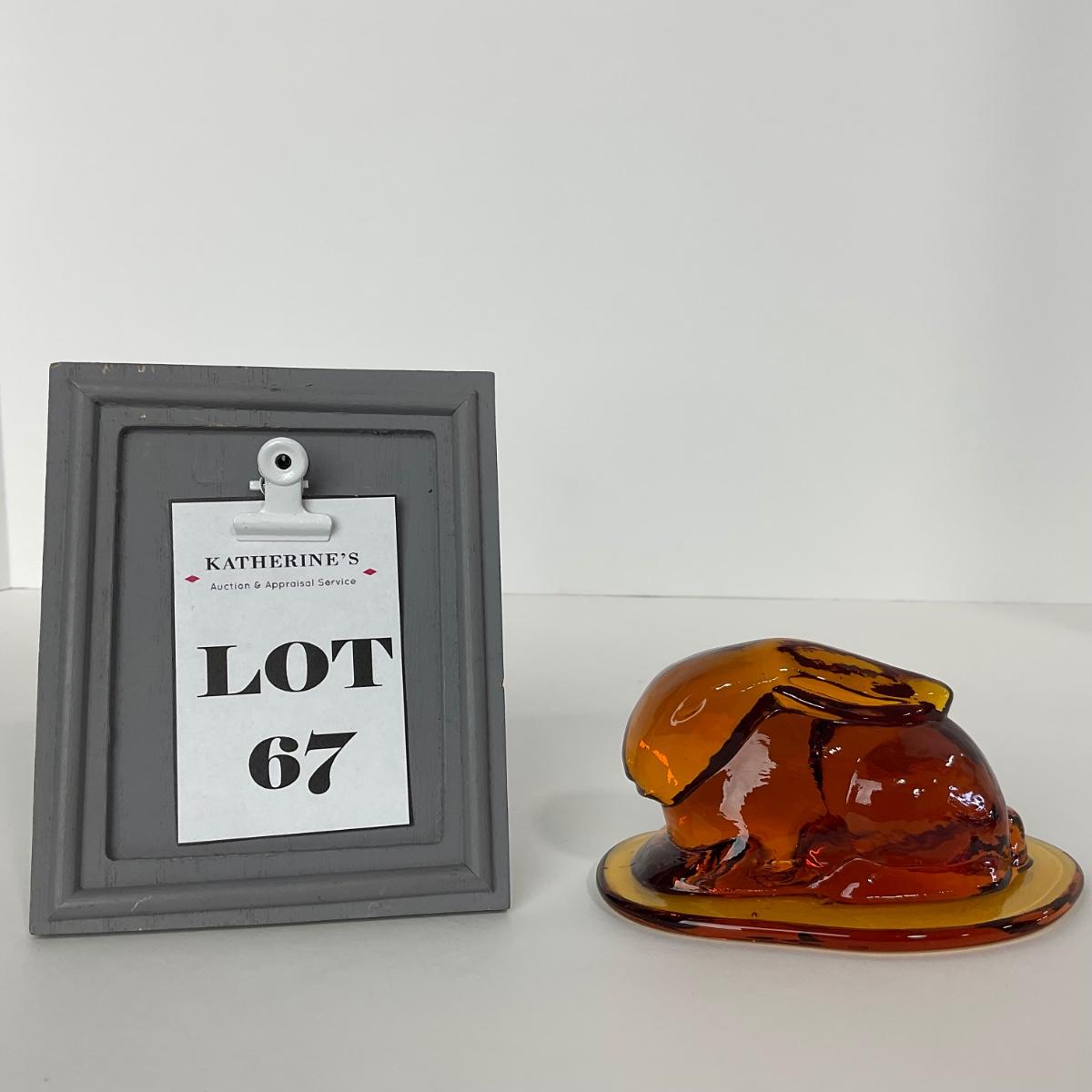One Viking amber crouching rabbit. 2 1/2 inches tall and 4 1/2 inches wide. This piece has no damage, and appears to be in great shape with no visable chips, cracks, or broken pieces. Please see photos for details and condition. Any condition statement is given as a courtesy to a client, is an opinion, and should not be treated as a statement of fact. Reference to condition written, oral or within a condition report shall not be regarded as a full account of condition and may not include all defects, alterations, or restorations. Absence of a condition report does not imply a lot is flawless or lacking imperfections or damage. Katherine’s Auction & Appraisal Service shall have no responsibility for any error or omission. Returns shall not be accepted on the basis of condition. ::: Shipping is available on this lot. If you require shipping you must let us know at the close of the auction. We will coordinate with you after the item has been won. Shipping fees will include insurance up to or exceeding the value of all items being mailed. If you have any questions regarding this lot please contact the auctioneer either via this website, by direct email or by phone. PICK UP TIMES and other important information can be found in the TERMS and DESCRIPTION of the auction. Please take a look for pertinent information. Thanks!