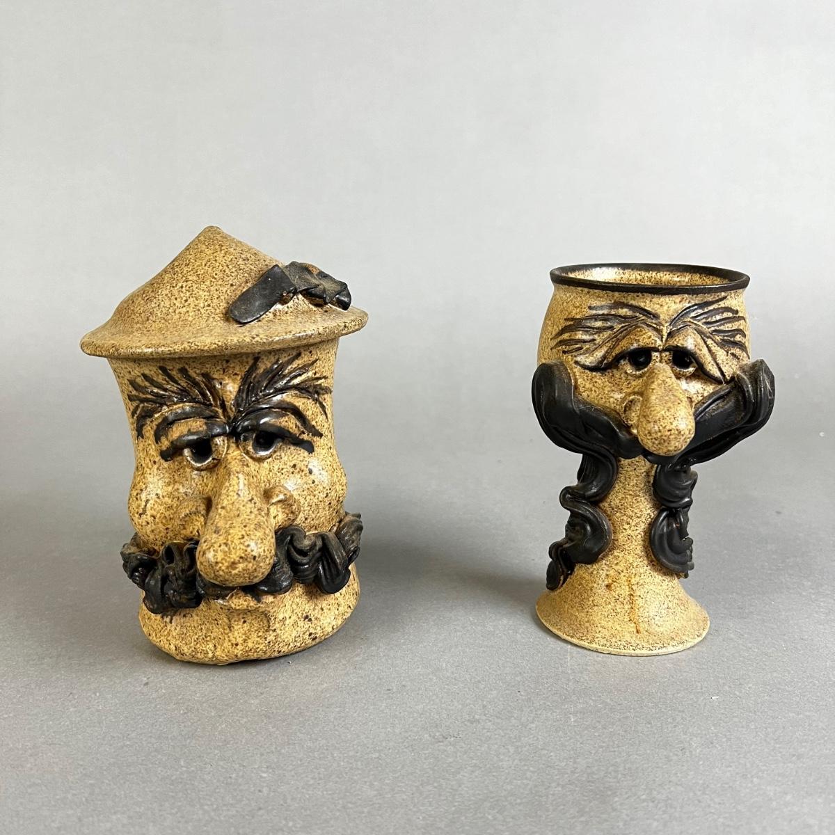 2 vintage handcrafted and hand painted 3D face stoneware pottery mugs by the same artist.