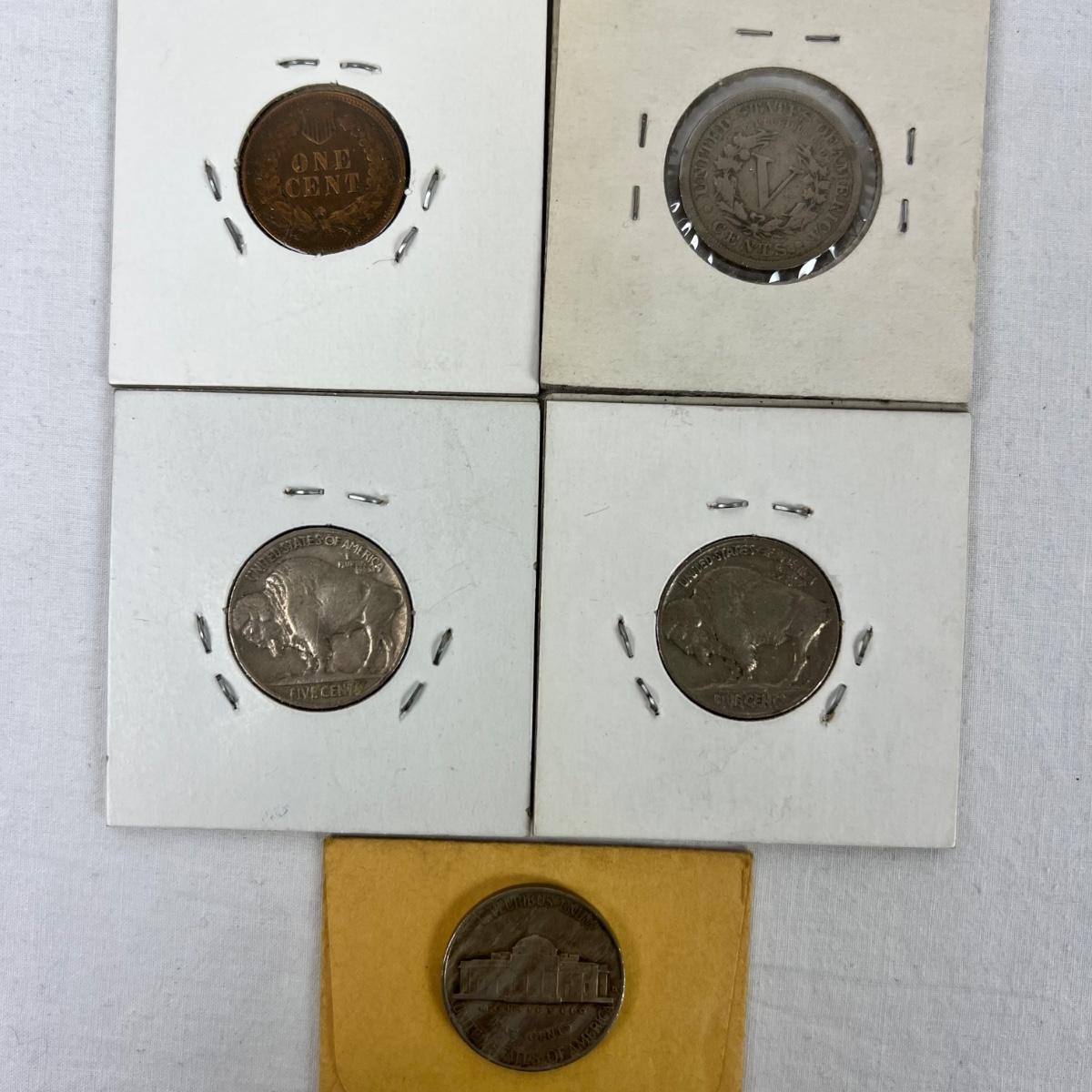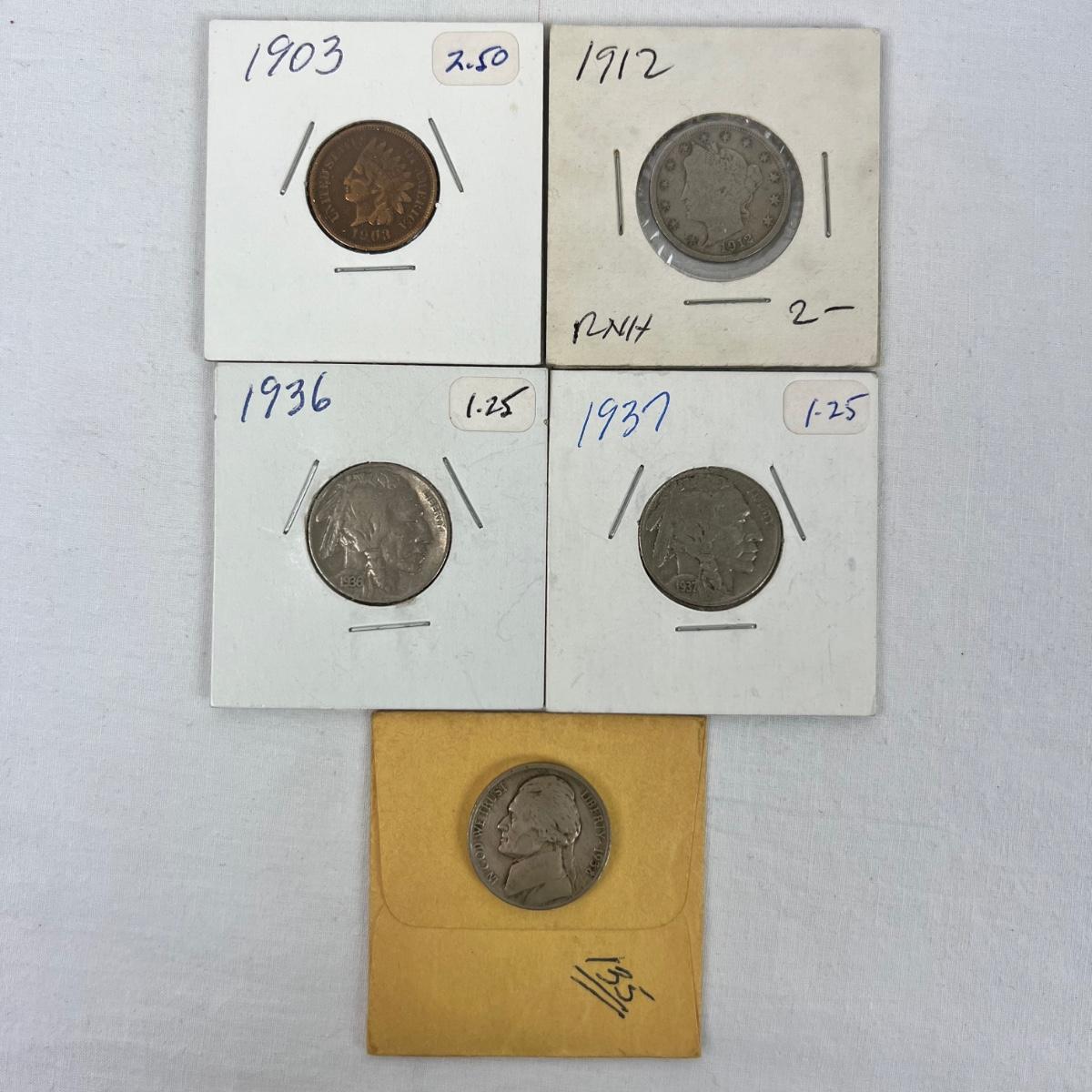 672 1903 Indian Head Penny/ 1912 Liberty Head 5-Cents/ 1936,1937 Buffalo Nickels & 1938-D Jefferson Fine Dime