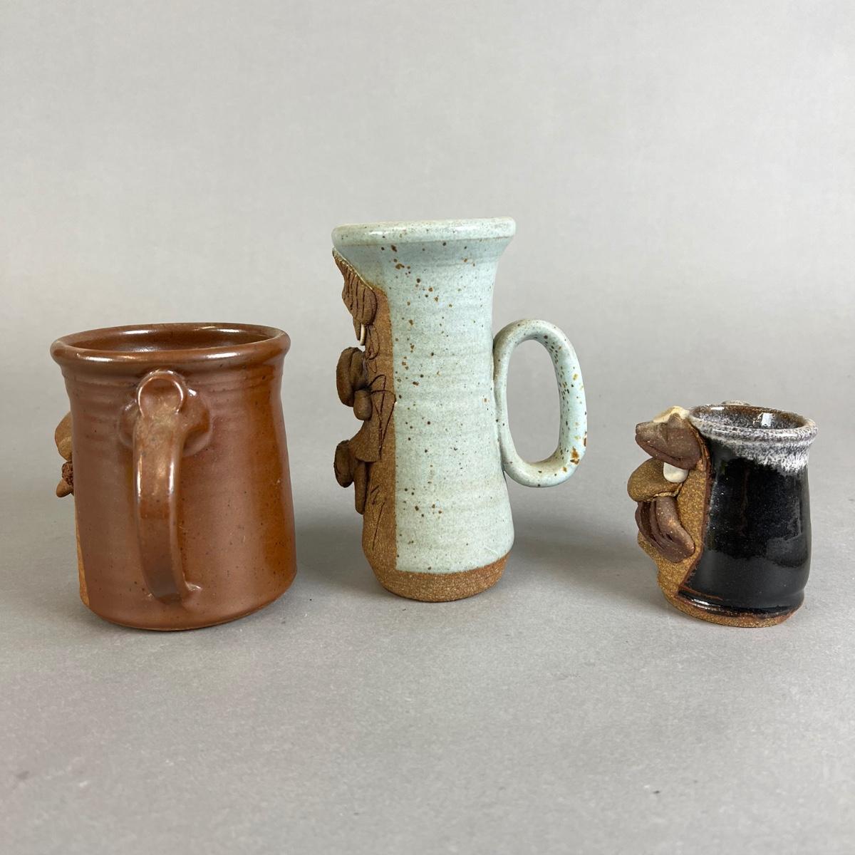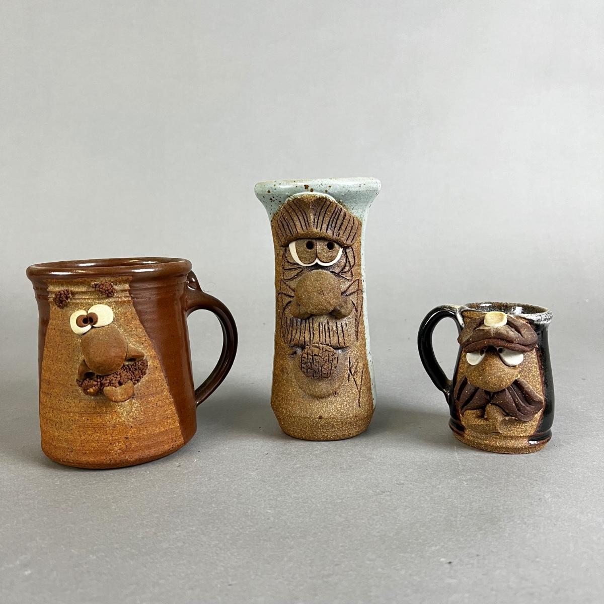 3 vintage handcrafted and hand painted funny face stoneware pottery mugs signed K.S. all mugs made around 1970.