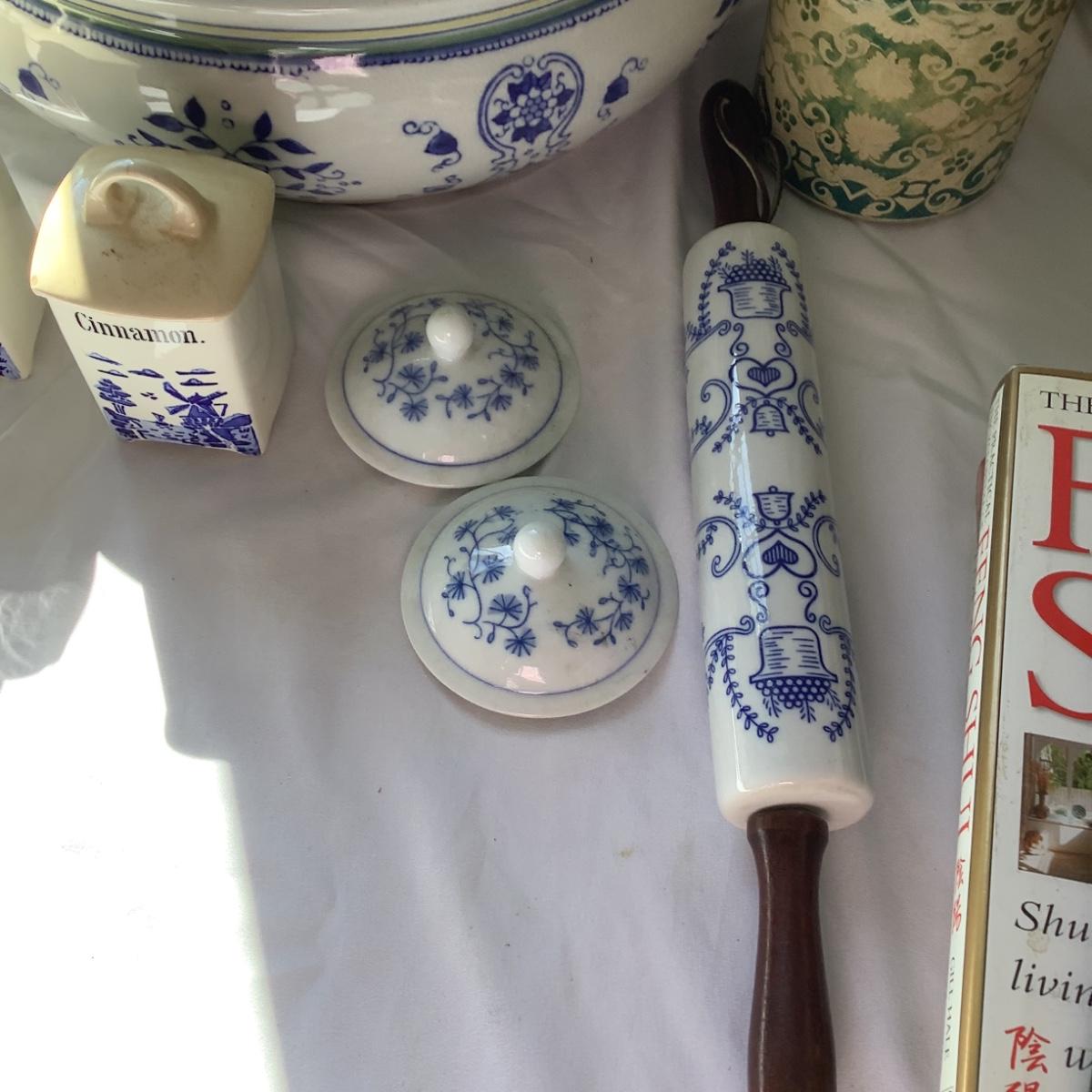 The lot contains spice jars, rolling pin, vintage delft tin cannister and a large blue and white planter 14" d.
