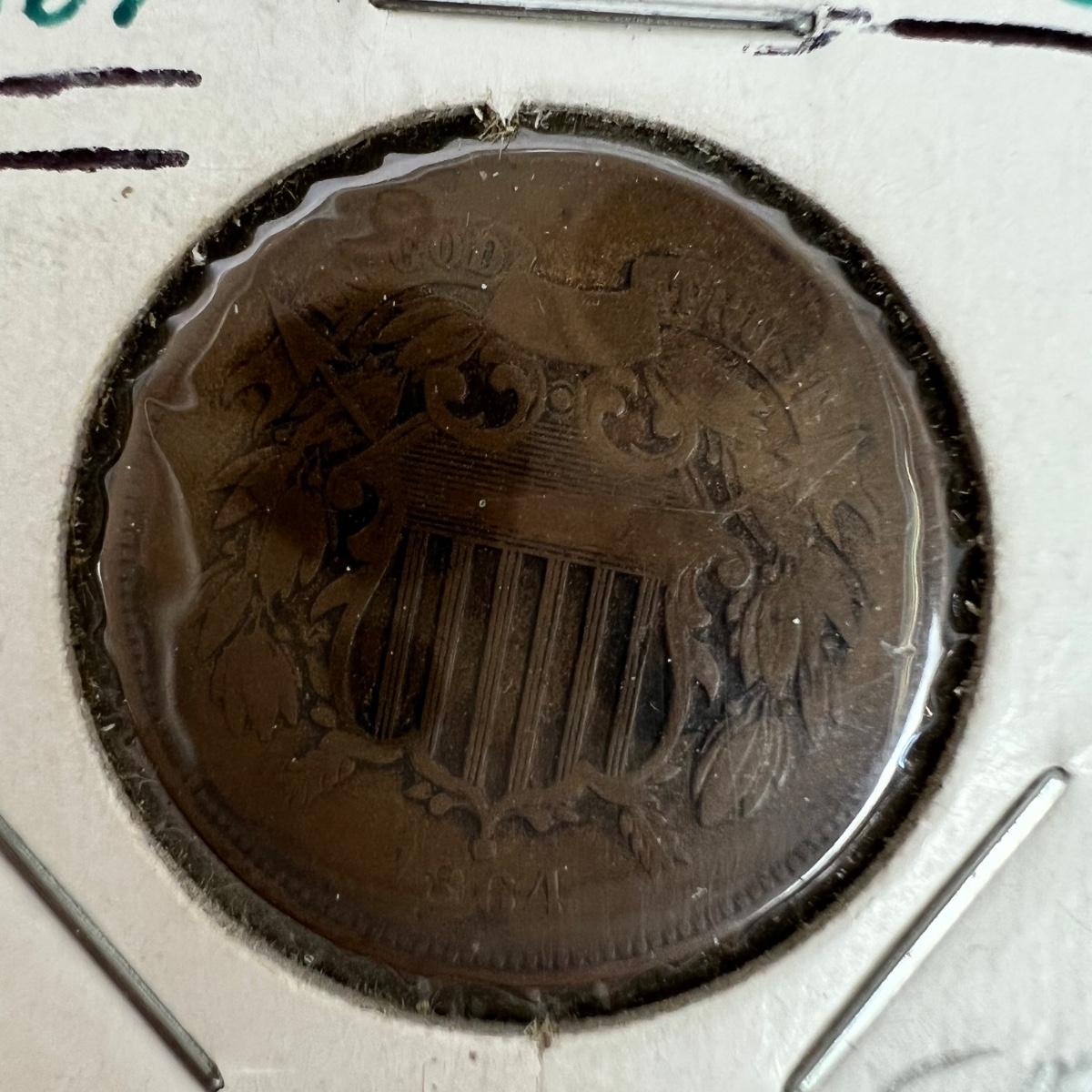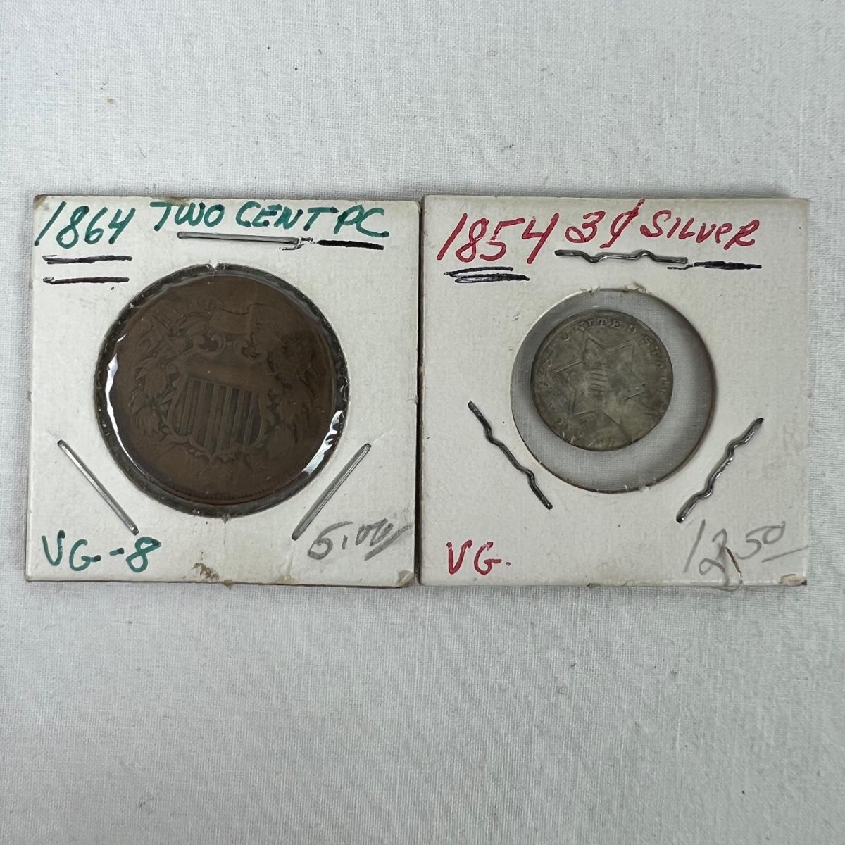 674  1854 3-Cent U.S. Silver Coin VG & 1864 2-Cent U.S. Coin VG-8 Condition.