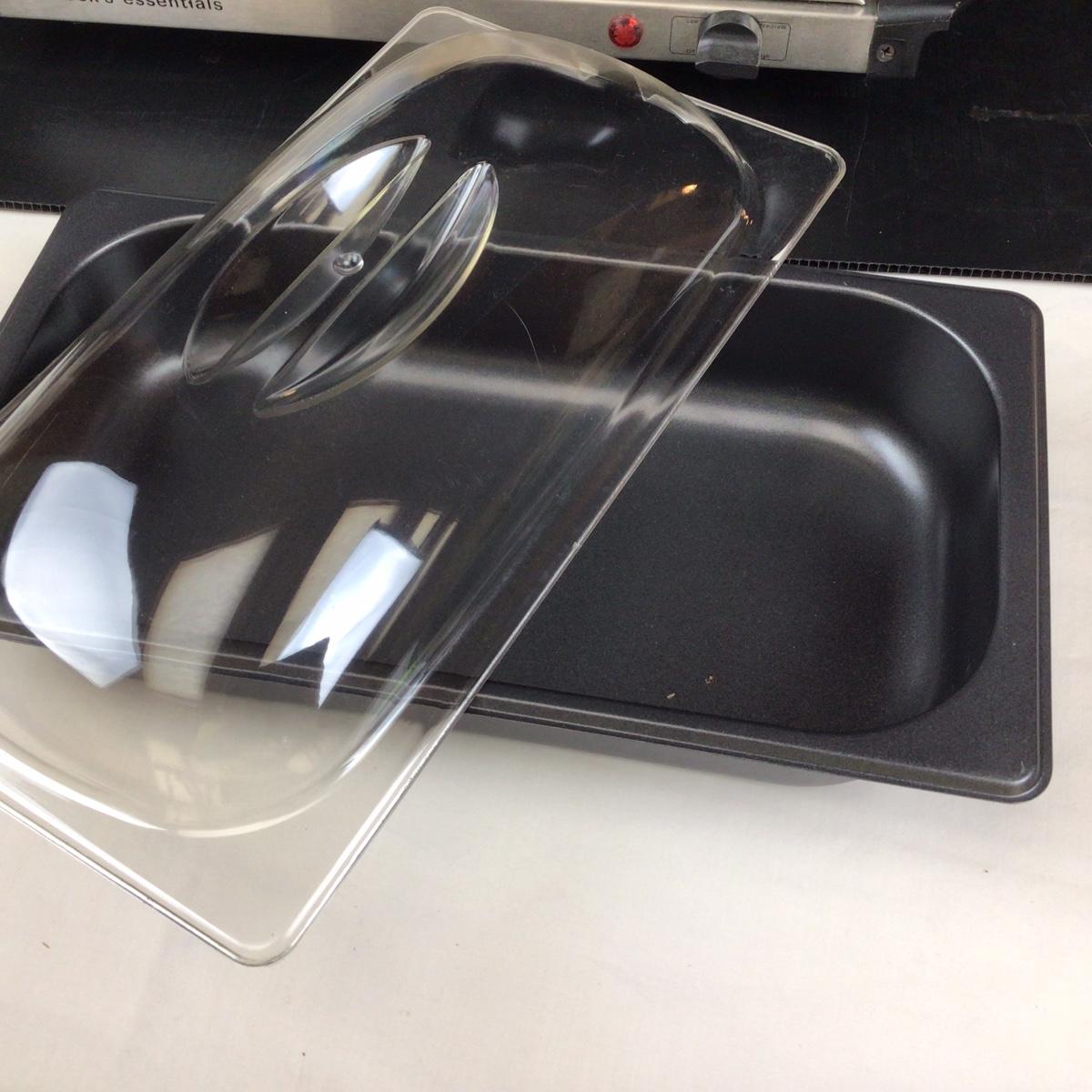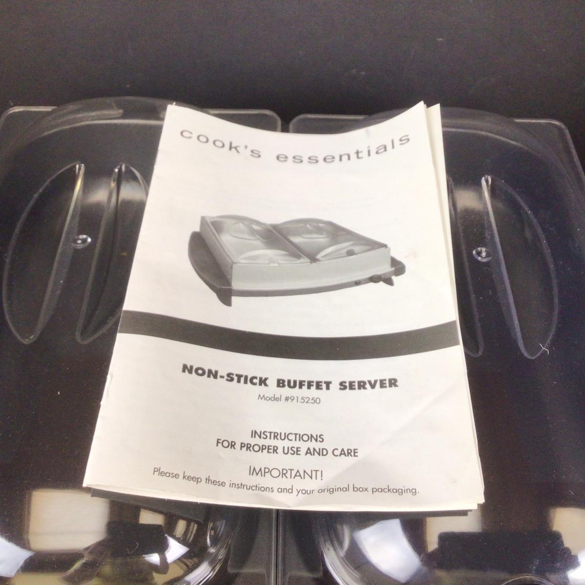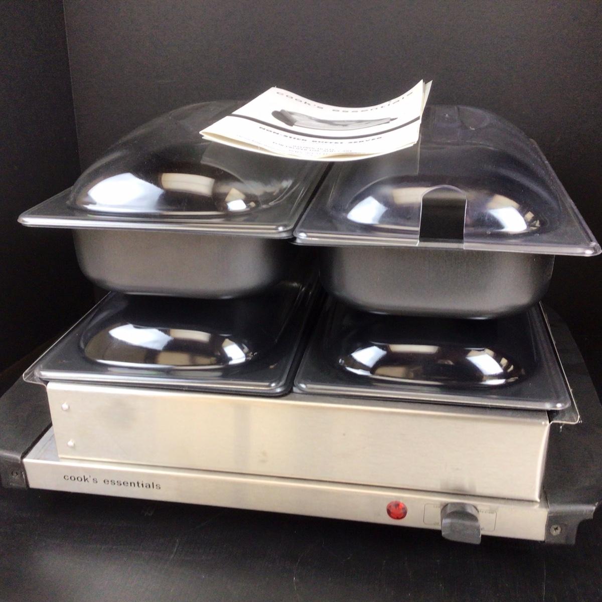Buffet is stainless steel 5 quart and has 2 sections for serving and 2 additional containers for replenishing the buffet.