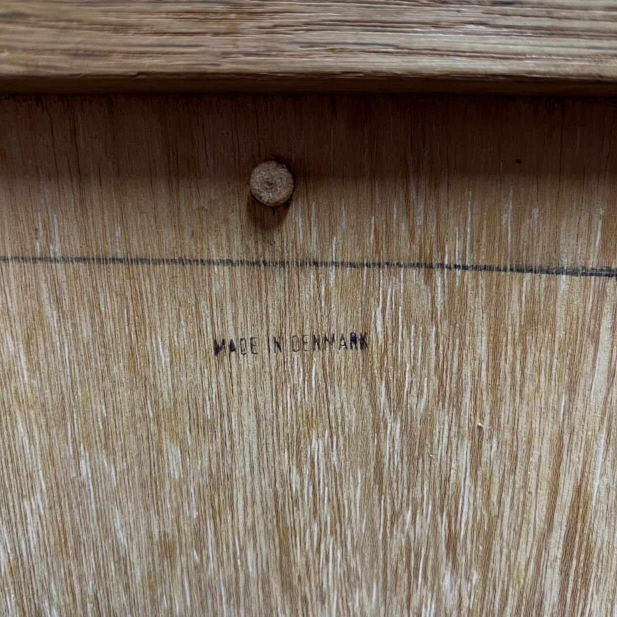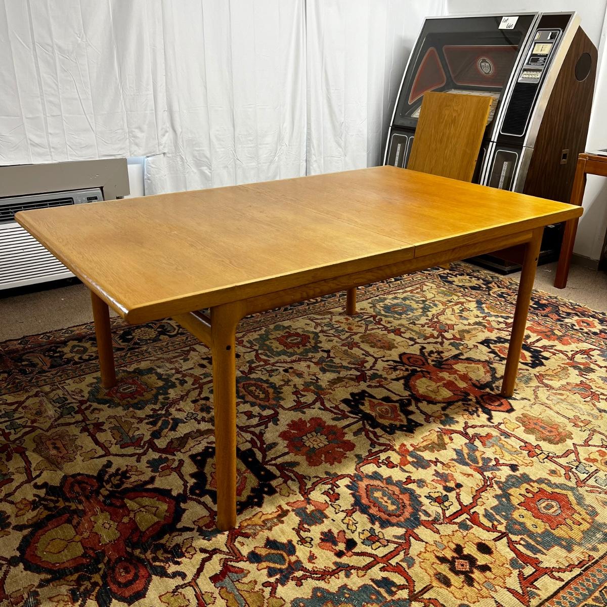 Dining table is marked made in Denmark, comes with one leaf you insert into the middle of the table, with the lead added the table measures 7' 2".