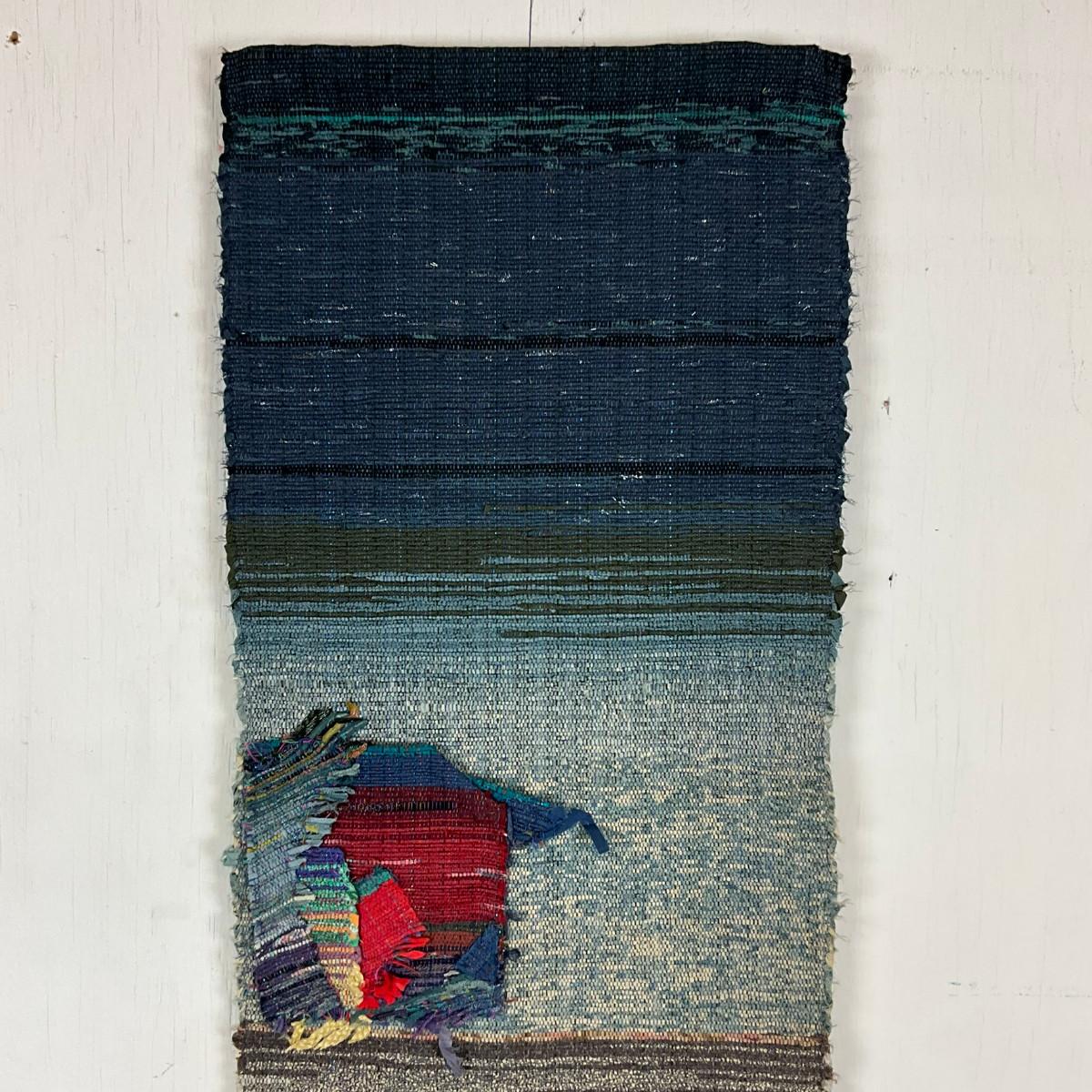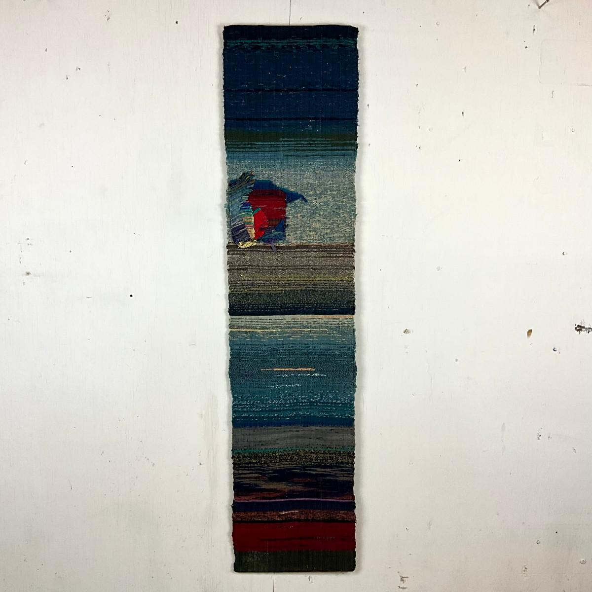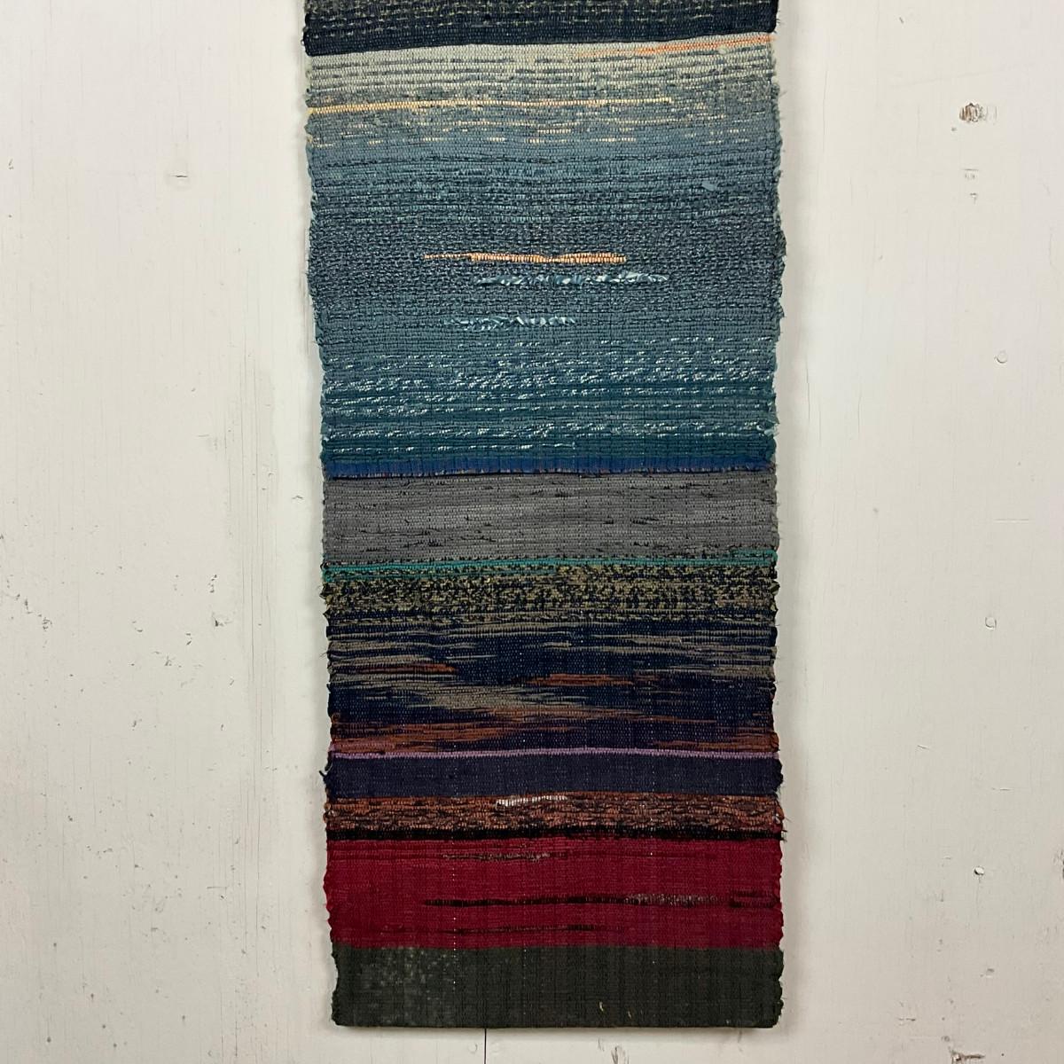 Signed handwoven fiber art wall hanging by K. Olesen Dalse, likely Scandinavian, mid to late 20th century. Abstract modernist composition featuring interwoven yarns in layered horizontal bands of blue, red, gray, and earth tones. Woven signature incorporated into the textile. A strong example of Nordic modern fiber art suitable for wall display.