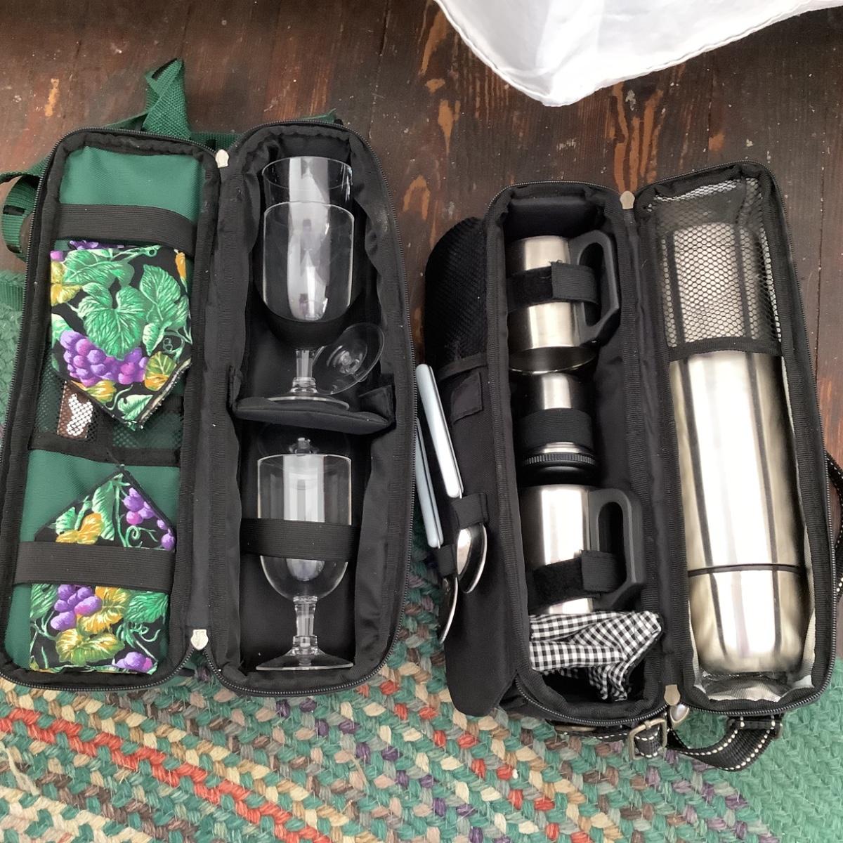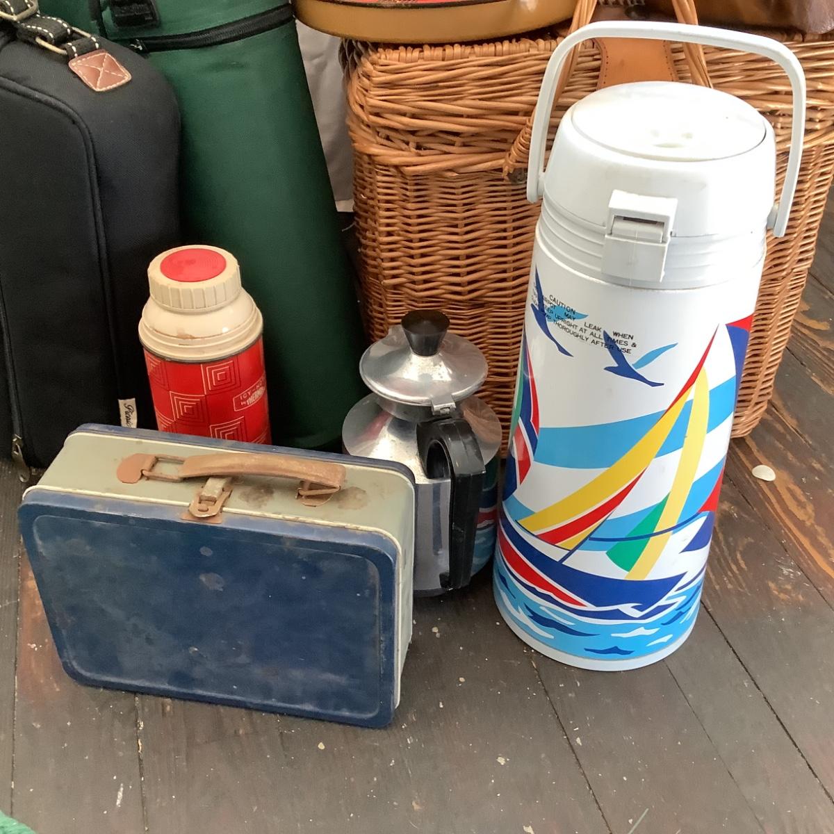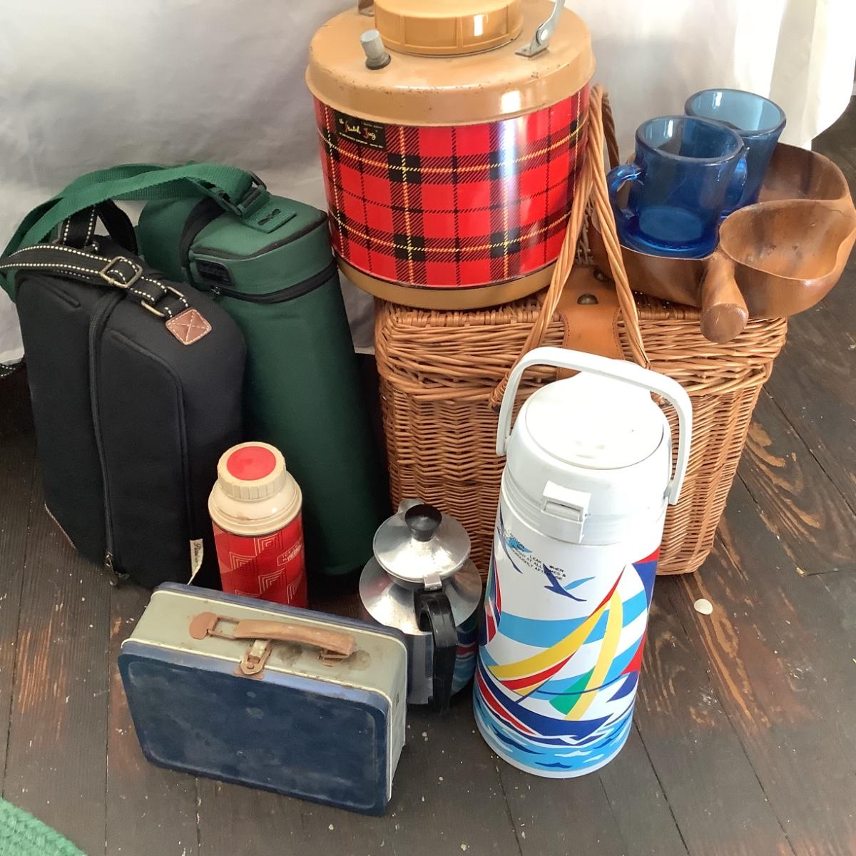 Lot contains baskets, wine sets, thermos, lunchbox and more.