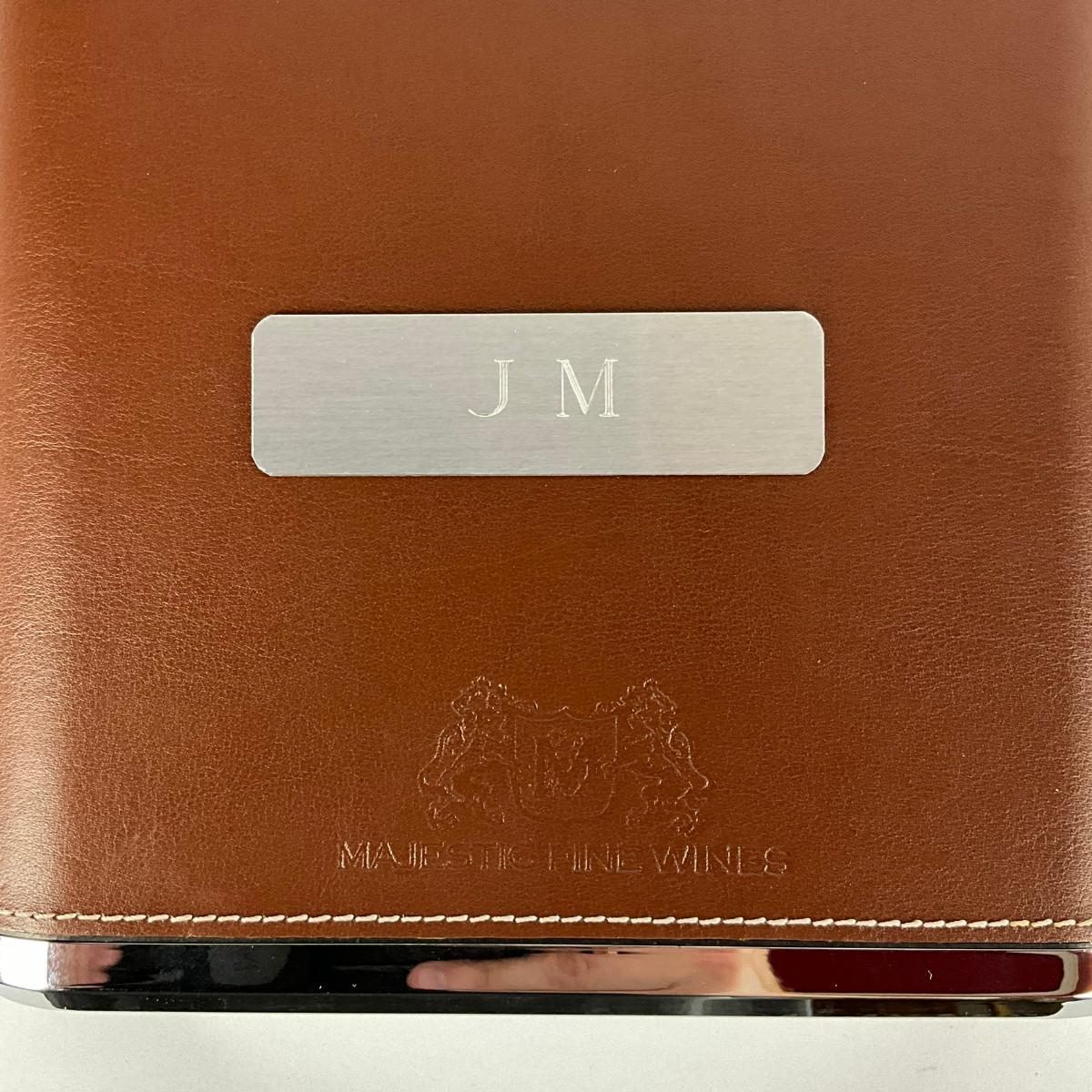 Bottle kit is designed with leather, marked "J.M." and " Majestic Fine Wines"