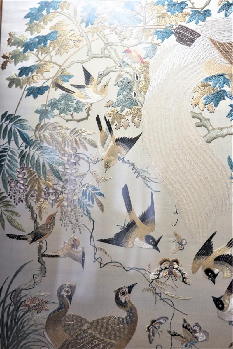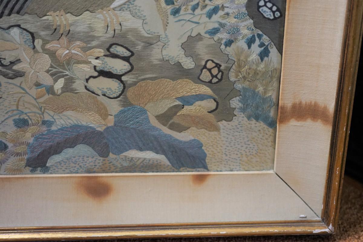 The matting around the silk has staining. The silk seems to be untouched in most of the piece. Some smaller areas do have staining from age or sun exposure fade. Made need restoration or display as is. It will need to be reframed.