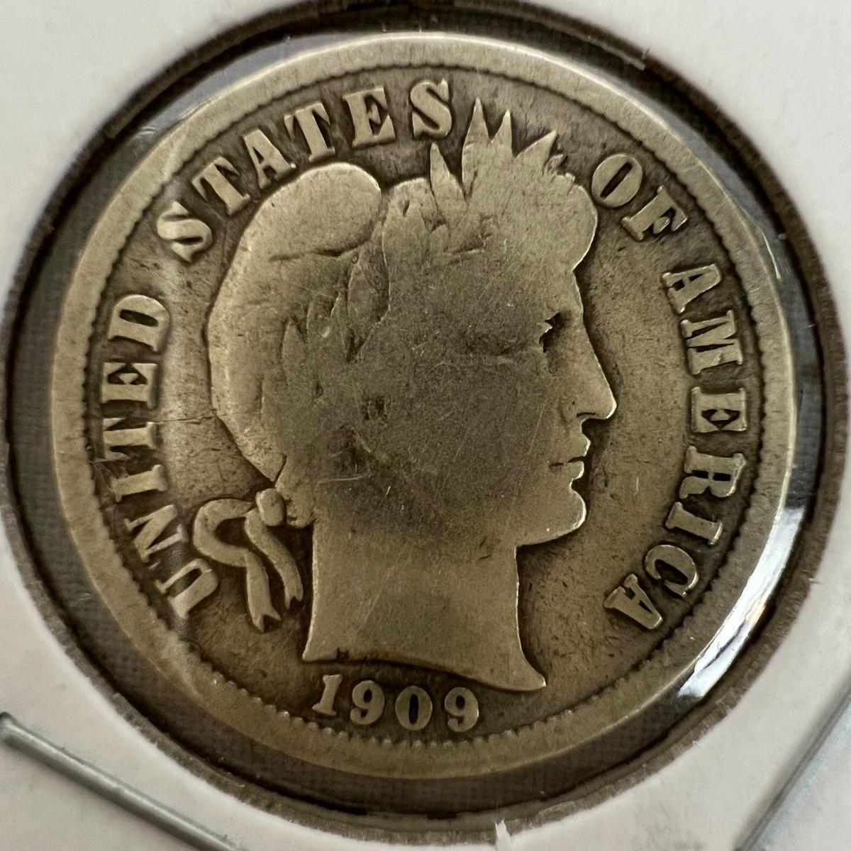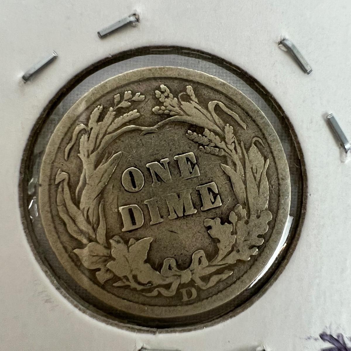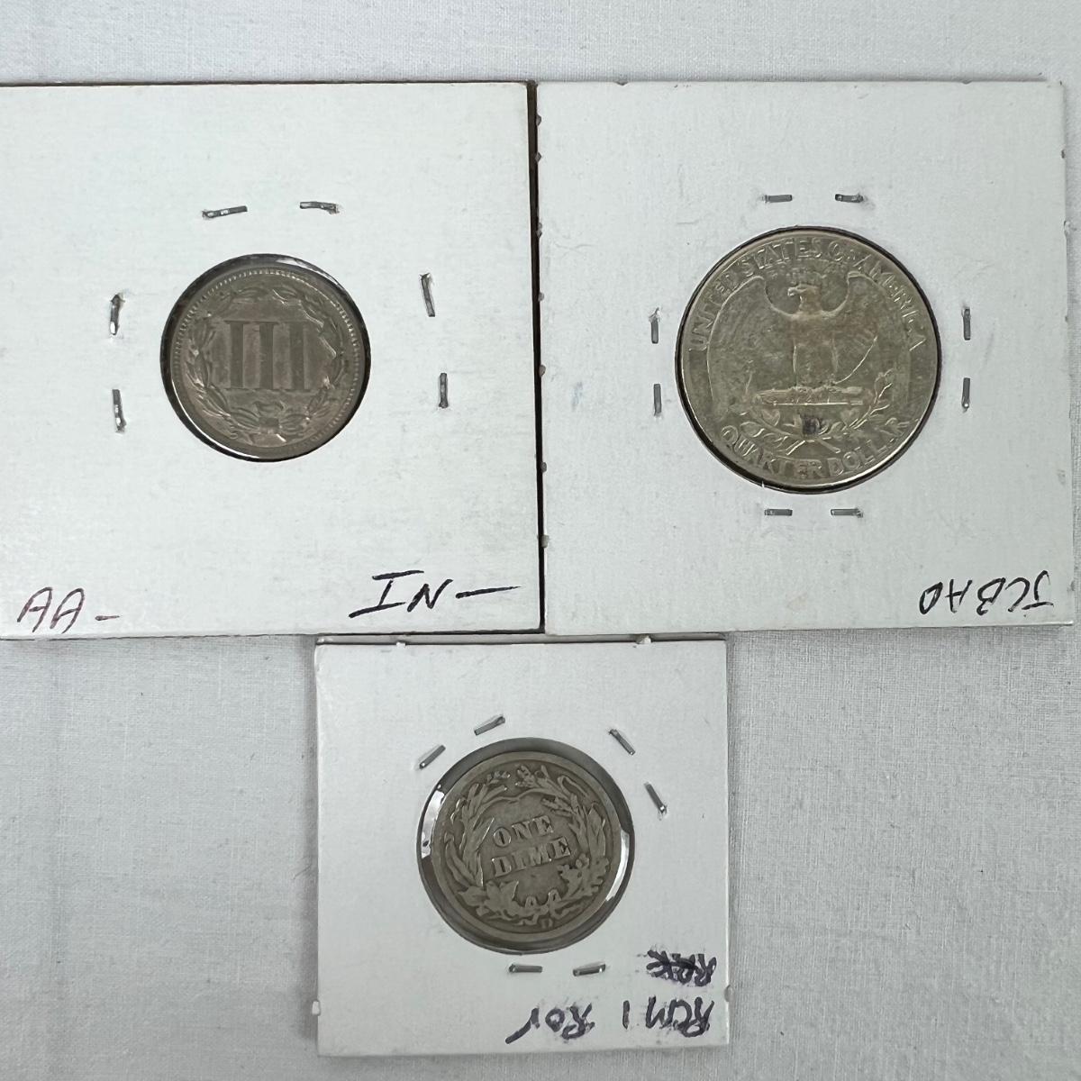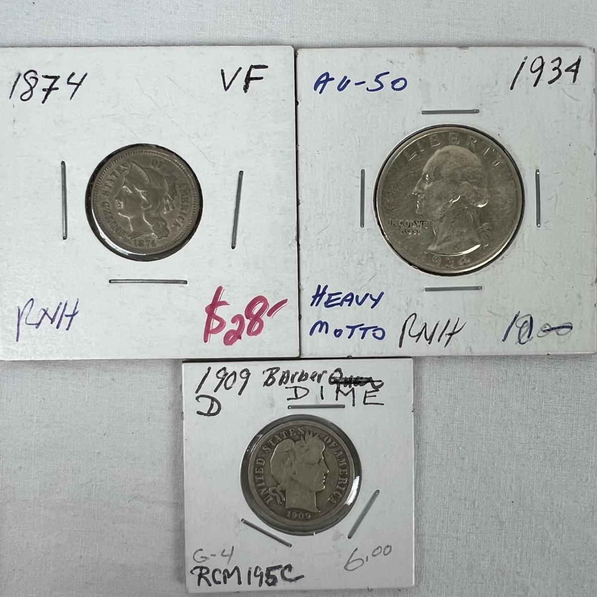 677 1874 Liberty Head 3-Cents VF AA- IN-/ 1909-D Barber Dime G-4 RCM195-C & 1934 Washington Quarter AU-50 w/ Heavy Motto