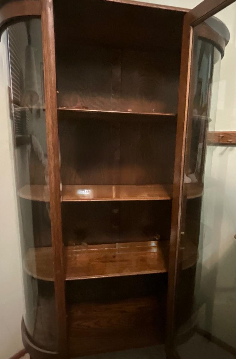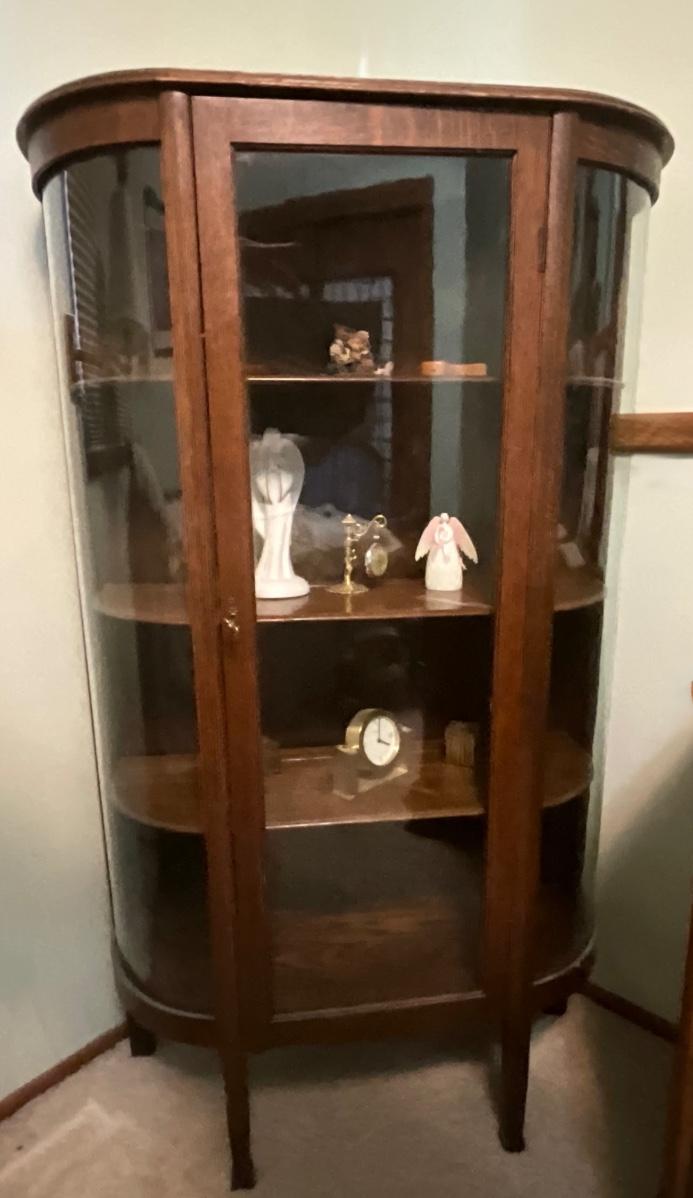 Antique Oak Curio Cabinet with curved glass panels, includes key