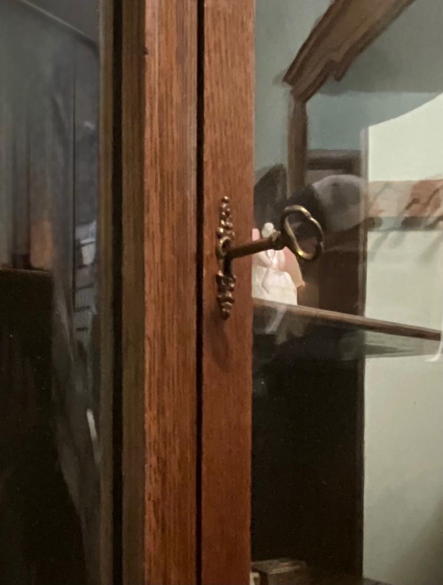 Beautiful well taken care of Oak antique curio cabinet with front door key, Items inside cabinet not for sale.