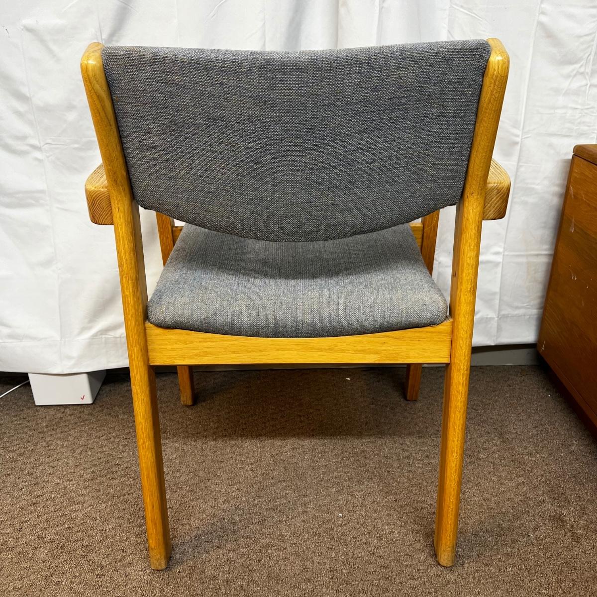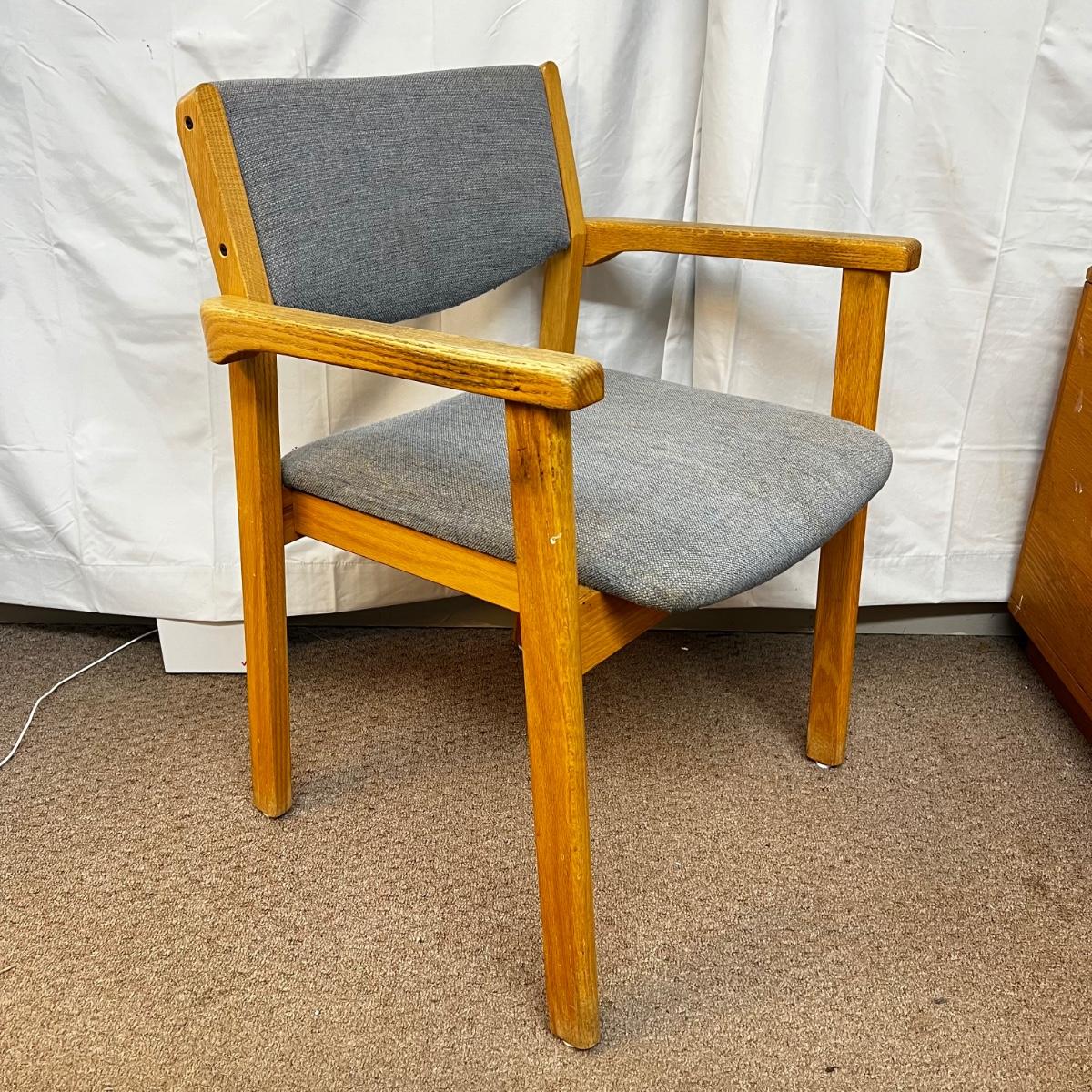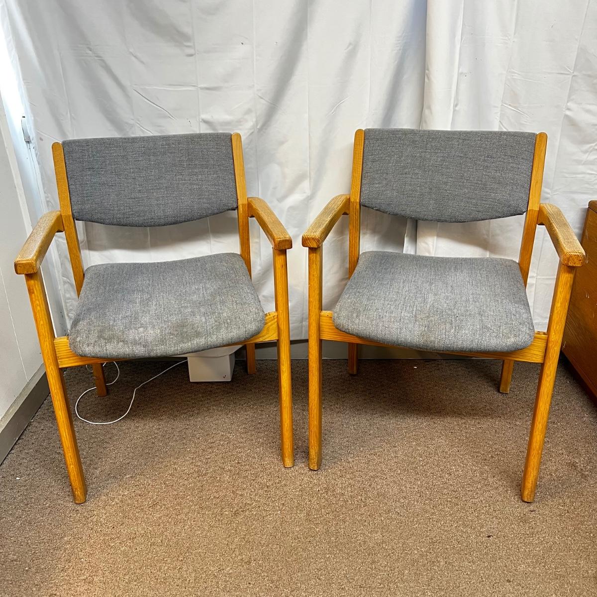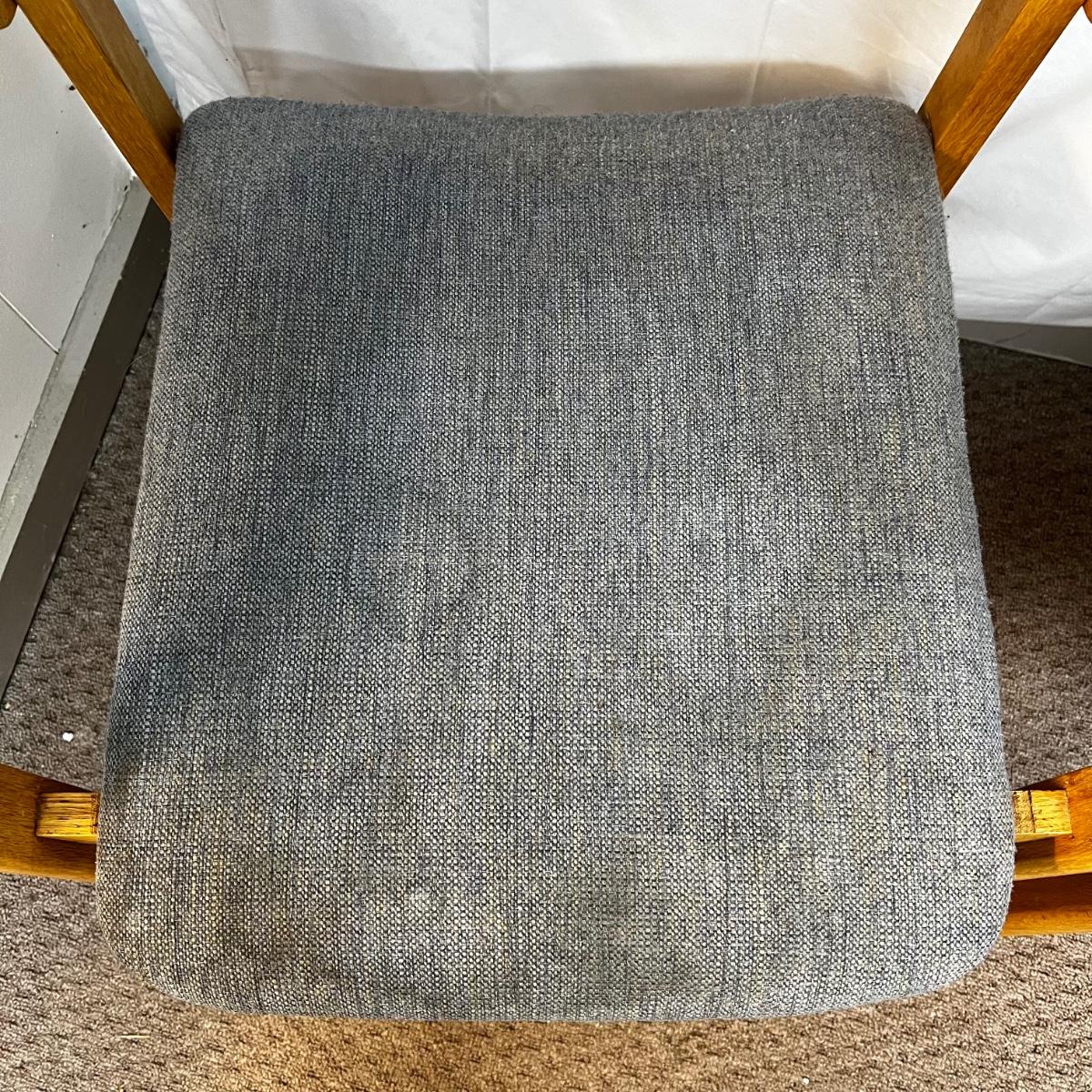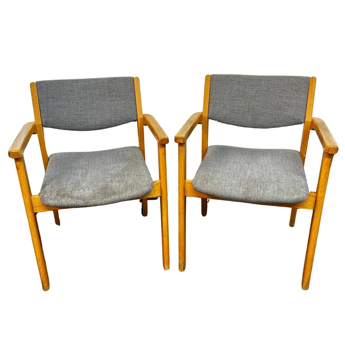 Pair of cushioned armchairs made from oak, fabric seat cushions have stains (see photos). Seat height 15.75" and seat depth 17.25"