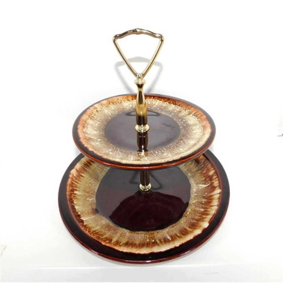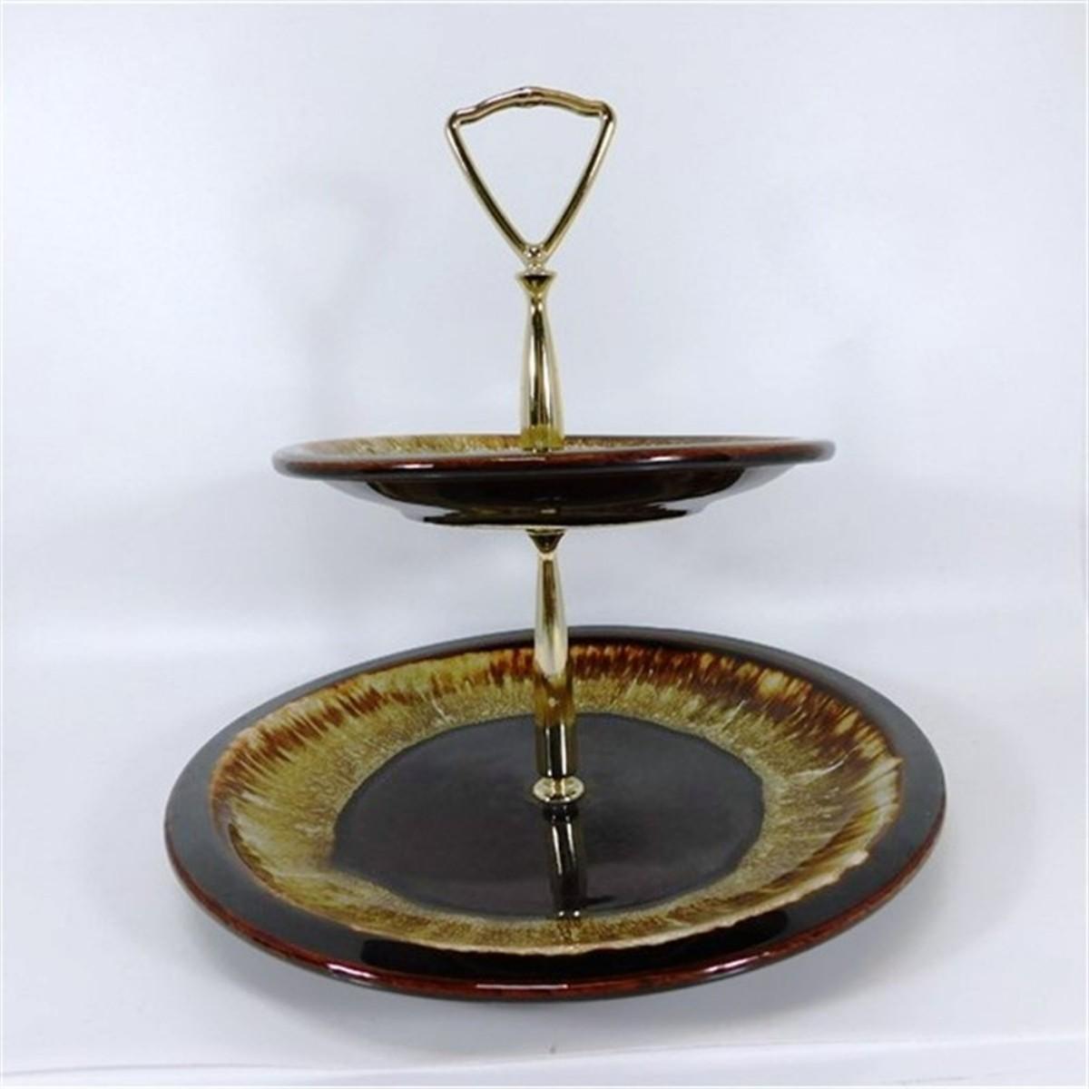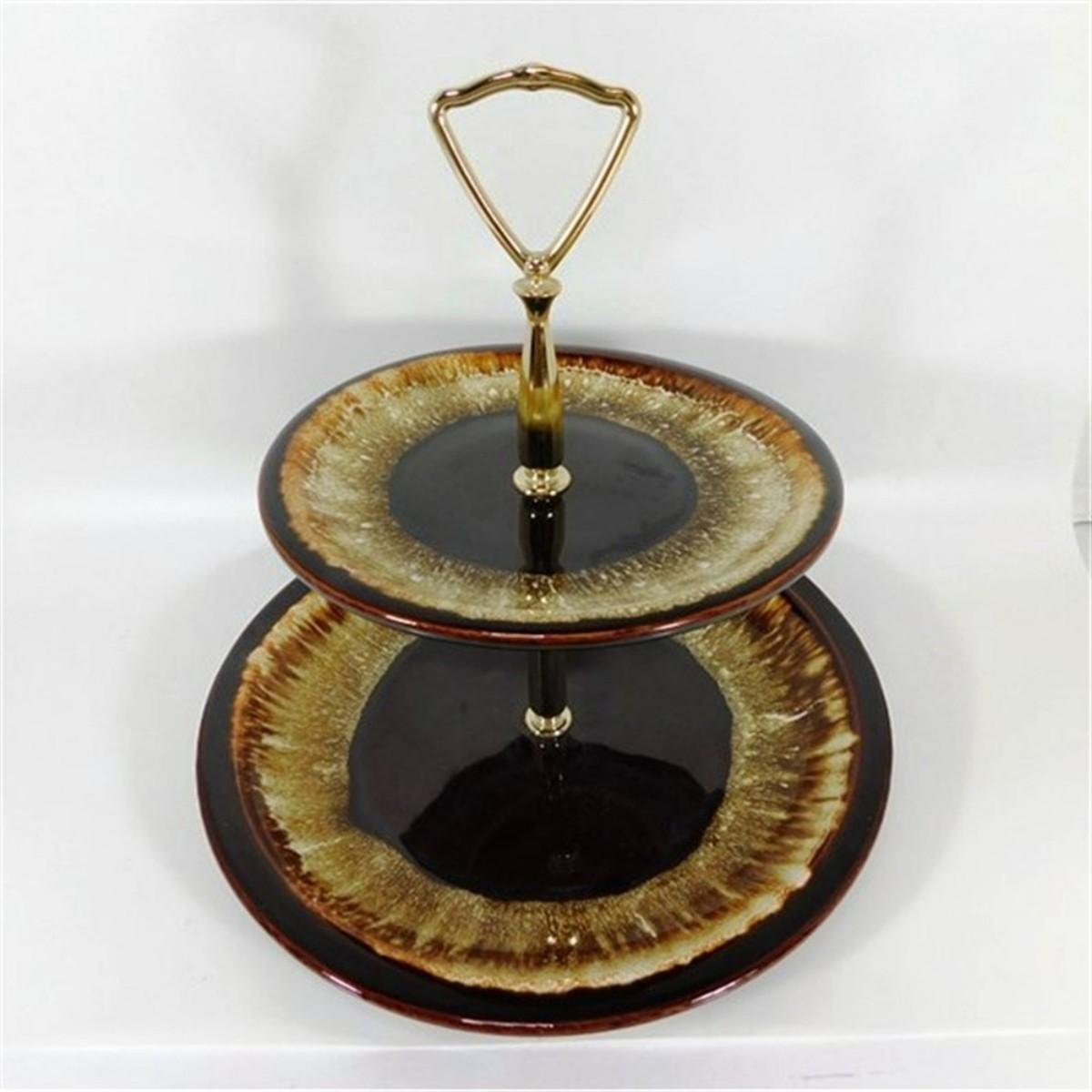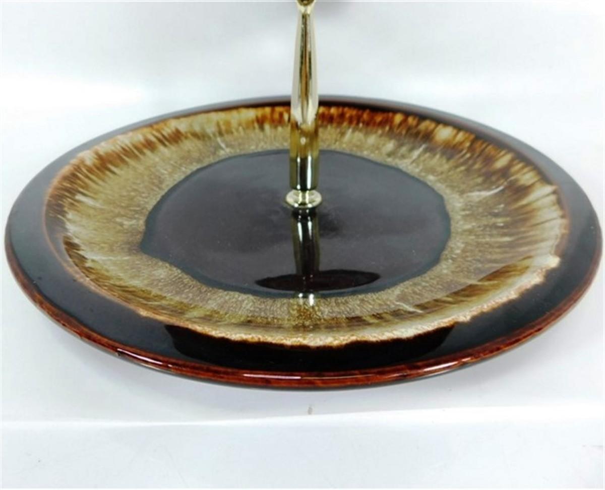 68 9" Pfaltzgraff Pottery Brown Drip Glaze 2 Tier Serving Tray Brass Handle