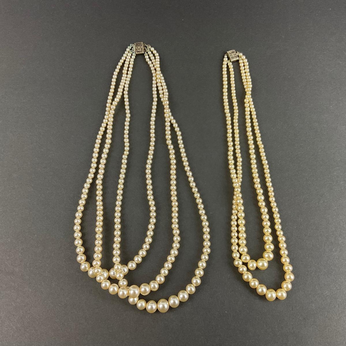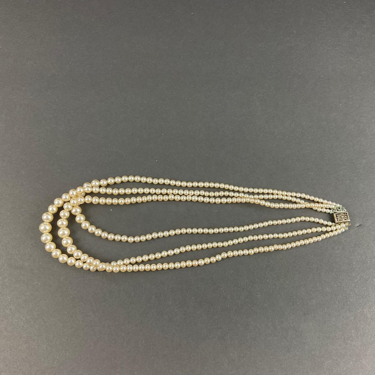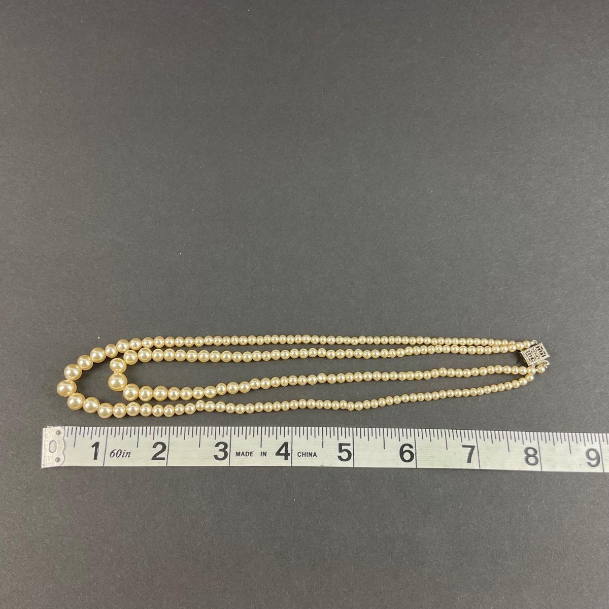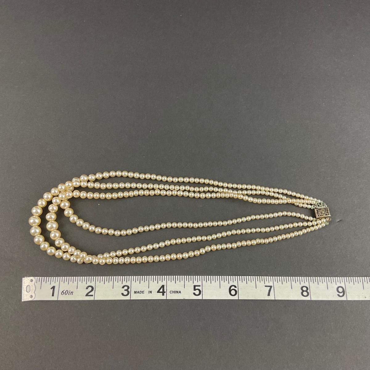 One three strand cream colored pearl necklace. And one two strand cream colored pearl necklace. Please see photos for details and condition. Any condition statement is given as a courtesy to a client, is an opinion, and should not be treated as a statement of fact. Reference to condition written, oral or within a condition report shall not be regarded as a full account of condition and may not include all defects, alterations, or restorations. Absence of a condition report does not imply a lot is flawless or lacking imperfections or damage. Katherine’s Auction & Appraisal Service shall have no responsibility for any error or omission. Returns shall not be accepted on the basis of condition. ::: Shipping is available on this lot. If you require shipping you must let us know at the close of the auction. We will coordinate with you after the item has been won. Shipping fees will include insurance up to or exceeding the value of all items being mailed. If you have any questions regarding this lot please contact the auctioneer either via this website, by direct email or by phone. PICK UP TIMES and other important information can be found in the TERMS and DESCRIPTION of the auction. Please take a look for pertinent information. Thanks!