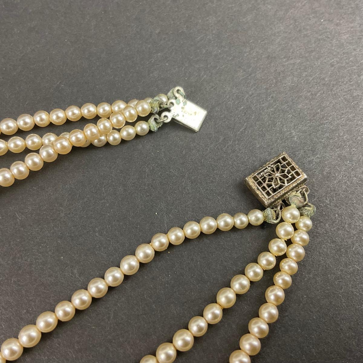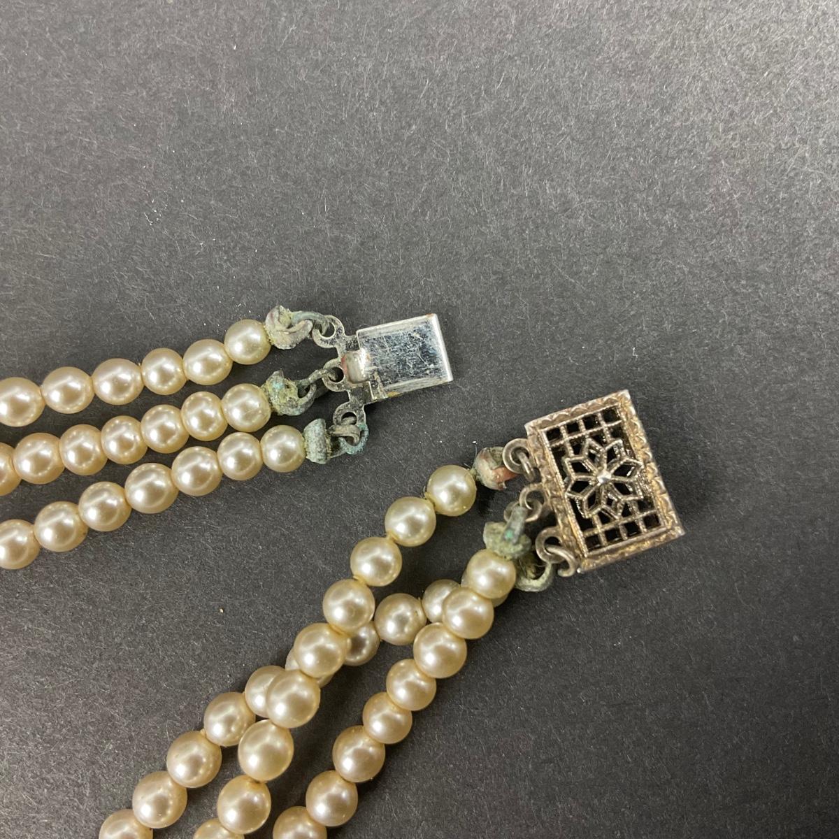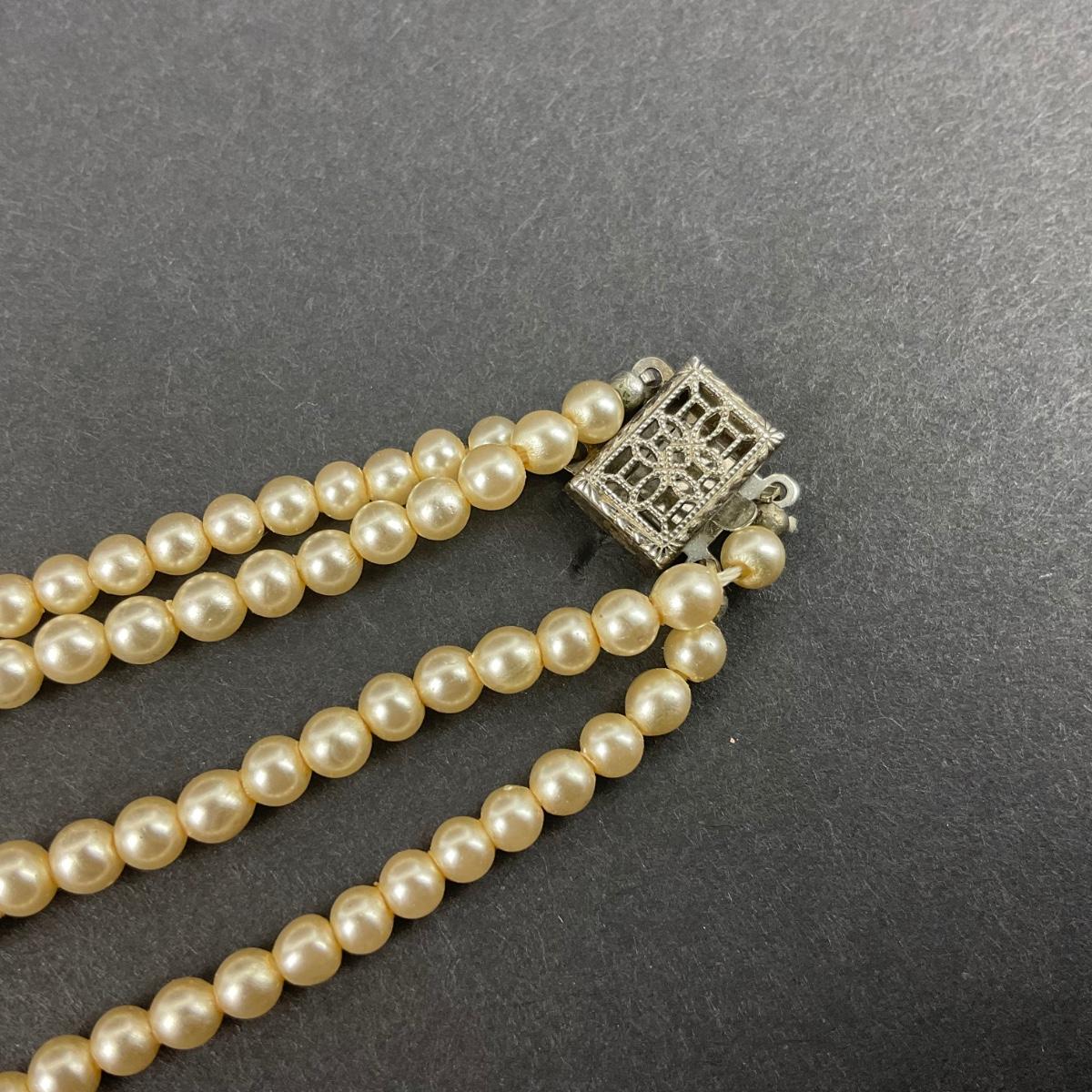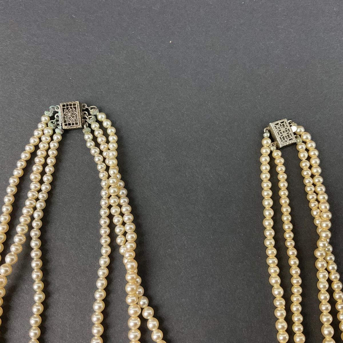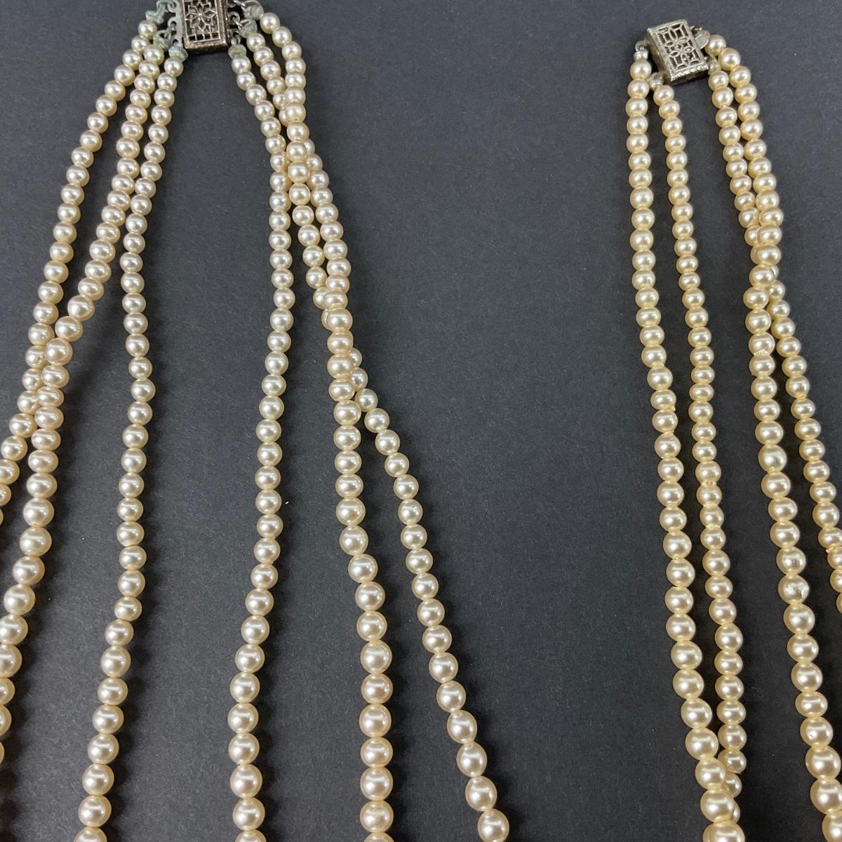 One three strand cream colored pearl necklace. And one two strand cream colored pearl necklace. Please see photos for details and condition. Any condition statement is given as a courtesy to a client, is an opinion, and should not be treated as a statement of fact. Reference to condition written, oral or within a condition report shall not be regarded as a full account of condition and may not include all defects, alterations, or restorations. Absence of a condition report does not imply a lot is flawless or lacking imperfections or damage. Katherine’s Auction & Appraisal Service shall have no responsibility for any error or omission. Returns shall not be accepted on the basis of condition. ::: Shipping is available on this lot. If you require shipping you must let us know at the close of the auction. We will coordinate with you after the item has been won. Shipping fees will include insurance up to or exceeding the value of all items being mailed. If you have any questions regarding this lot please contact the auctioneer either via this website, by direct email or by phone. PICK UP TIMES and other important information can be found in the TERMS and DESCRIPTION of the auction. Please take a look for pertinent information. Thanks!