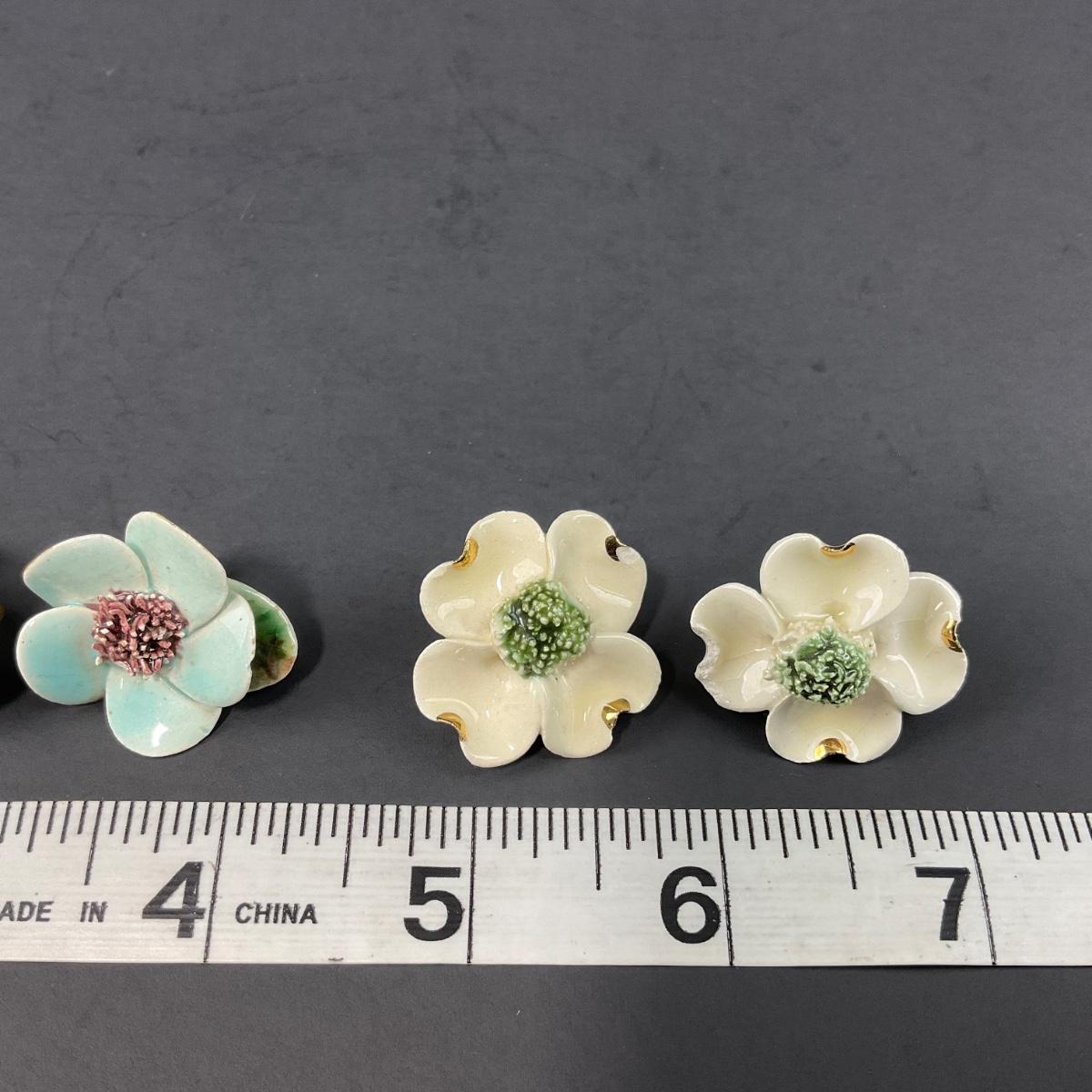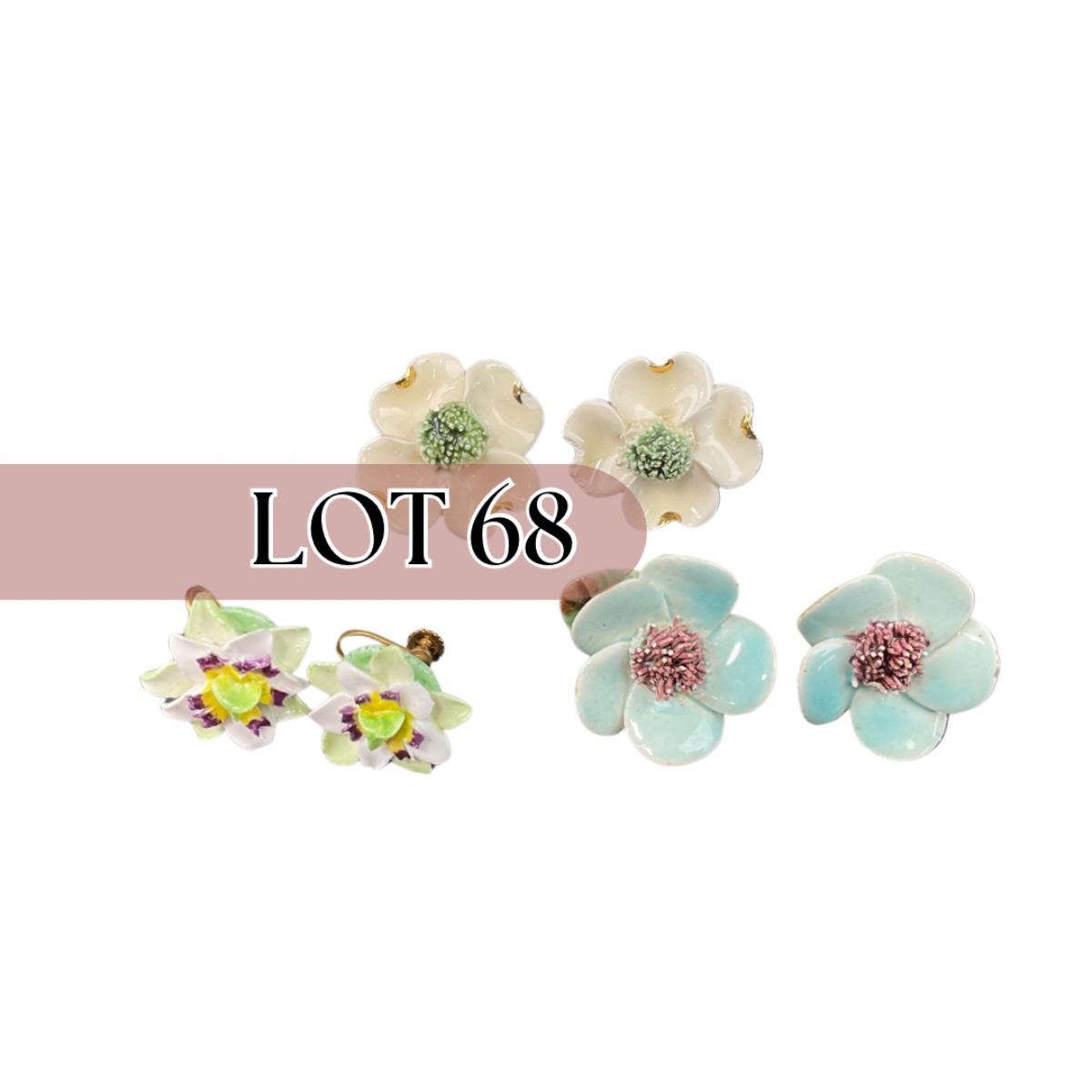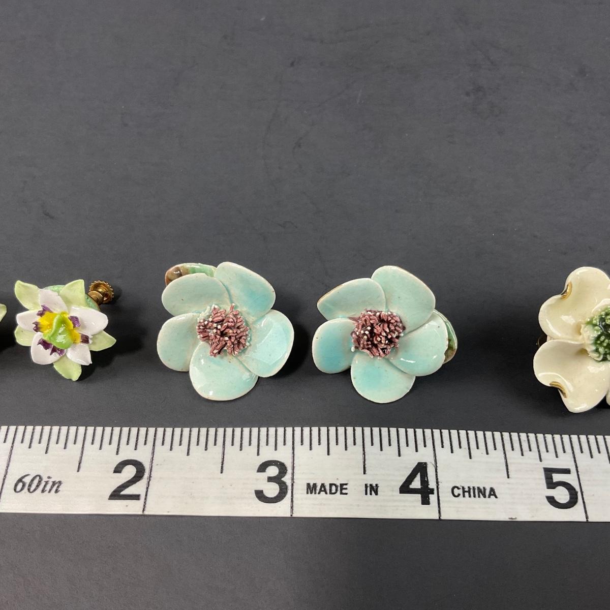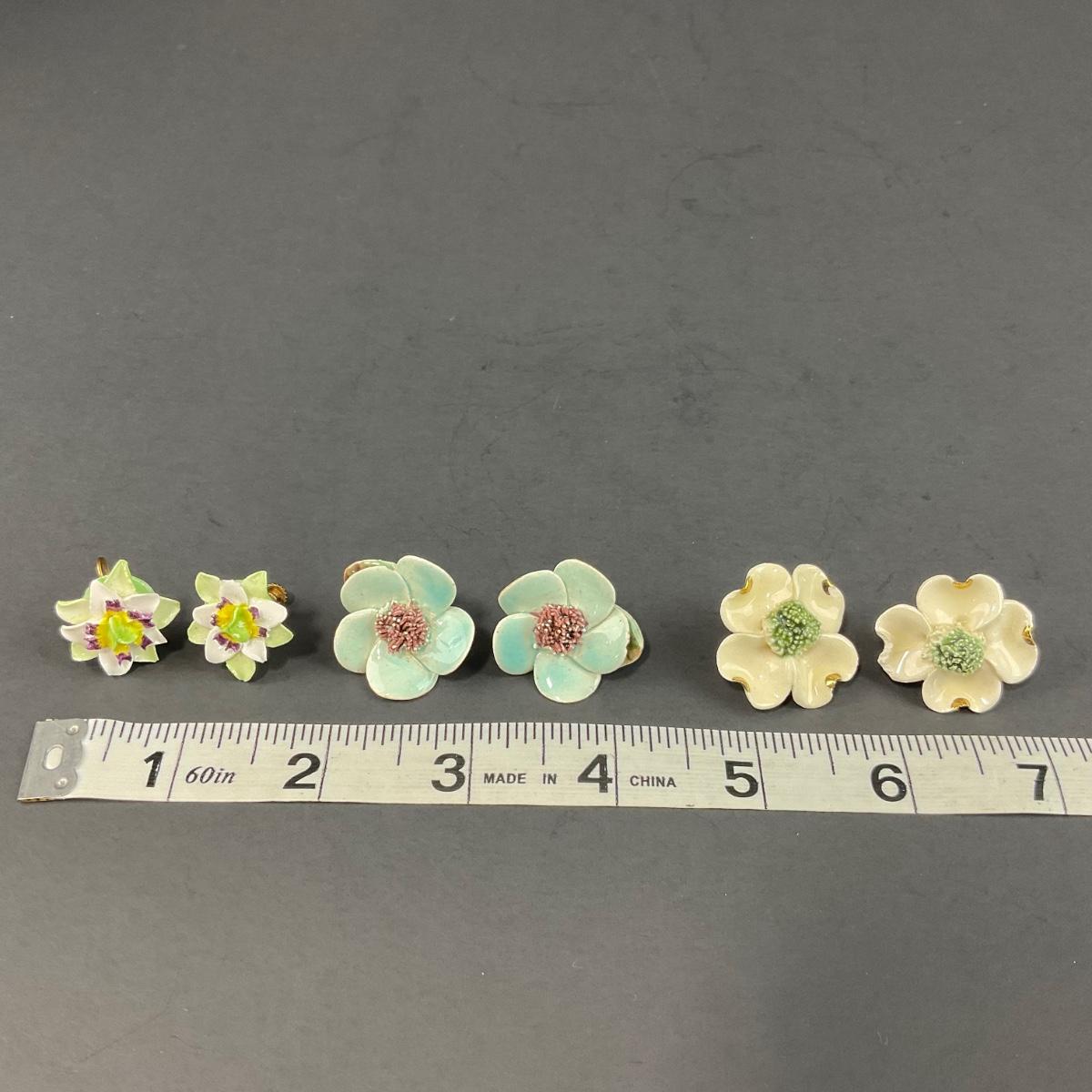Three pair of vintage porcelain post earrings. All pairs have some slight chipping and damage. Please see photos for details and condition. Any condition statement is given as a courtesy to a client, is an opinion, and should not be treated as a statement of fact. Reference to condition written, oral or within a condition report shall not be regarded as a full account of condition and may not include all defects, alterations, or restorations. Absence of a condition report does not imply a lot is flawless or lacking imperfections or damage. Katherine’s Auction & Appraisal Service shall have no responsibility for any error or omission. Returns shall not be accepted on the basis of condition. ::: Shipping is available on this lot. If you require shipping you must let us know at the close of the auction. We will coordinate with you after the item has been won. Shipping fees will include insurance up to or exceeding the value of all items being mailed. If you have any questions regarding this lot please contact the auctioneer either via this website, by direct email or by phone. PICK UP TIMES and other important information can be found in the TERMS and DESCRIPTION of the auction. Please take a look for pertinent information. Thanks!