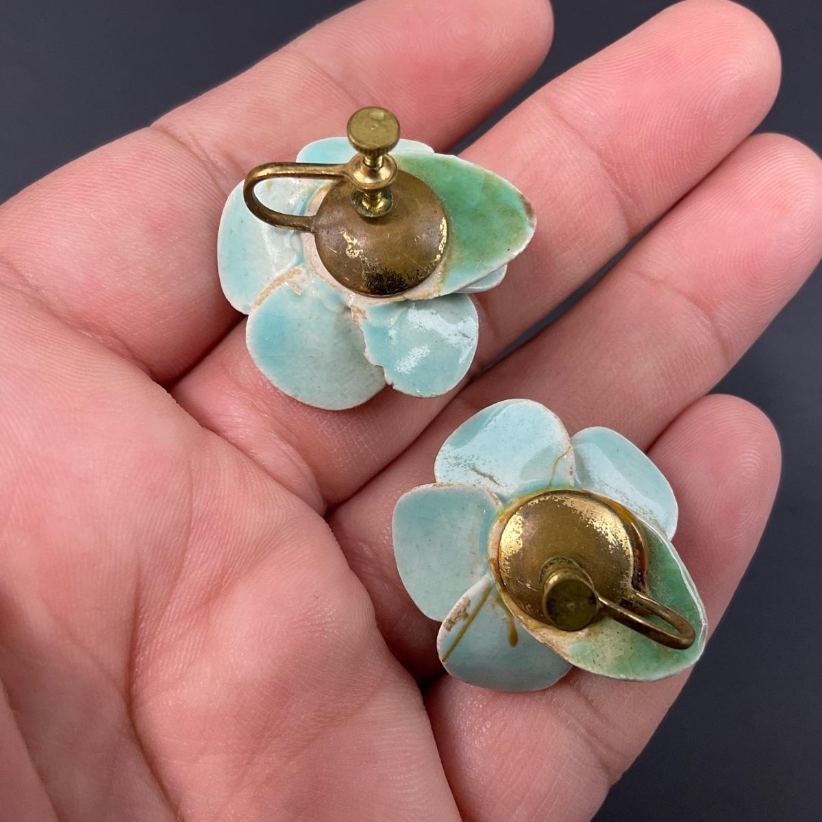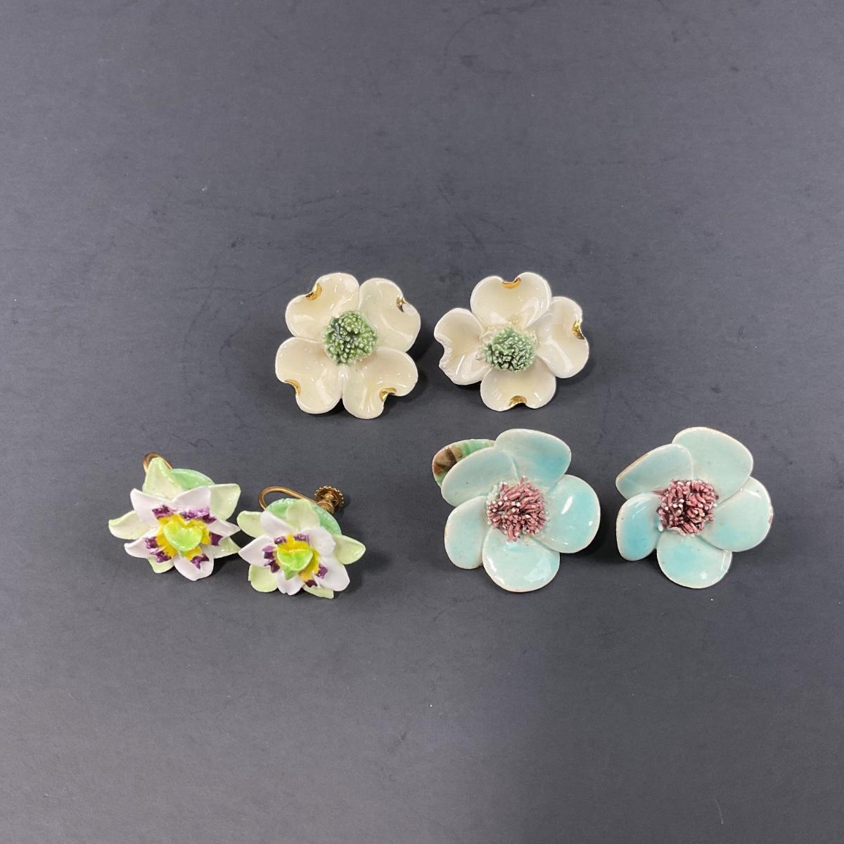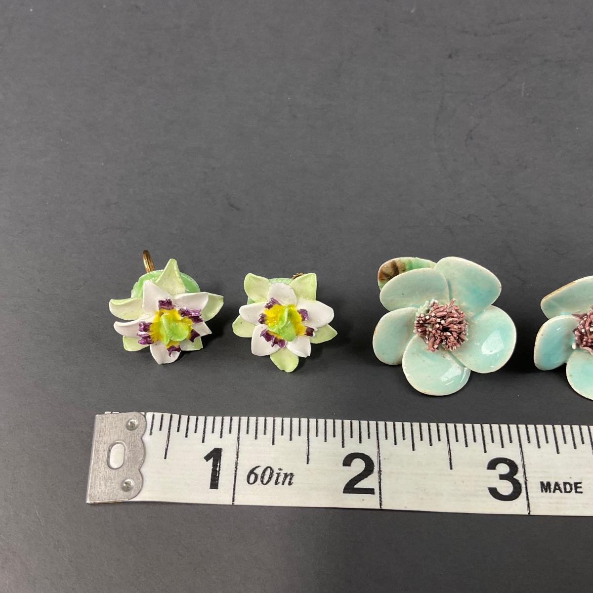 Three pair of vintage porcelain post earrings. All pairs have some slight chipping and damage. Please see photos for details and condition. Any condition statement is given as a courtesy to a client, is an opinion, and should not be treated as a statement of fact. Reference to condition written, oral or within a condition report shall not be regarded as a full account of condition and may not include all defects, alterations, or restorations. Absence of a condition report does not imply a lot is flawless or lacking imperfections or damage. Katherine’s Auction & Appraisal Service shall have no responsibility for any error or omission. Returns shall not be accepted on the basis of condition. ::: Shipping is available on this lot. If you require shipping you must let us know at the close of the auction. We will coordinate with you after the item has been won. Shipping fees will include insurance up to or exceeding the value of all items being mailed. If you have any questions regarding this lot please contact the auctioneer either via this website, by direct email or by phone. PICK UP TIMES and other important information can be found in the TERMS and DESCRIPTION of the auction. Please take a look for pertinent information. Thanks!