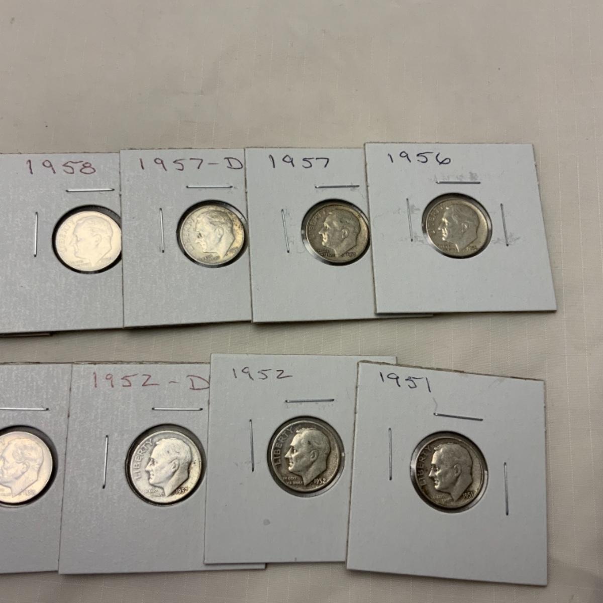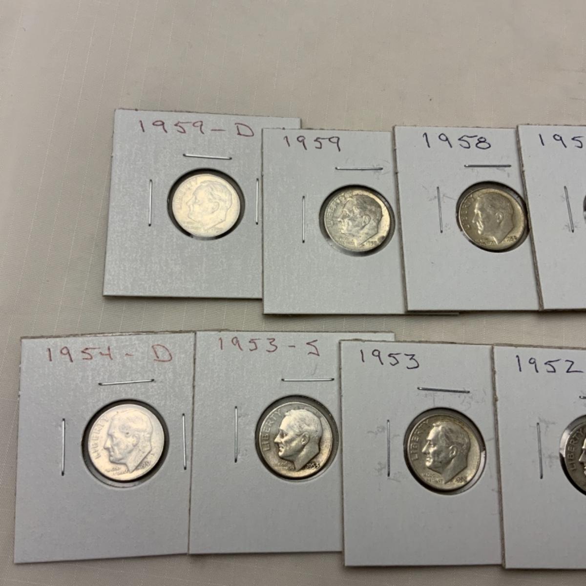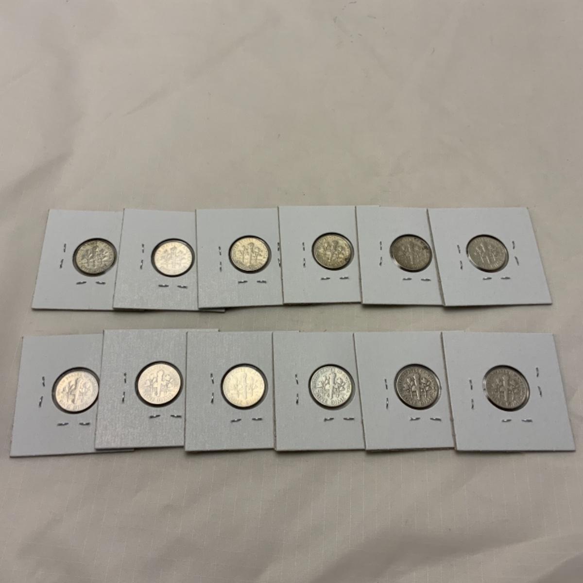 Twelve Roosevelt Dimes dated 1951 to 1959. Various Mint Marks, Several AU+. Please see photos for details and condition. ::: Shipping is available on this lot. If you require shipping you must let us know at the close of the auction. We will coordinate with you after the item has been won. Shipping fees will include insurance up to or exceeding the value of all items being mailed. If you have any questions regarding this lot please contact the auctioneer either via this website, by direct email or by phone. PICK UP TIMES and other important information can be found in the TERMS and DESCRIPTION of the auction. Please take a look for pertinent information. Thanks!