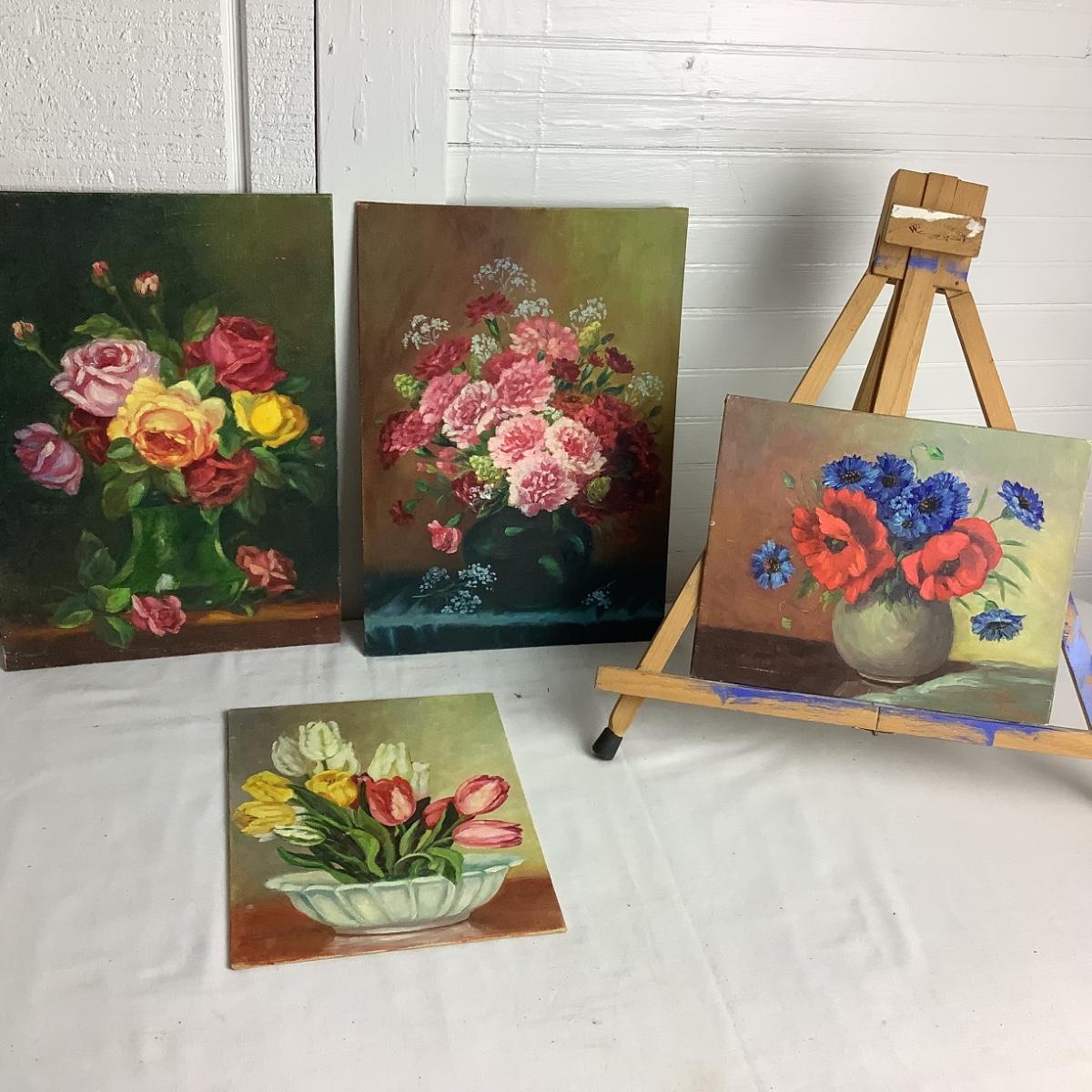 The lot contains a table top easel and 4 floral paintings by Gladys Freeman. The paintings are 14" x 9" and 8" x 10".