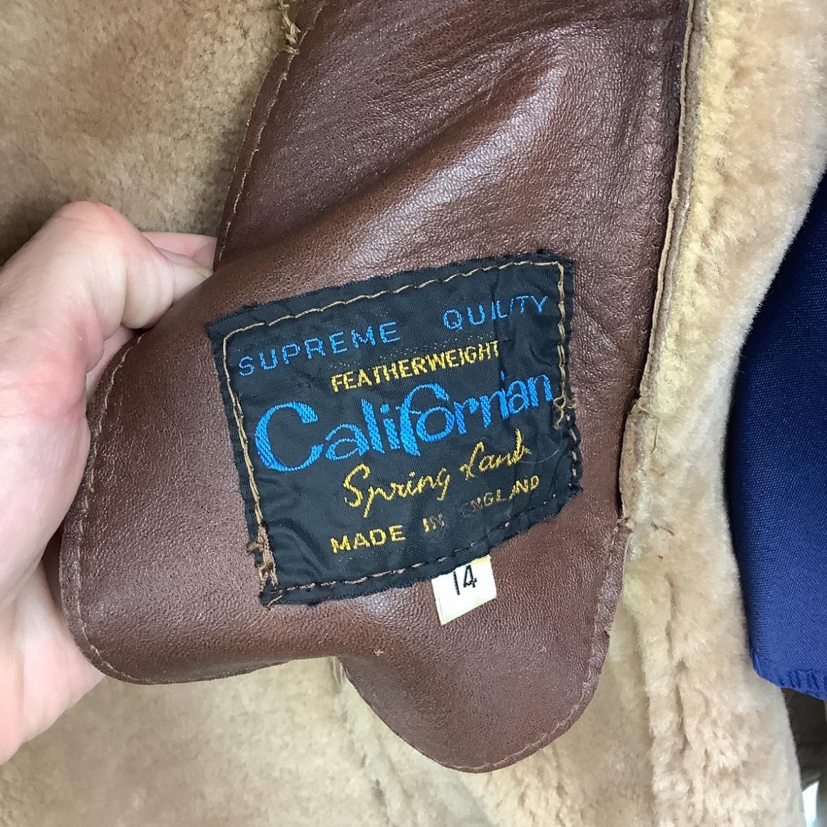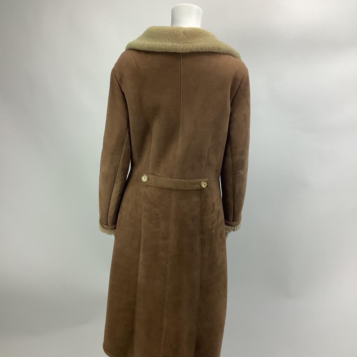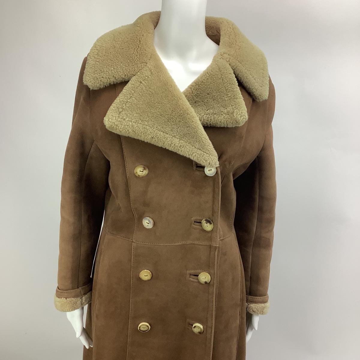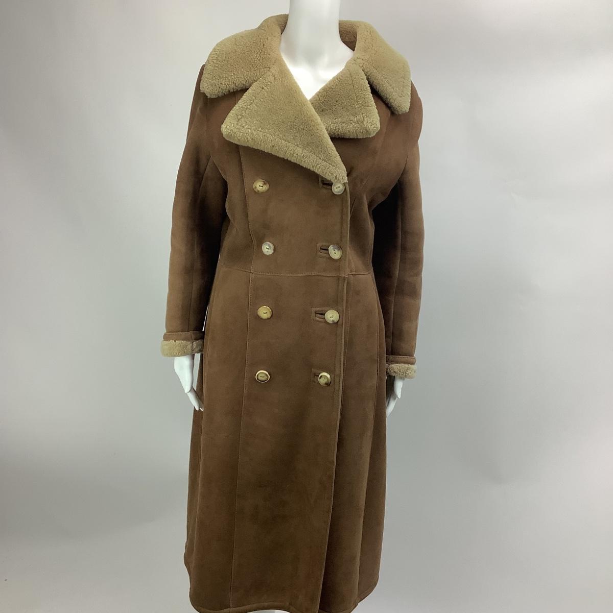 Coat is made in England, size 14, suede brown and lined. the coat is long and double breasted. The coat measures 19" from armpit to armpit and 45" overall length.