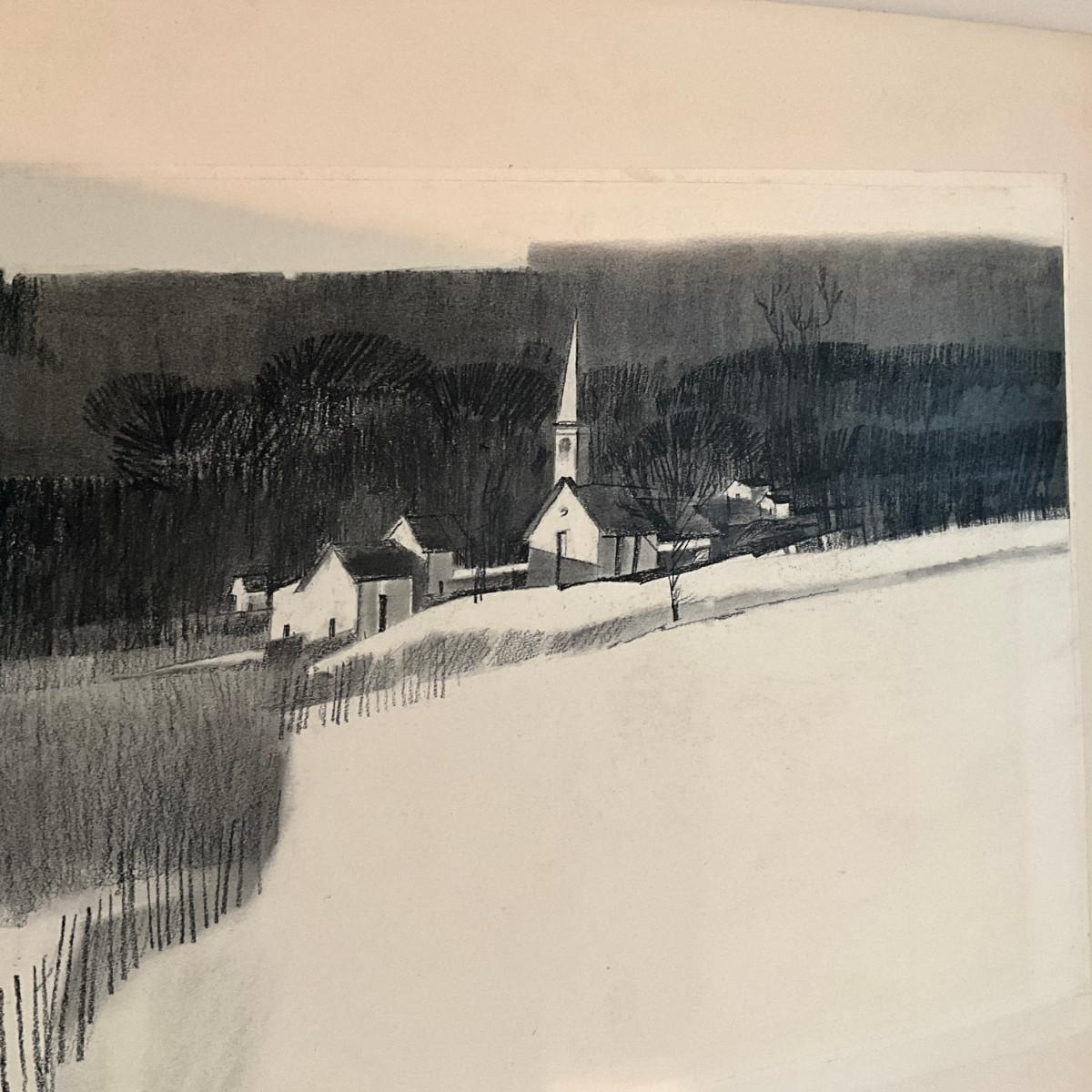 682 Black & White Charcoal & Pen Church Scene Drawing