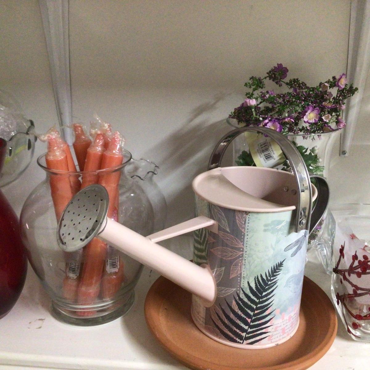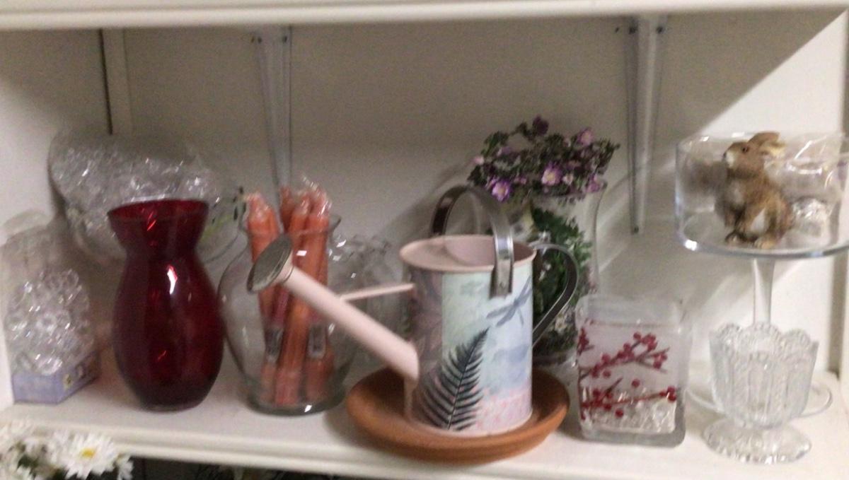 Assorted shelf lot with candles, watering cans, vases and more.